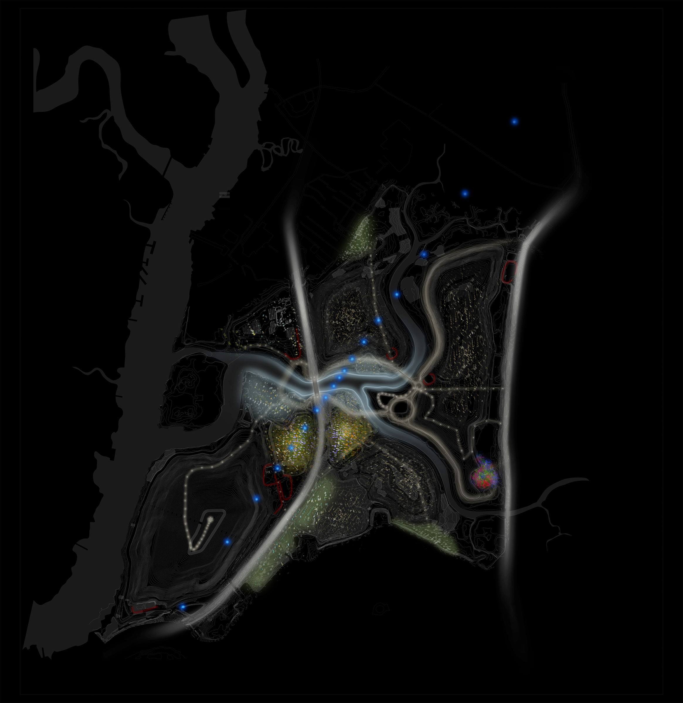 There are three sites facing each other on the Hong Kong Bay linked together with beams of light whenever activity among the buildings coincides. A family of lighting objects, such as bamboo light sticks, floating balloon fixtures, and stone elements provide ambient lighting on various scales. Additionally, architectural elements are lit from within to create a glow.