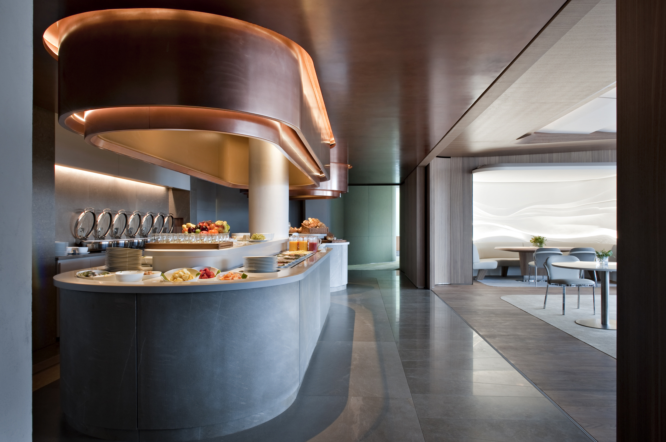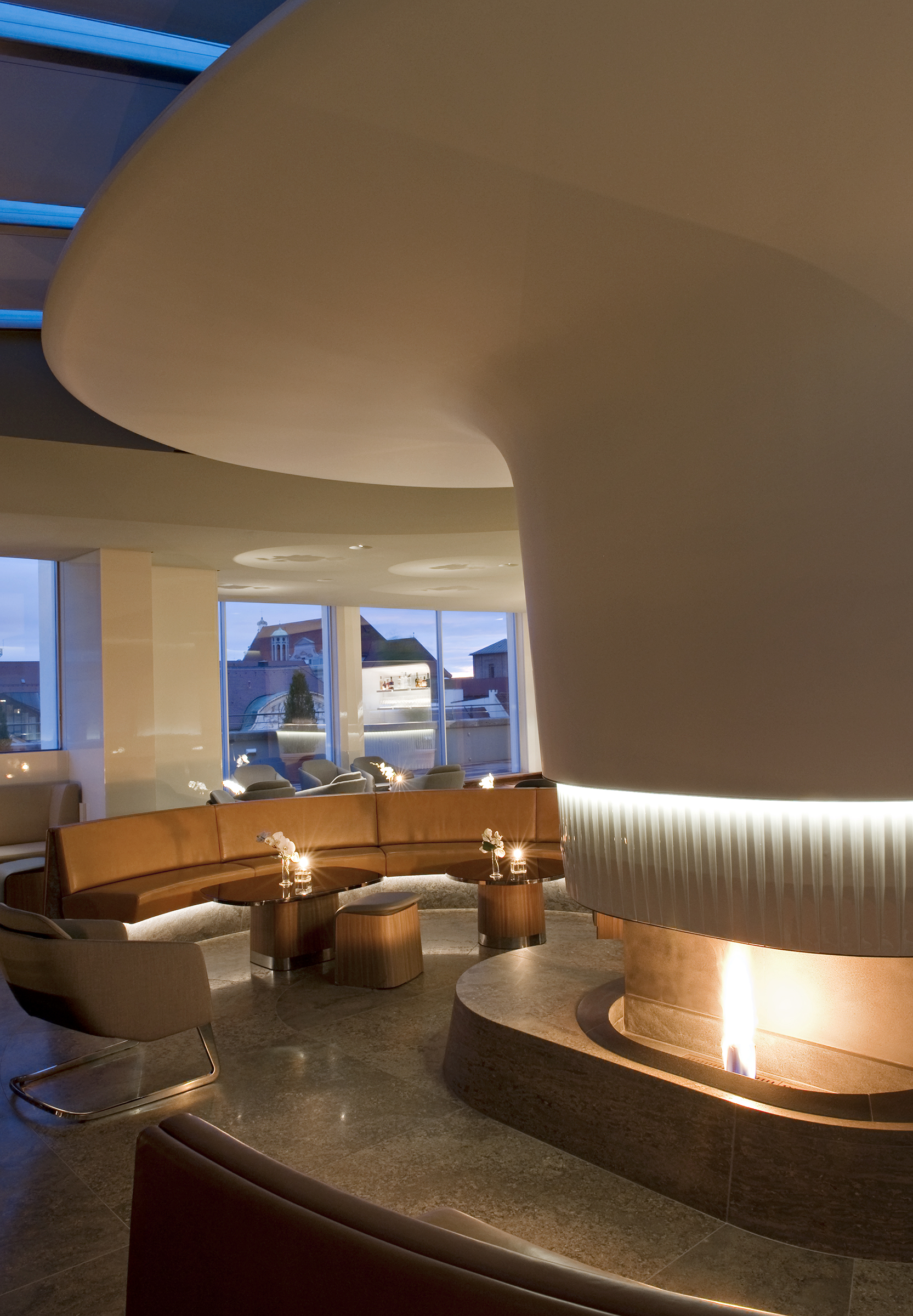 The sumptuous breakfast buffet is presented in the mornings and is transformed into a platform that provides space for art in the evenings. The roofgarden lounge provides a more intimate lighting mood that invites guests to see out their evening by the roaring fireplace.
