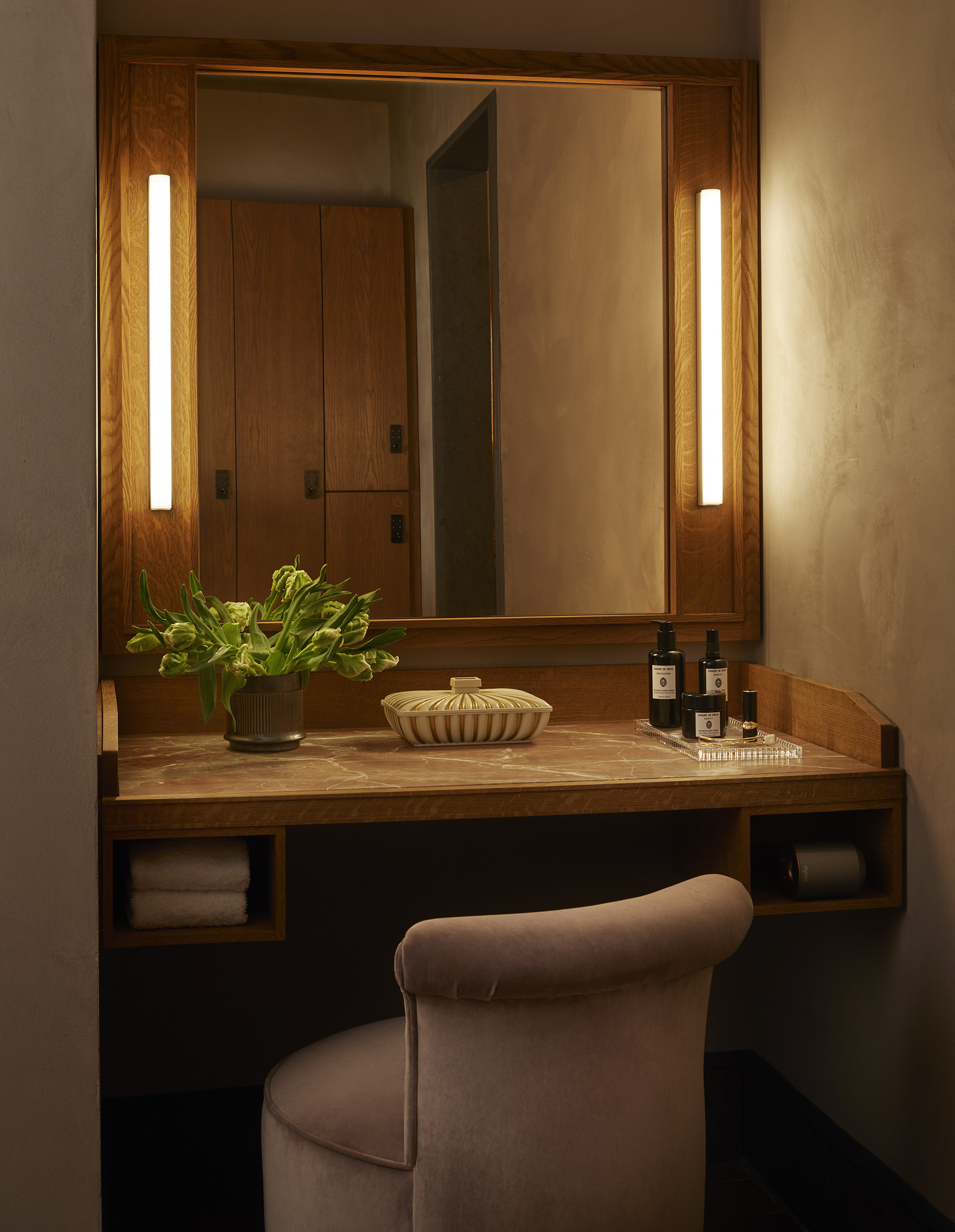 To achieve the desired effect, the design team utilized a primary core layer of light to provide general ambient illumination via indirect fixtures integrated into millwork, which wash surfaces and textures with warm light. In the reception, for example, simple downlights highlight wood materiality, window frames and wainscotting. The fixtures are kept minimal so as not to distract from interior elements and décor. Architectural shelving highlighted by linear LEDs provides accent lighting in the apothecary, which is complemented by decorative vintage wall sconces.