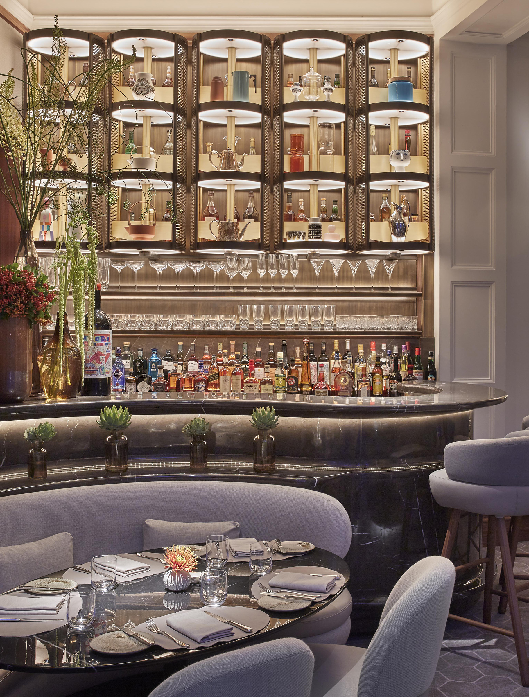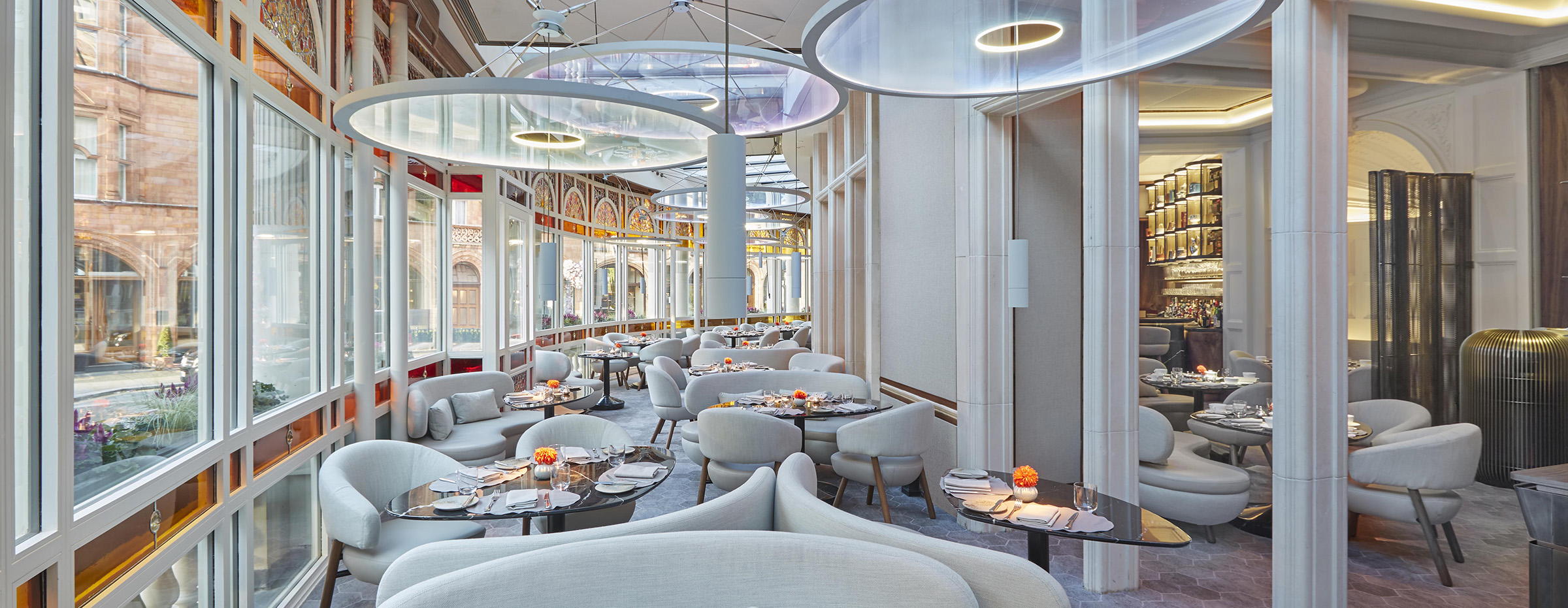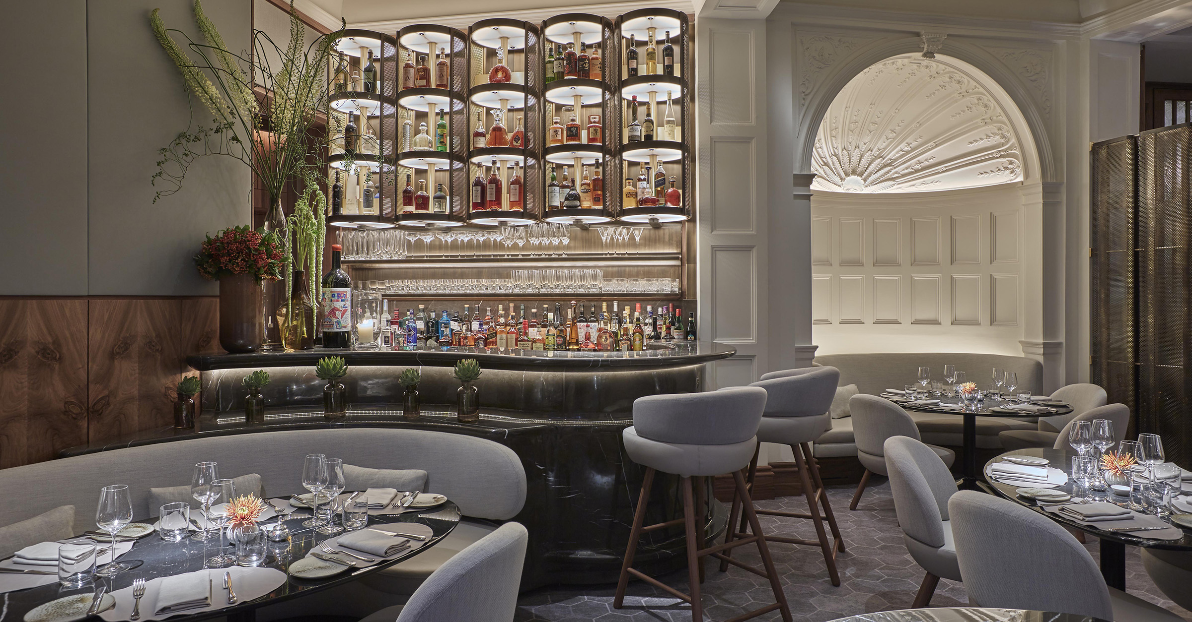 Working within the rich heritage of The Connaught, architect John Heah created a contemporary environment with small tables embraced by soft, rounded seating. L’Observatoire designed a variety of lighting atmospheres to provide an inviting sense of intimacy for each table, and celebrating both the architectural legacy of the building and its new design features.