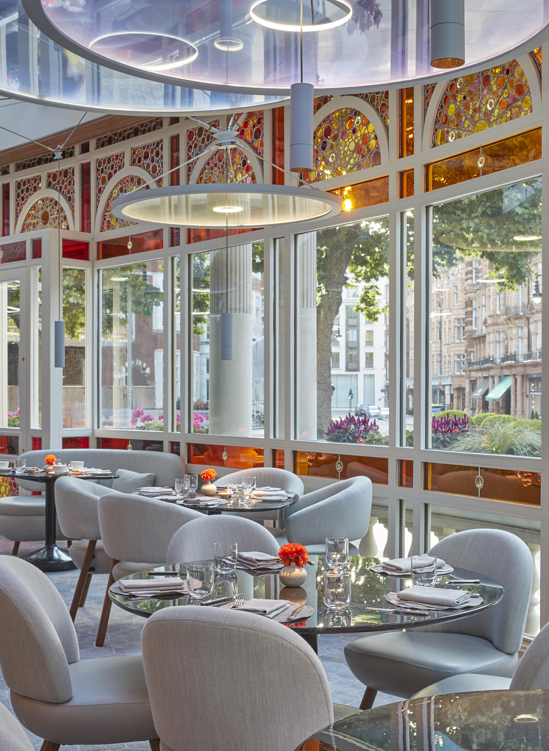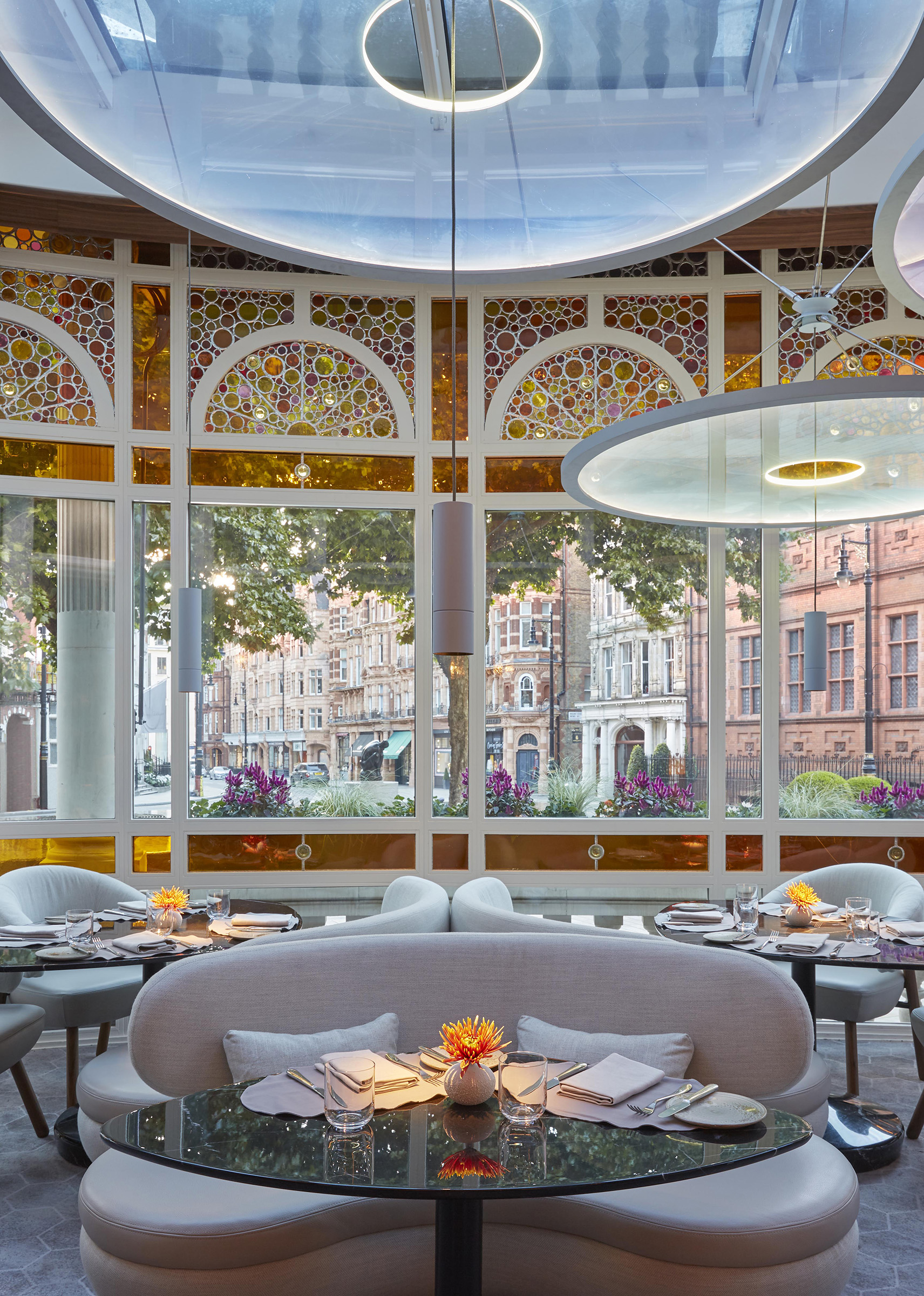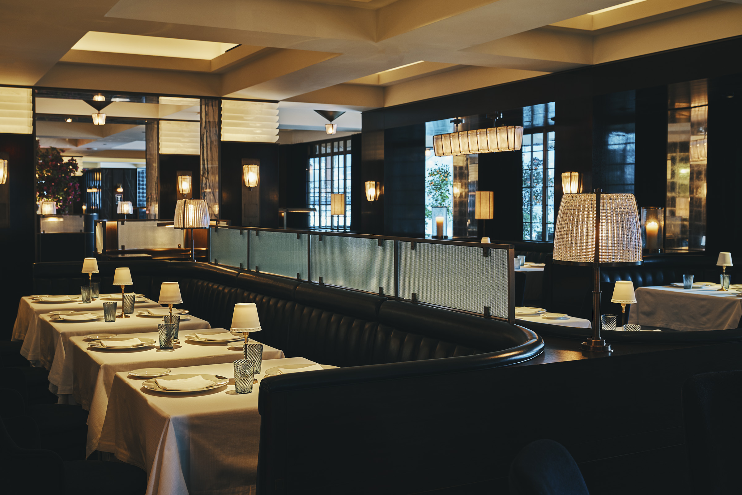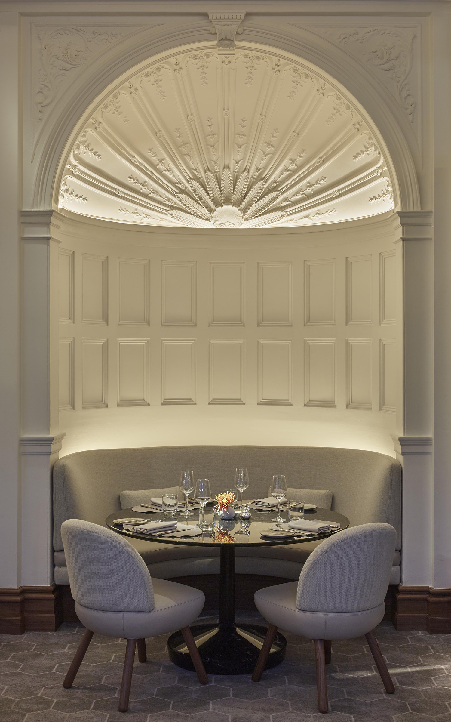 Working within the rich heritage of The Connaught, architect John Heah created a contemporary environment with small tables embraced by soft, rounded seating. L’Observatoire designed a variety of lighting atmospheres to provide an inviting sense of intimacy for each table, and celebrating both the architectural legacy of the building and its new design features.