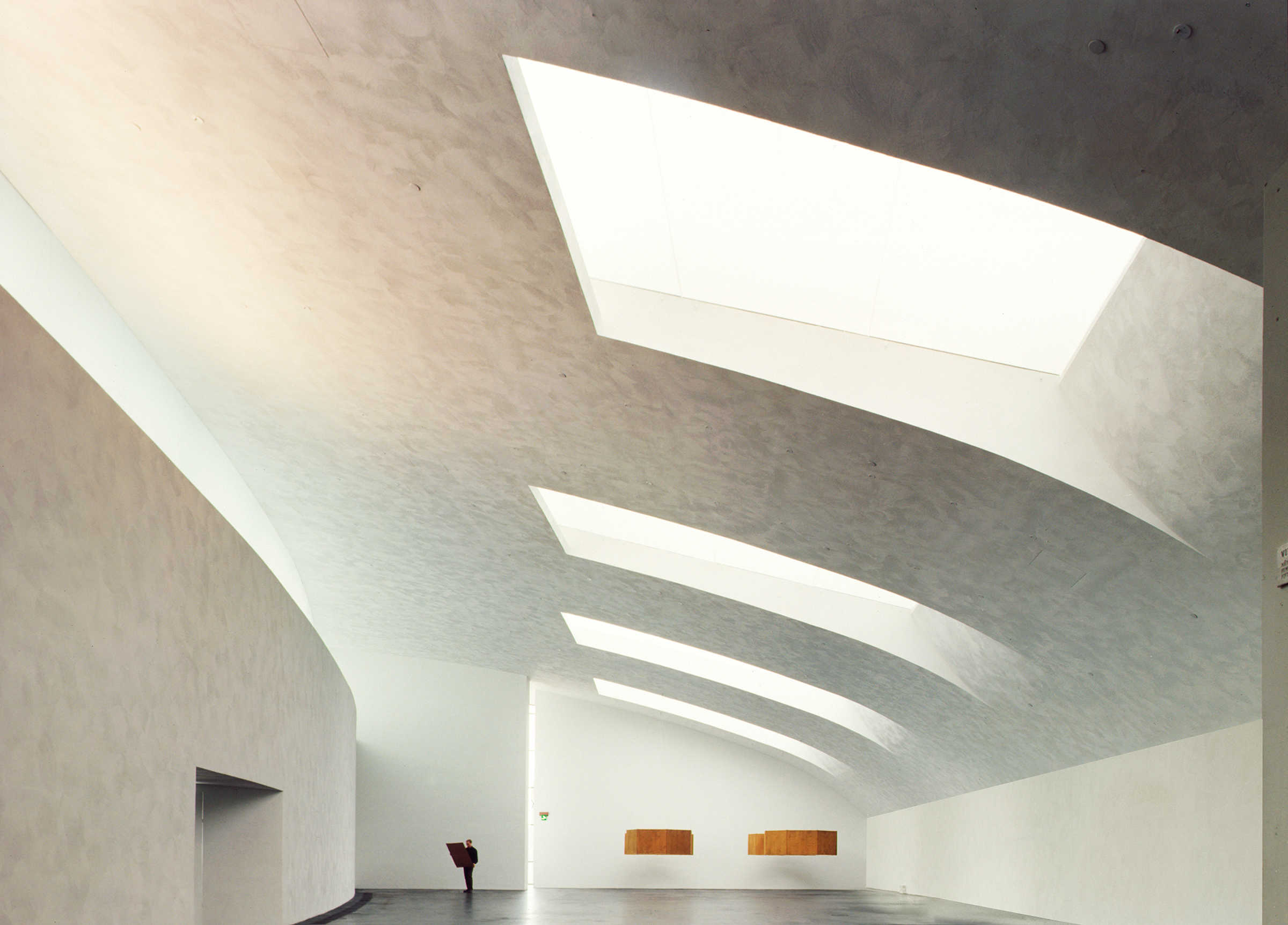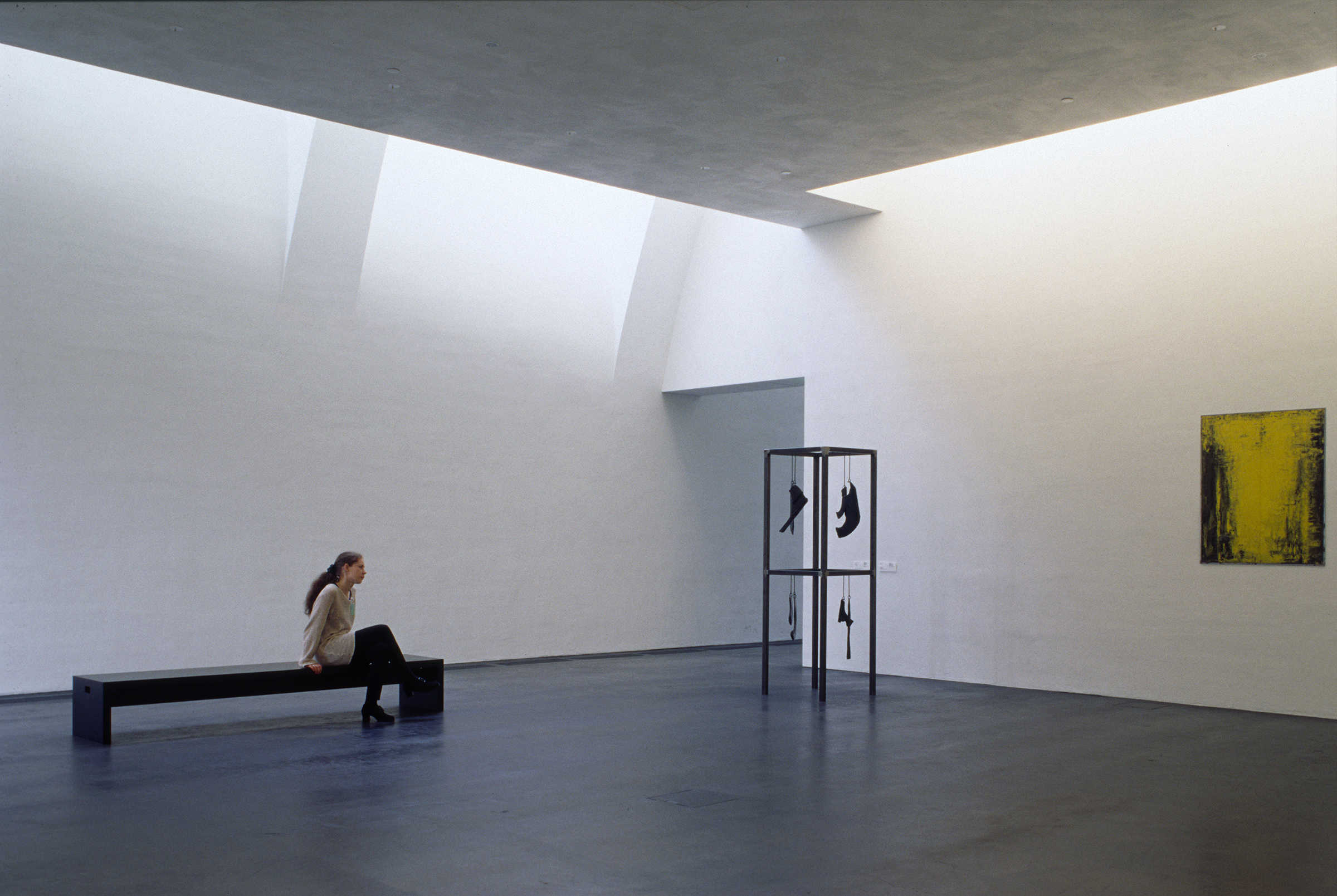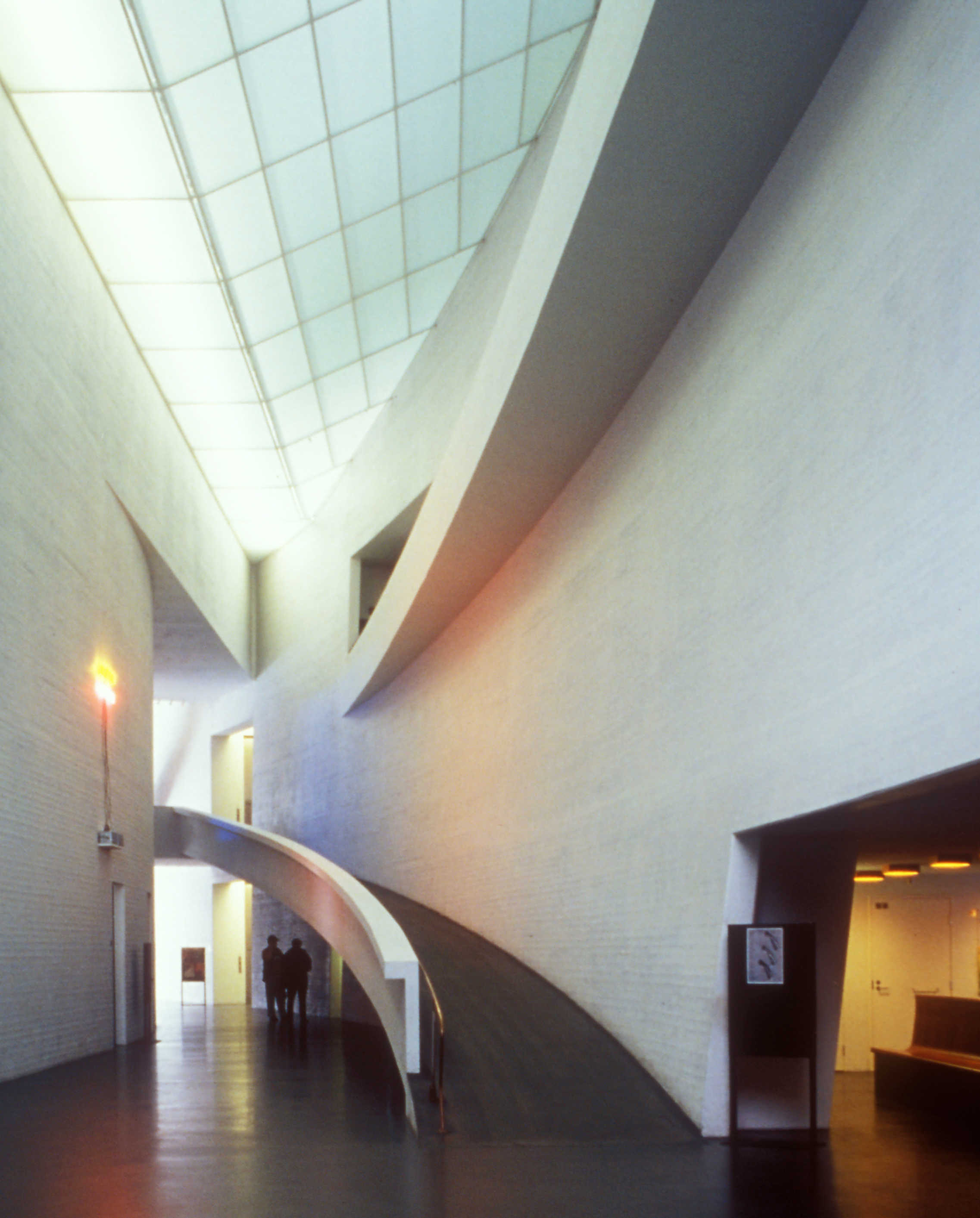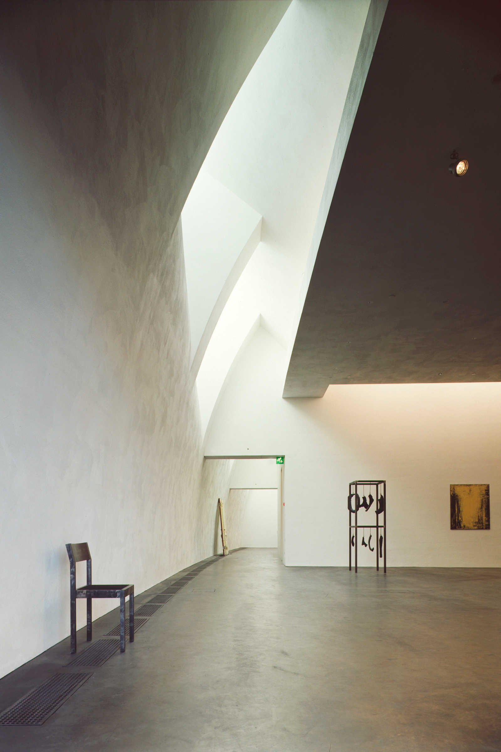 Holl explains that he “considered the range of contemporary artwork and tried to anticipate the needs of a variety of artists, including those whose works depend on a quiet atmosphere to bring out their full intensity.” To maintain this quiet, the galleries had to be free of clutter, meaning most light fixtures had to be hidden in the architecture. Light pockets in the ceiling provide uniform wall illumination, and the ambient light in the gallery spaces achieves a general lighting of the neutral walls with an imperceptible light source. The artificial lighting was designed to blend with and complement the daylighting without being obtrusive. A few removable spots were placed in strategic locations not just to allow not flexibility for lighting temporary exhibits but also to create accentuated contrasts and add relief. In the public spaces, visible lighting fixtures were employed to offer a contrast with the objectless lighting in the galleries.