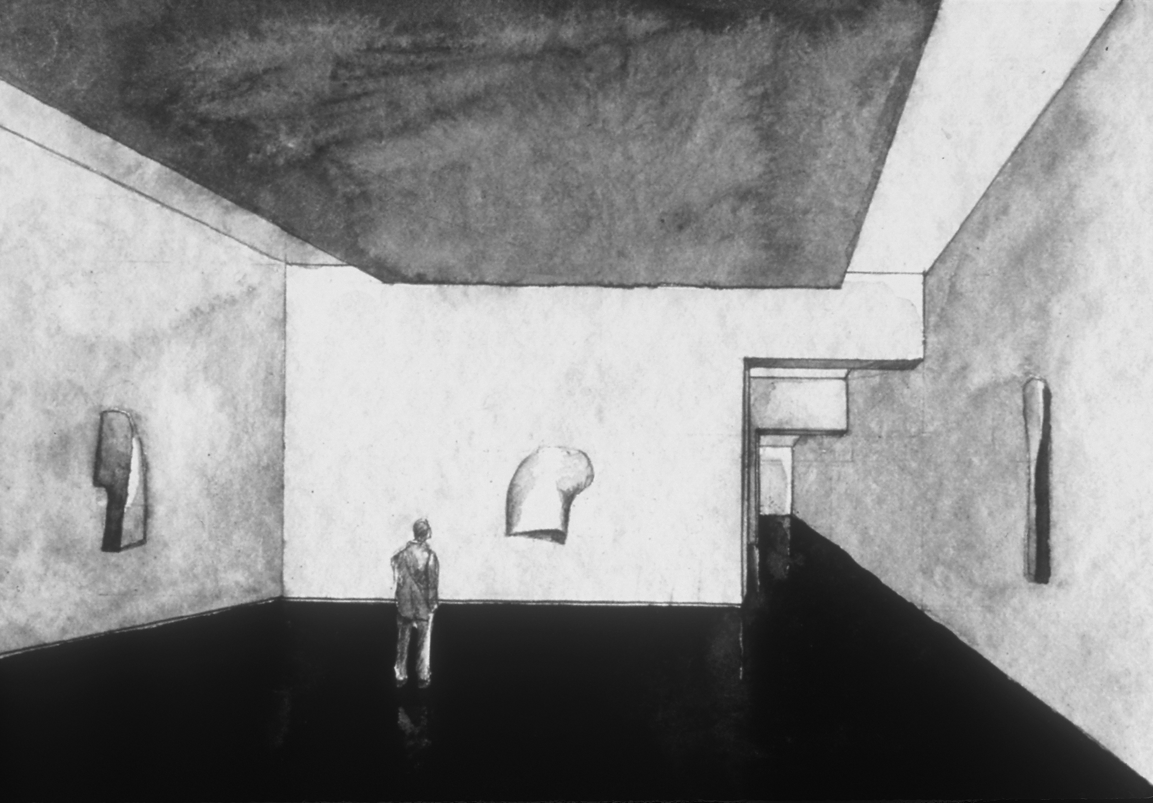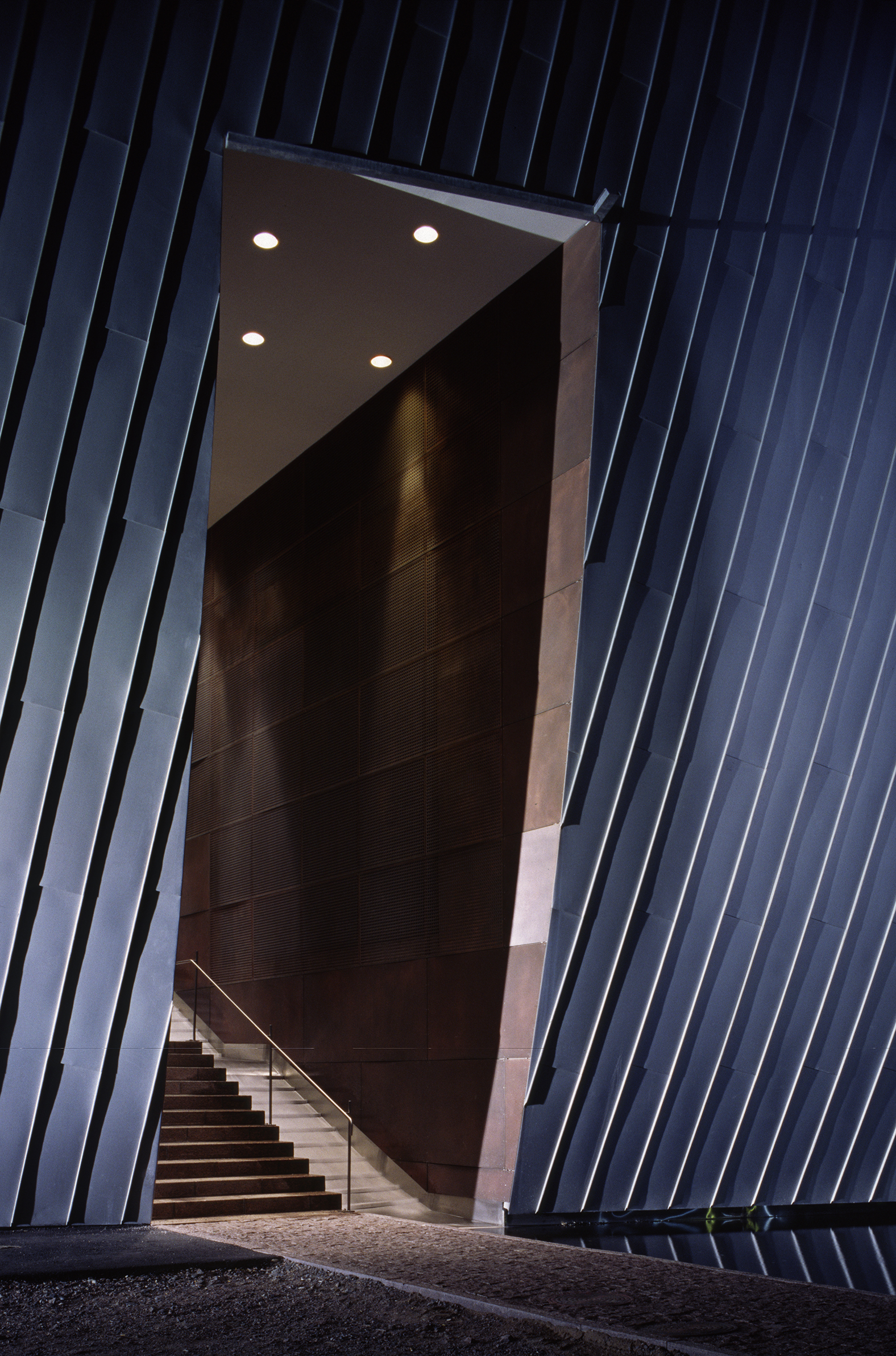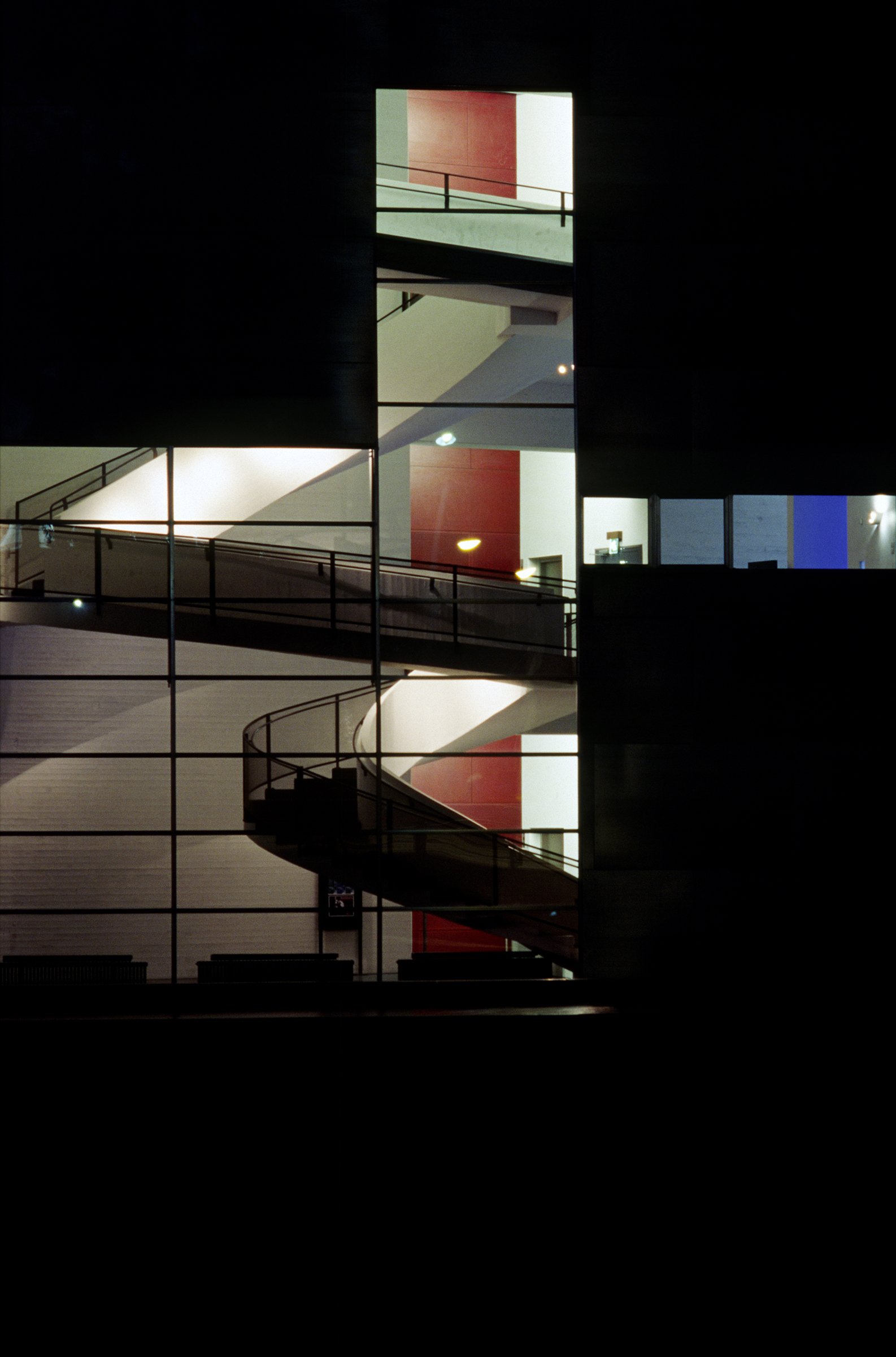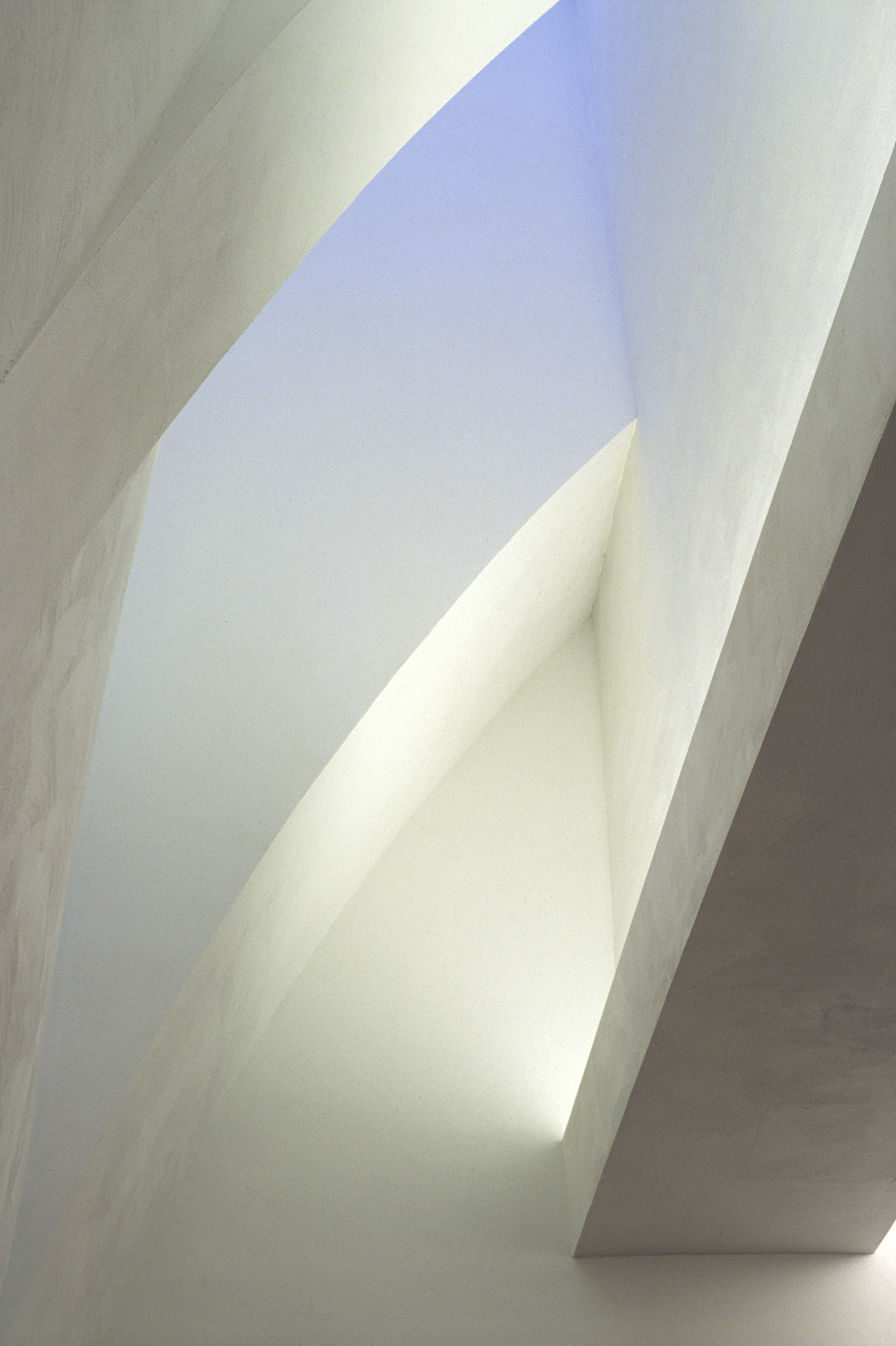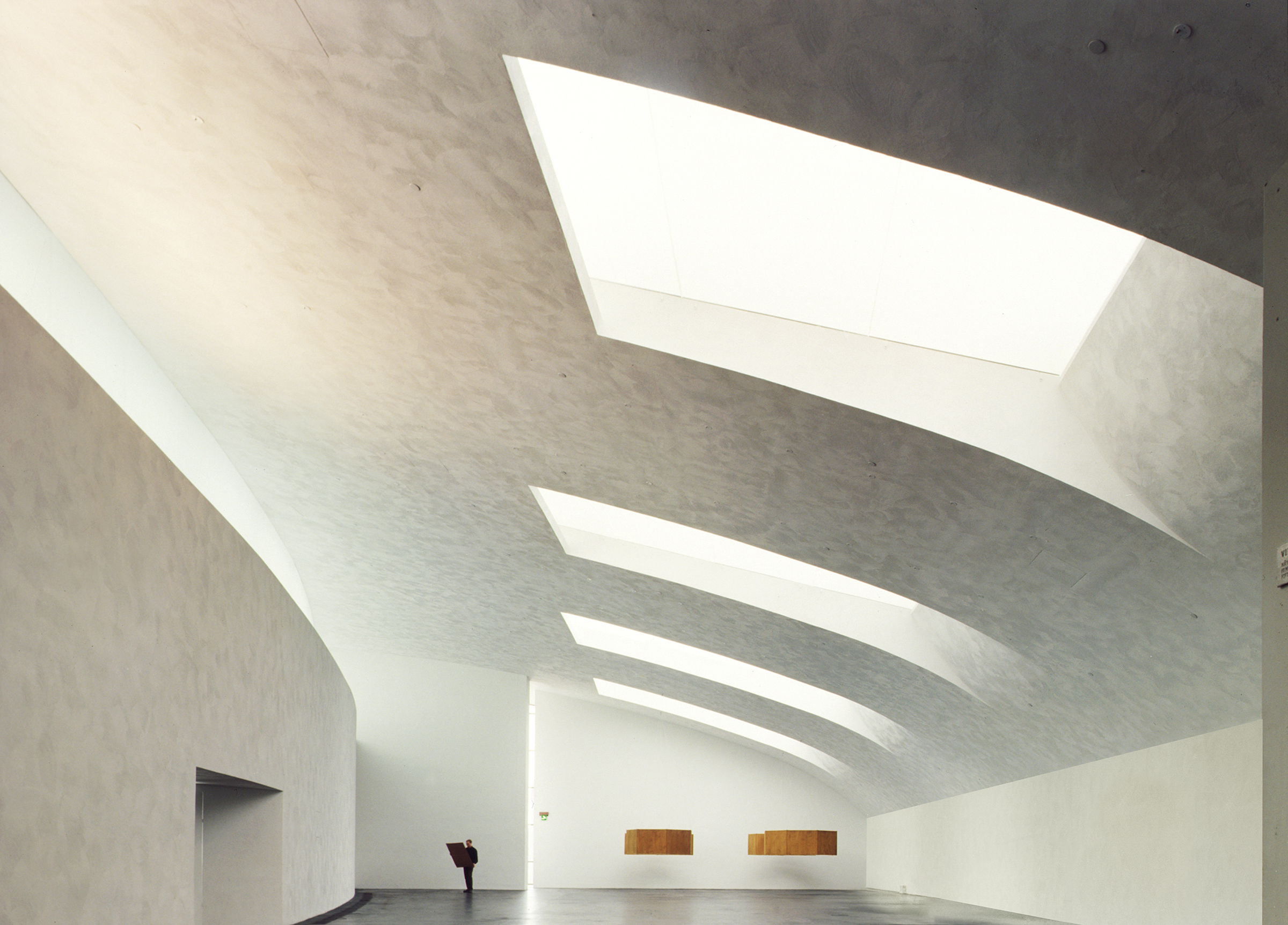 Holl explains that he “considered the range of contemporary artwork and tried to anticipate the needs of a variety of artists, including those whose works depend on a quiet atmosphere to bring out their full intensity.” To maintain this quiet, the galleries had to be free of clutter, meaning most light fixtures had to be hidden in the architecture. Light pockets in the ceiling provide uniform wall illumination, and the ambient light in the gallery spaces achieves a general lighting of the neutral walls with an imperceptible light source. The artificial lighting was designed to blend with and complement the daylighting without being obtrusive. A few removable spots were placed in strategic locations not just to allow not flexibility for lighting temporary exhibits but also to create accentuated contrasts and add relief. In the public spaces, visible lighting fixtures were employed to offer a contrast with the objectless lighting in the galleries.