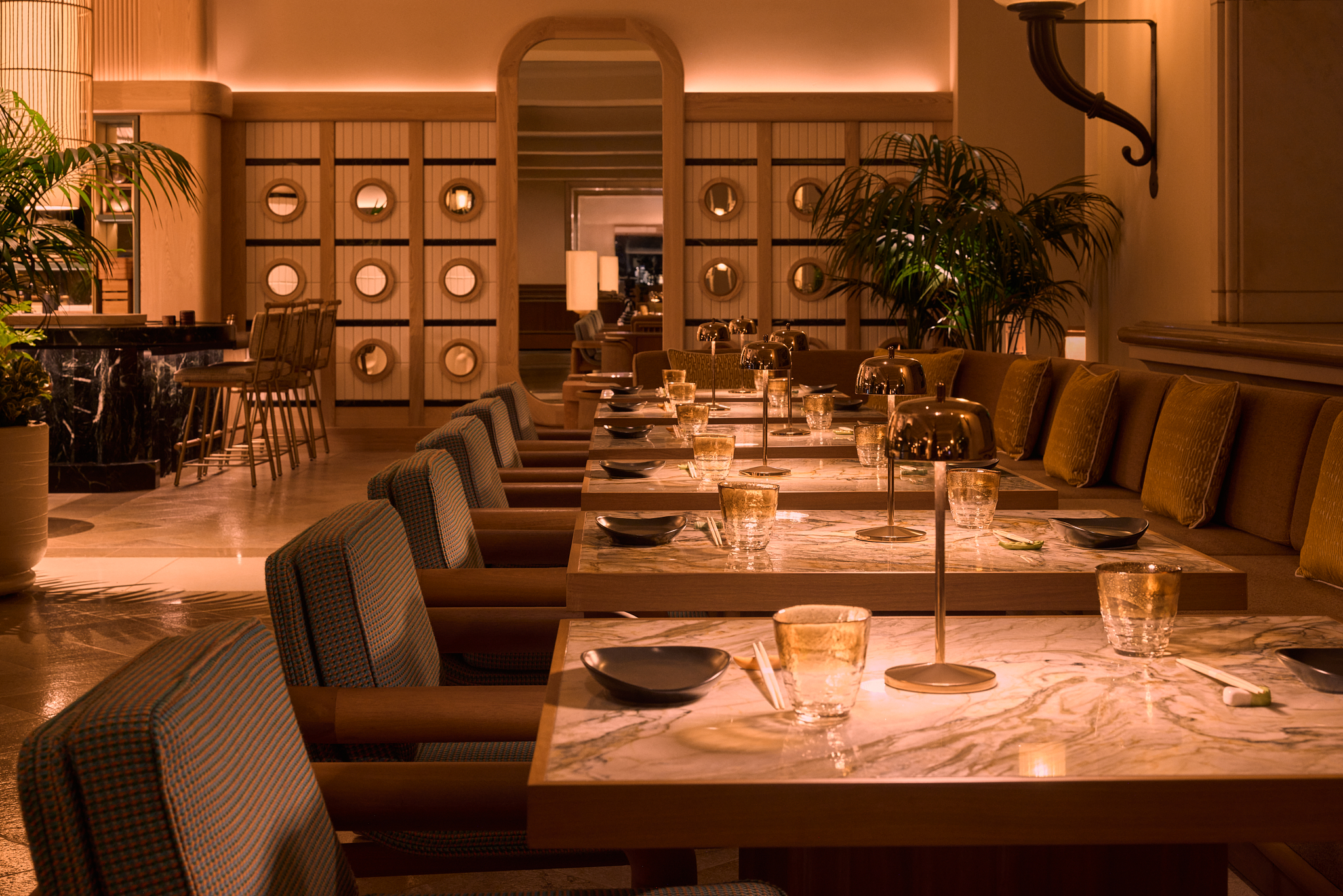 The thoughtful design by L'Observatoire International's lighting concept bathes the restaurant in warm golden hour tones.