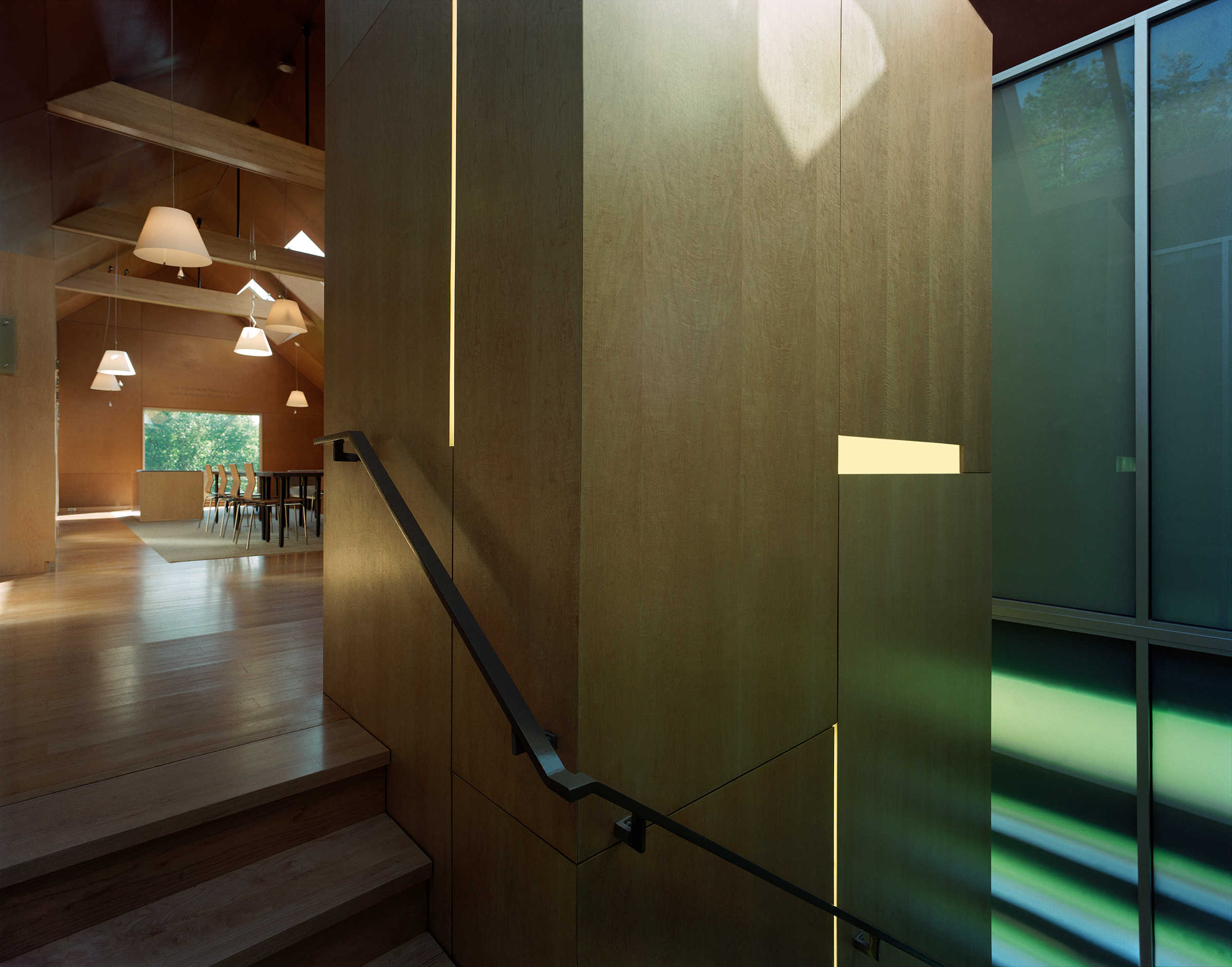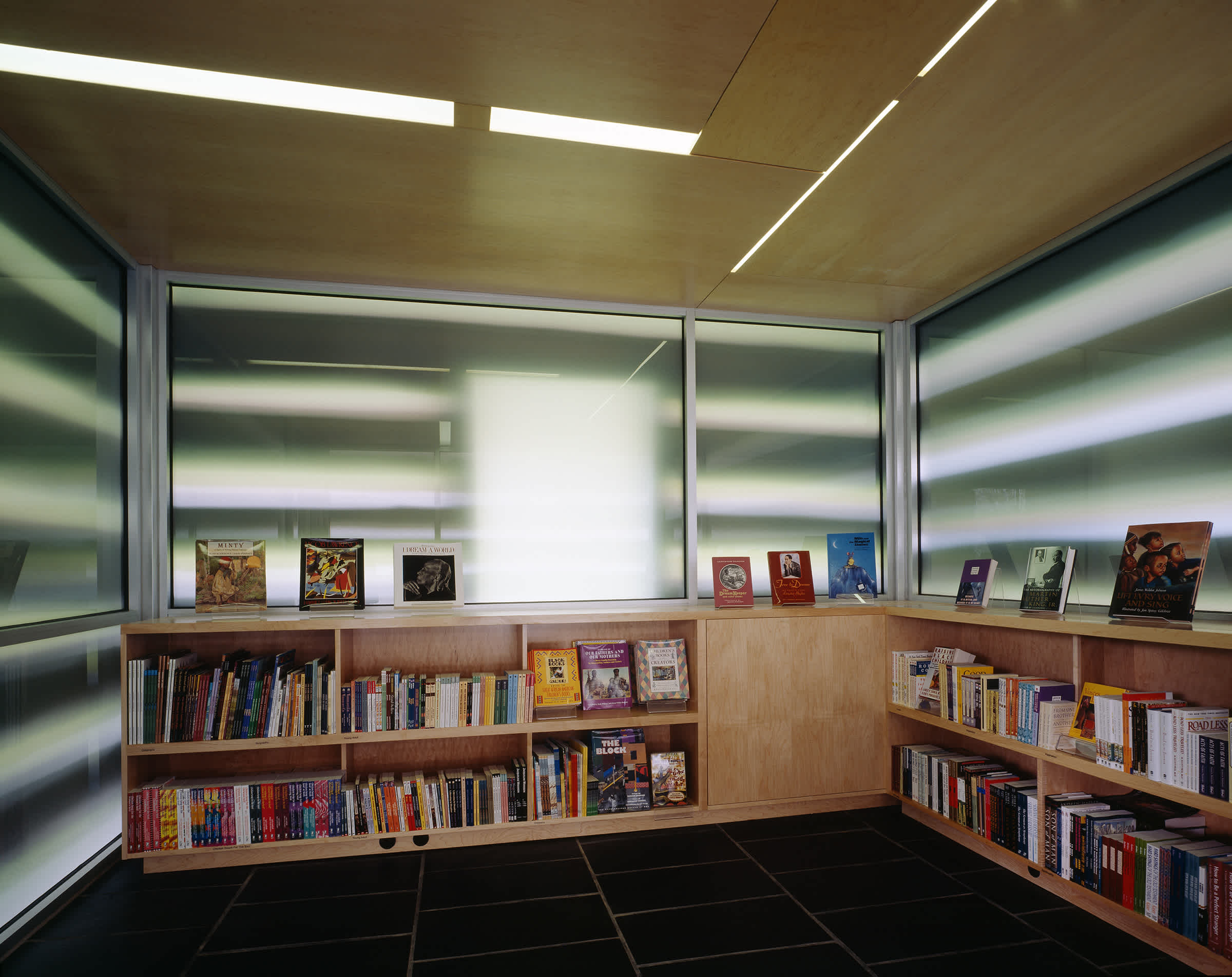 Lighting emphasizes the reflective atmosphere of the library by architect Maya Lin. Diffuse light and lights embedded inside of the walls create shadow, further accentuated with warm light.
