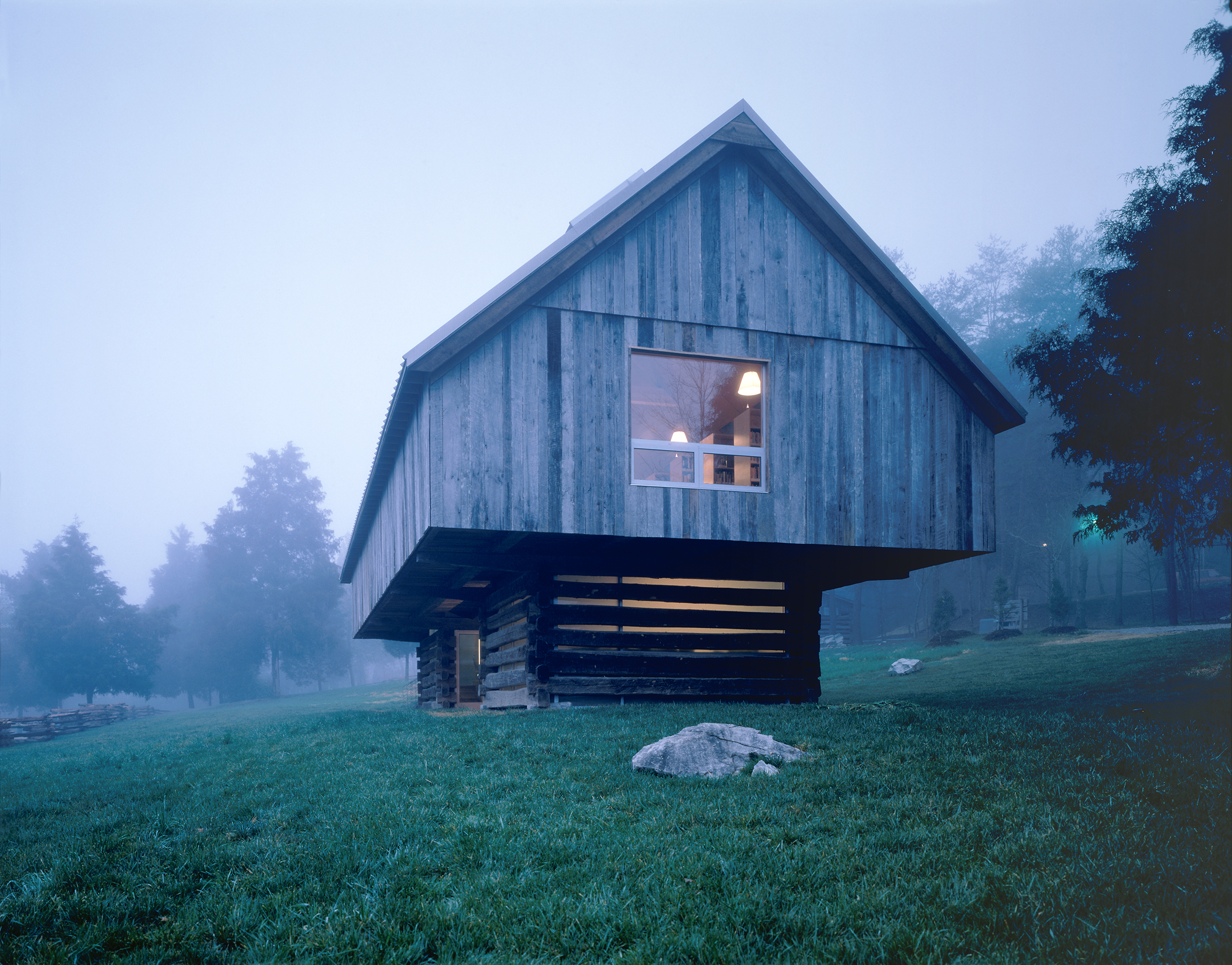 A new library and gift shop were built into an existing cantilevered barn structure, maintaining the integrity of the existing structure while slipping an inner skin inside.