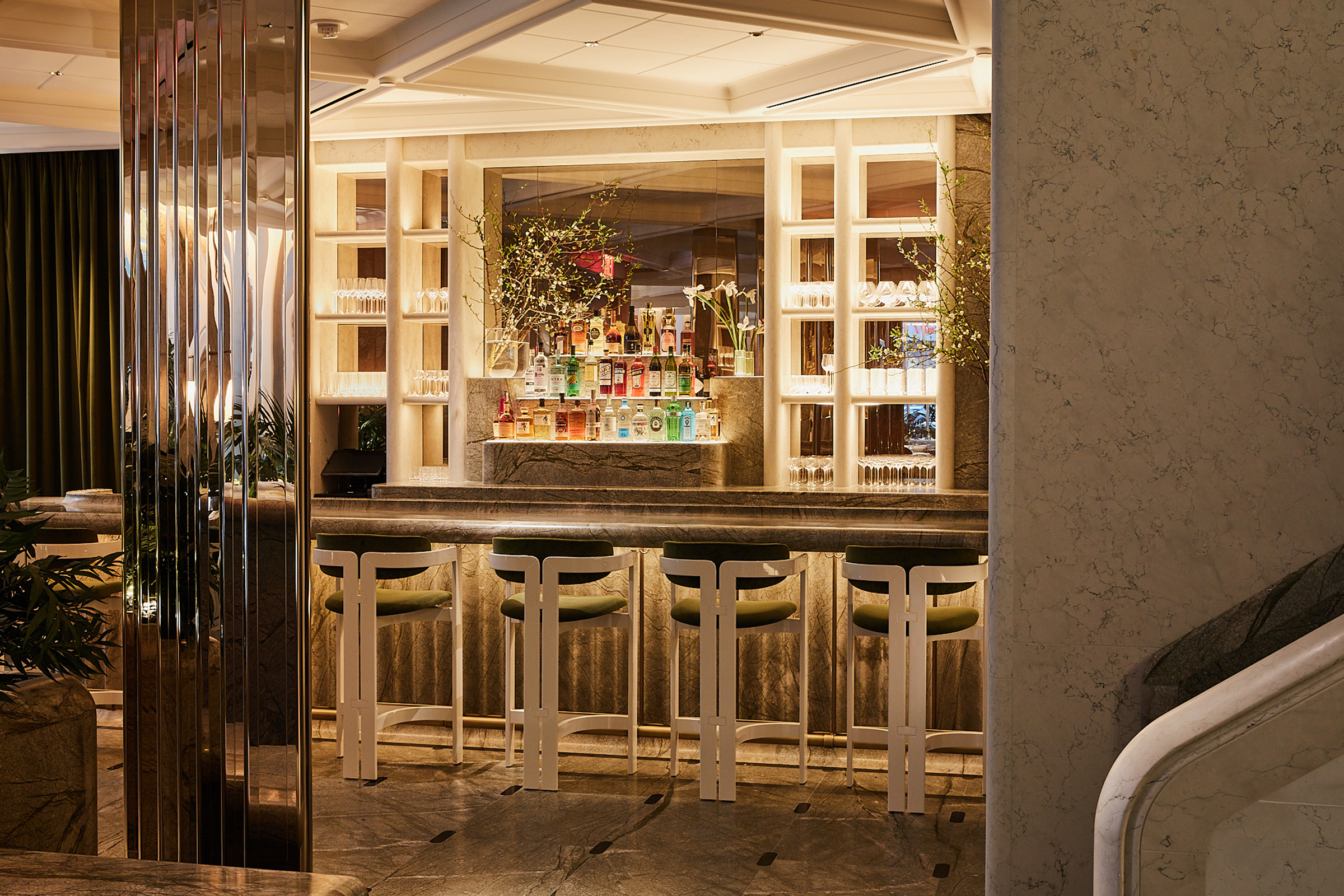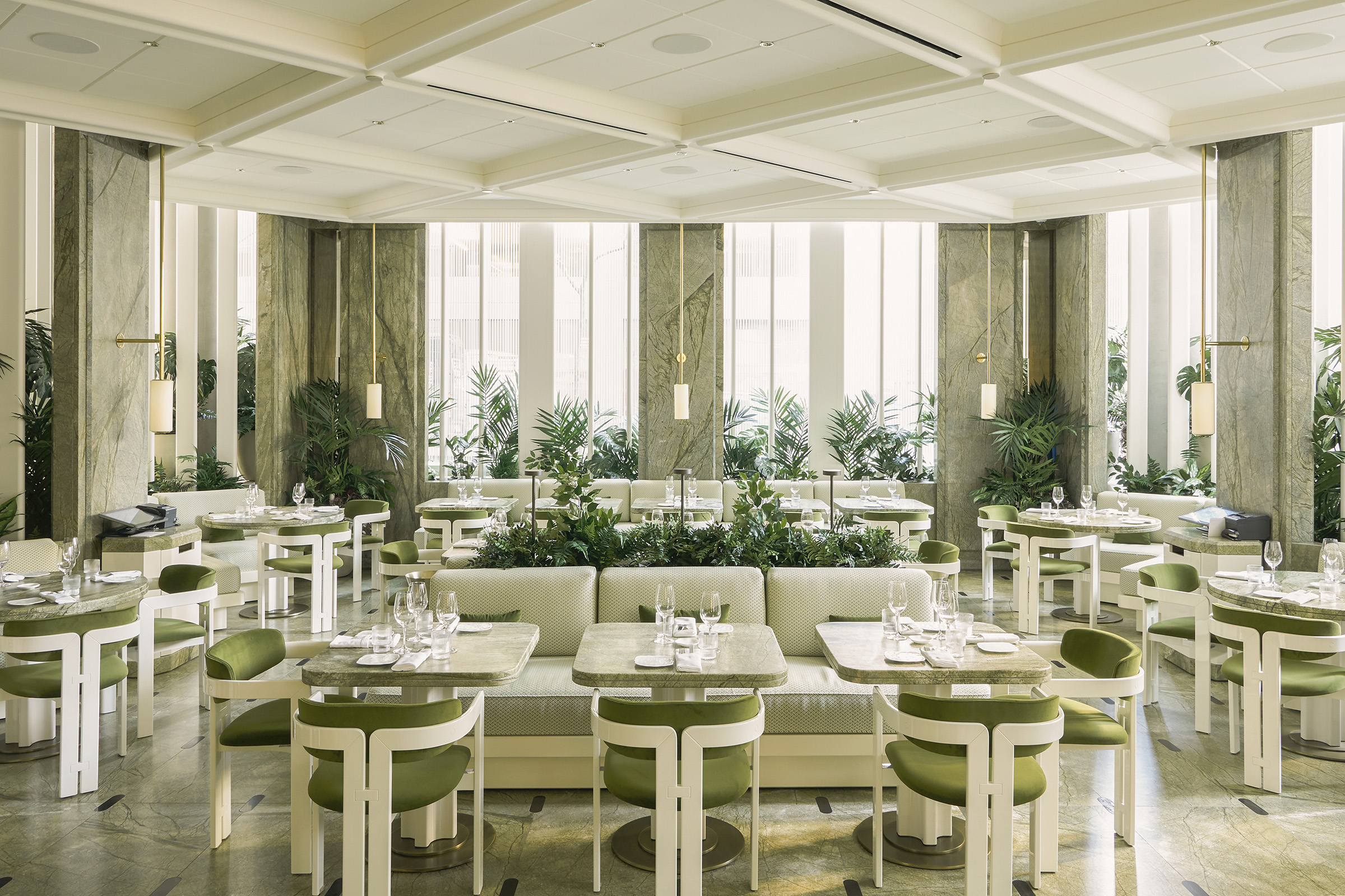 The modern, light-filled space is a journey into a serene lush indoor garden. Interior elements are one-of-a-kind, with unique green-marble walls and floors, custom made furntire, and a composition of plants and vertical louvers adorning the floor to ceiling windows to match the vegetable-driven menu.