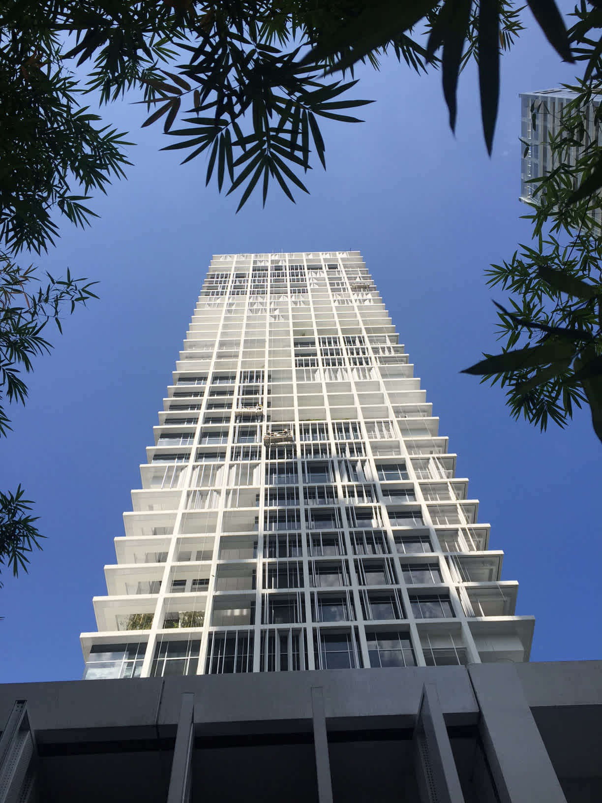Architect Jean Nouvel’s concept of elevated bungalows draws the horizontal landscape up into the verticality of the towers, promoting a unique conceptualization of vertical living that reflects the comfort and intimacy of a spacious home immersed in nature. The tower is a parallelepiped on a square base that rises from the natural landscape of water and bamboos and is oriented to maximize distant views. Its complexity comes from the interior: the variation between floors, the use of sky gardens and the movement of turning facade panels in a delicate combination of pure white monochromatic shape encroached by bamboo.