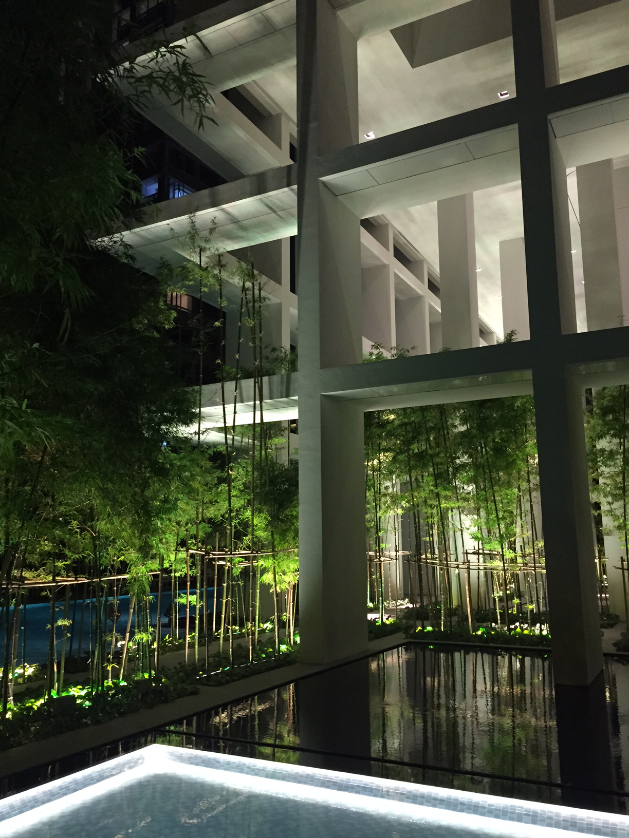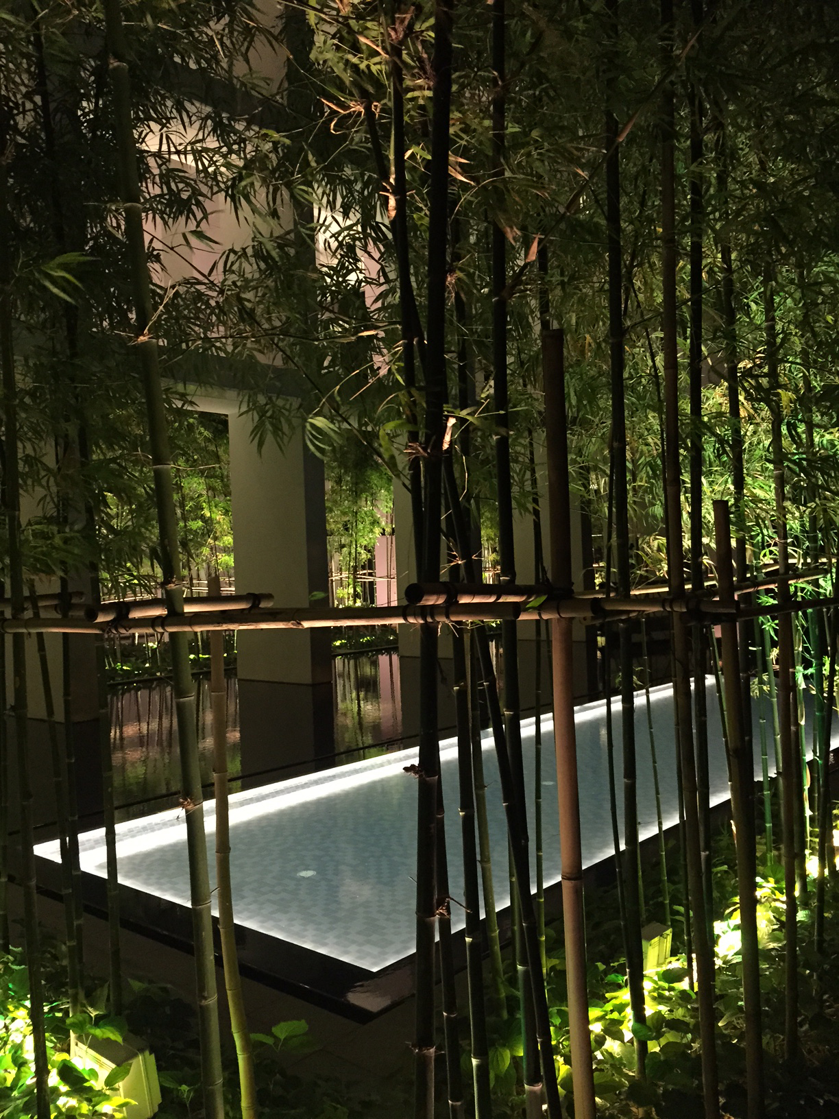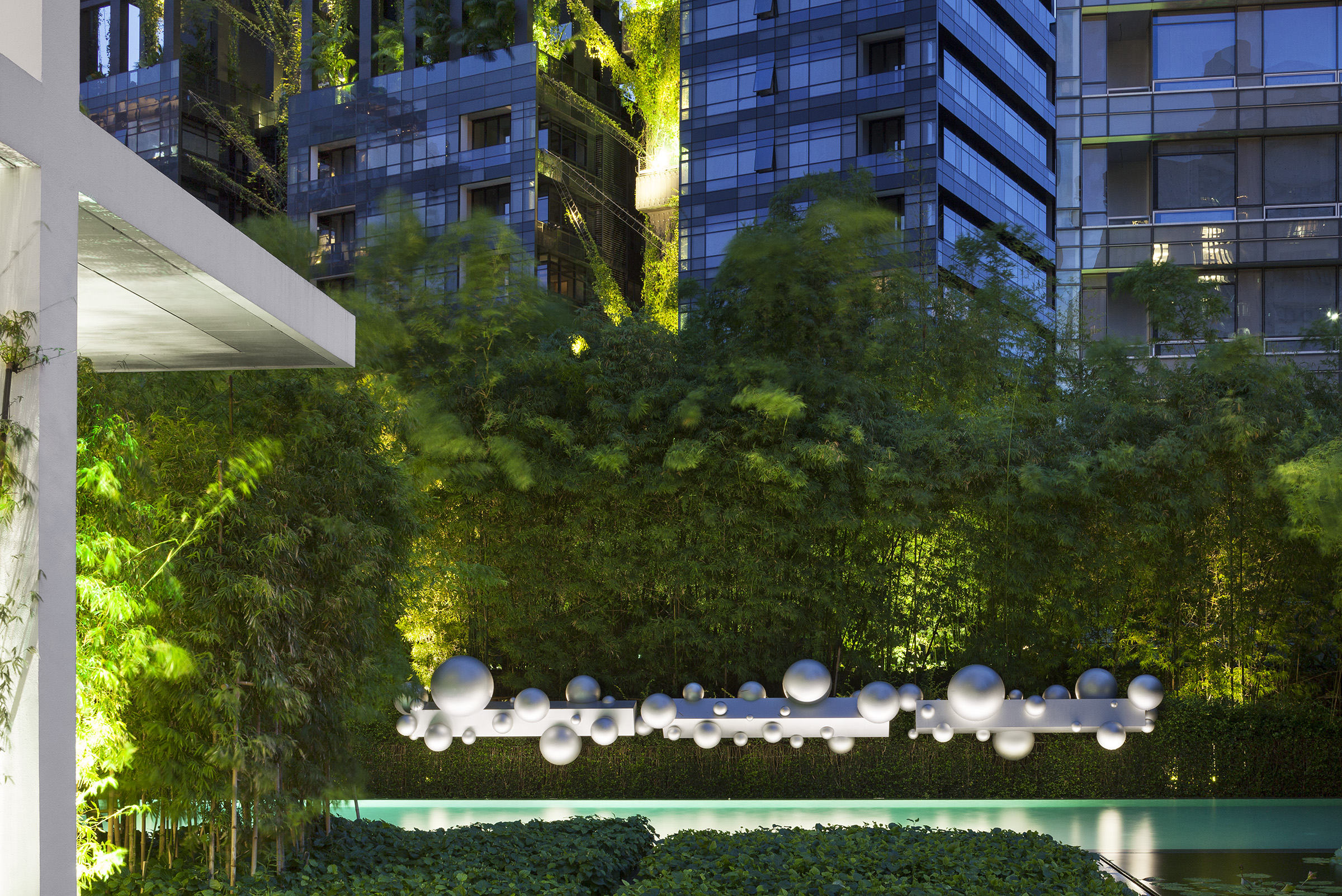 Combining cutting-edge use of color LEDs and custom-designed fixtures, Descottes has helped create another wholly original addition to Singapore’s cityscape, promoting a unique conceptualization of vertical living. Innovative color blends highlight the bamboo-filled terrace gardens flourishing throughout the interior of the residence. The seamless progression of luminance upwards intensifies the texture of the foliage with luscious color saturation while drawing the eye upwards and accentuating the verticality of the landscape.