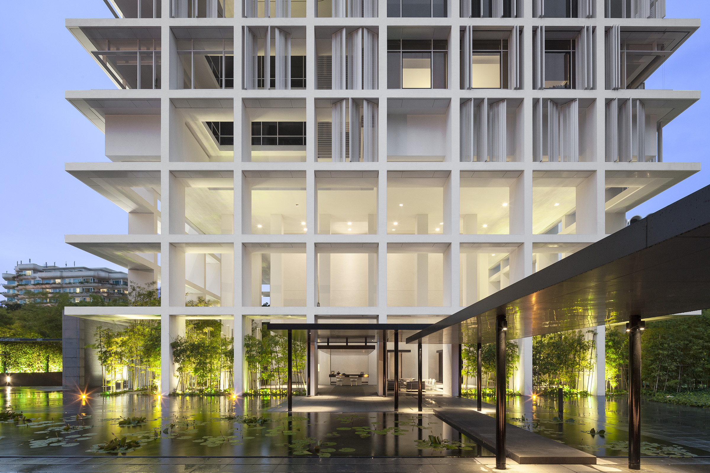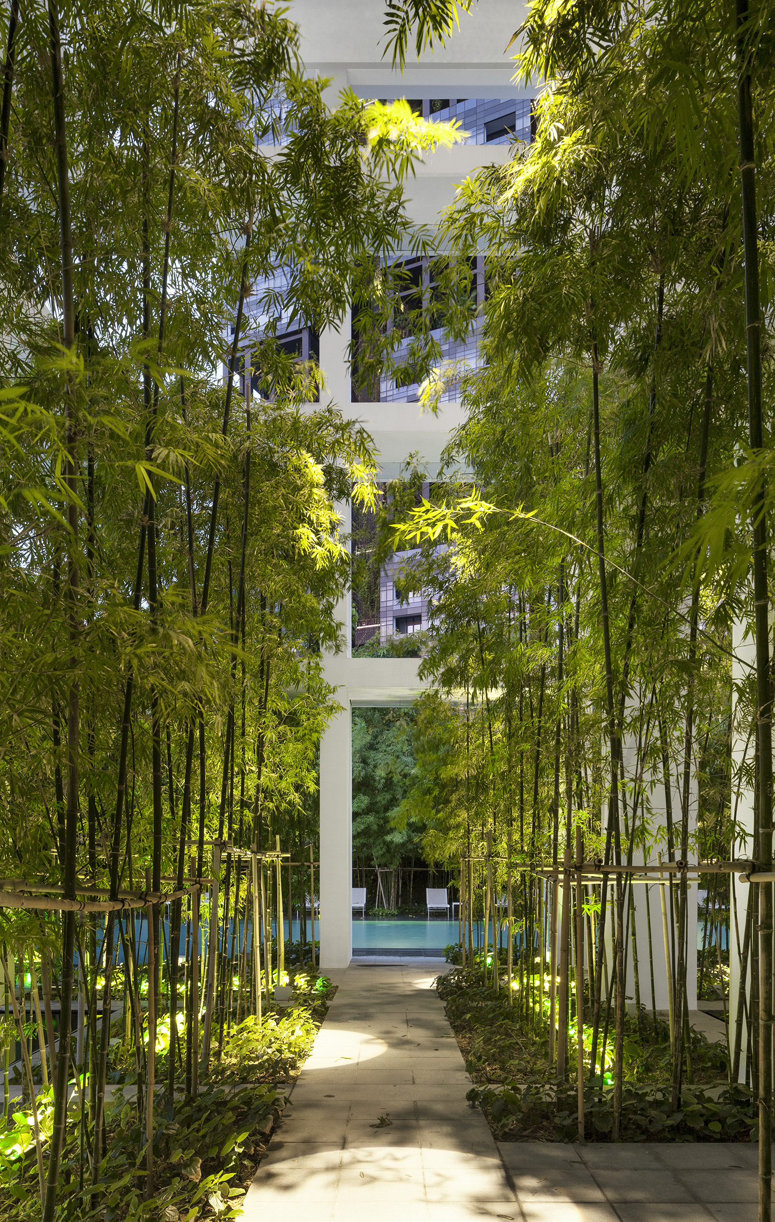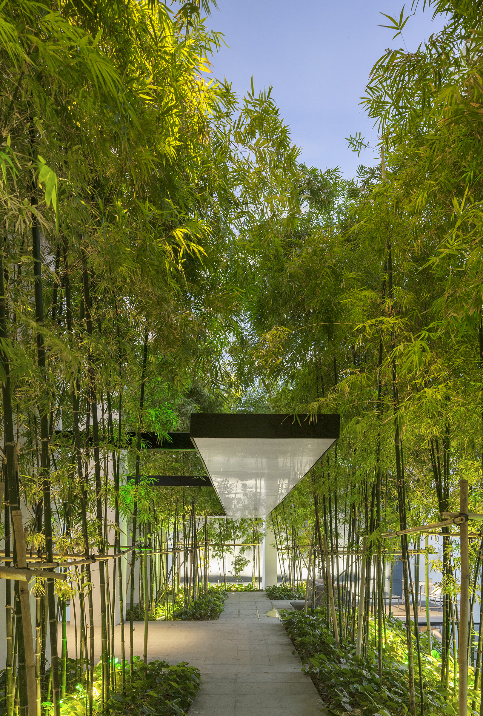 Architect Jean Nouvel’s concept of elevated bungalows draws the horizontal landscape up into the verticality of the towers, promoting a unique conceptualization of vertical living that reflects the comfort and intimacy of a spacious home immersed in nature. The tower is a parallelepiped on a square base that rises from the natural landscape of water and bamboos and is oriented to maximize distant views. Its complexity comes from the interior: the variation between floors, the use of sky gardens and the movement of turning facade panels in a delicate combination of pure white monochromatic shape encroached by bamboo.