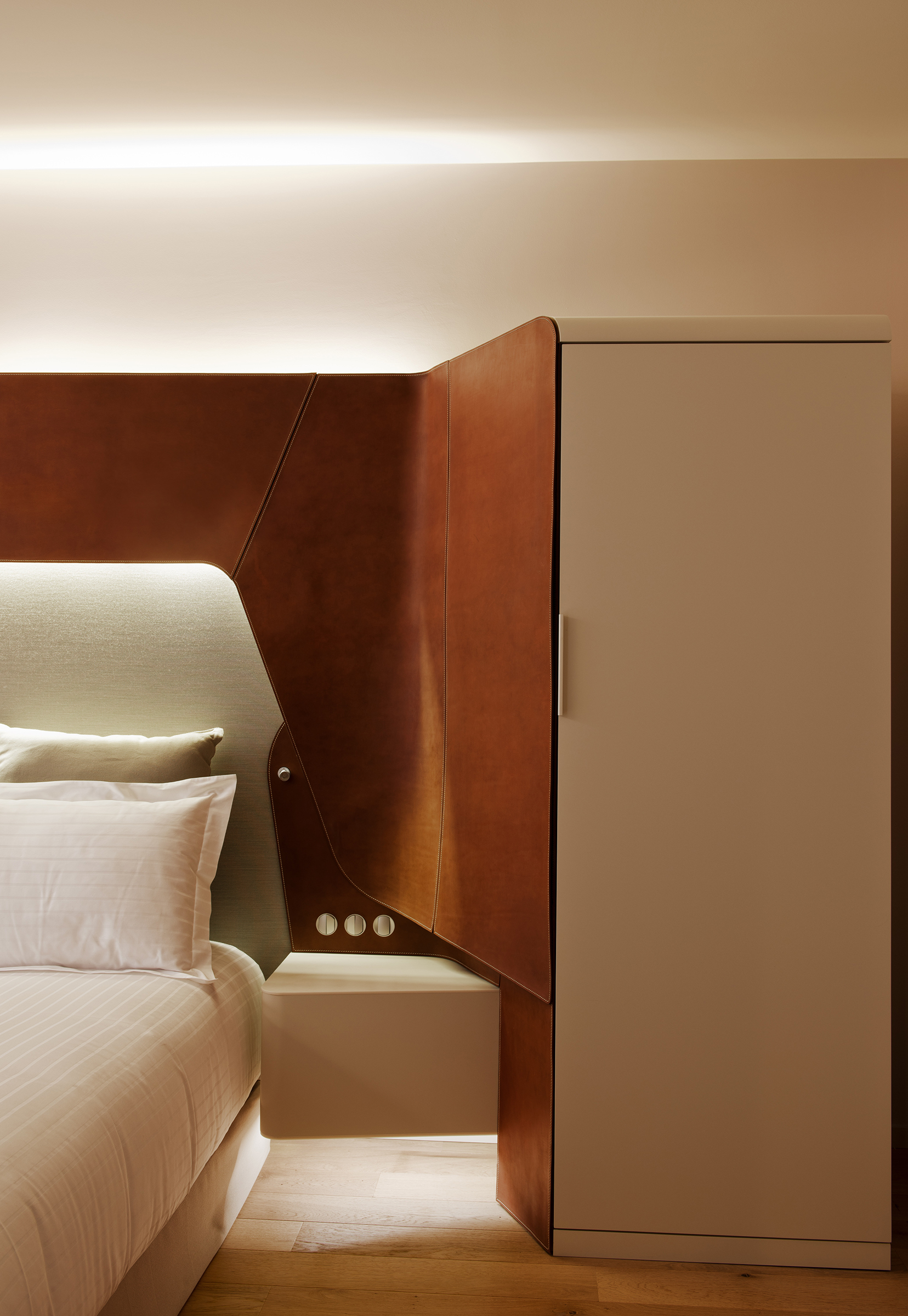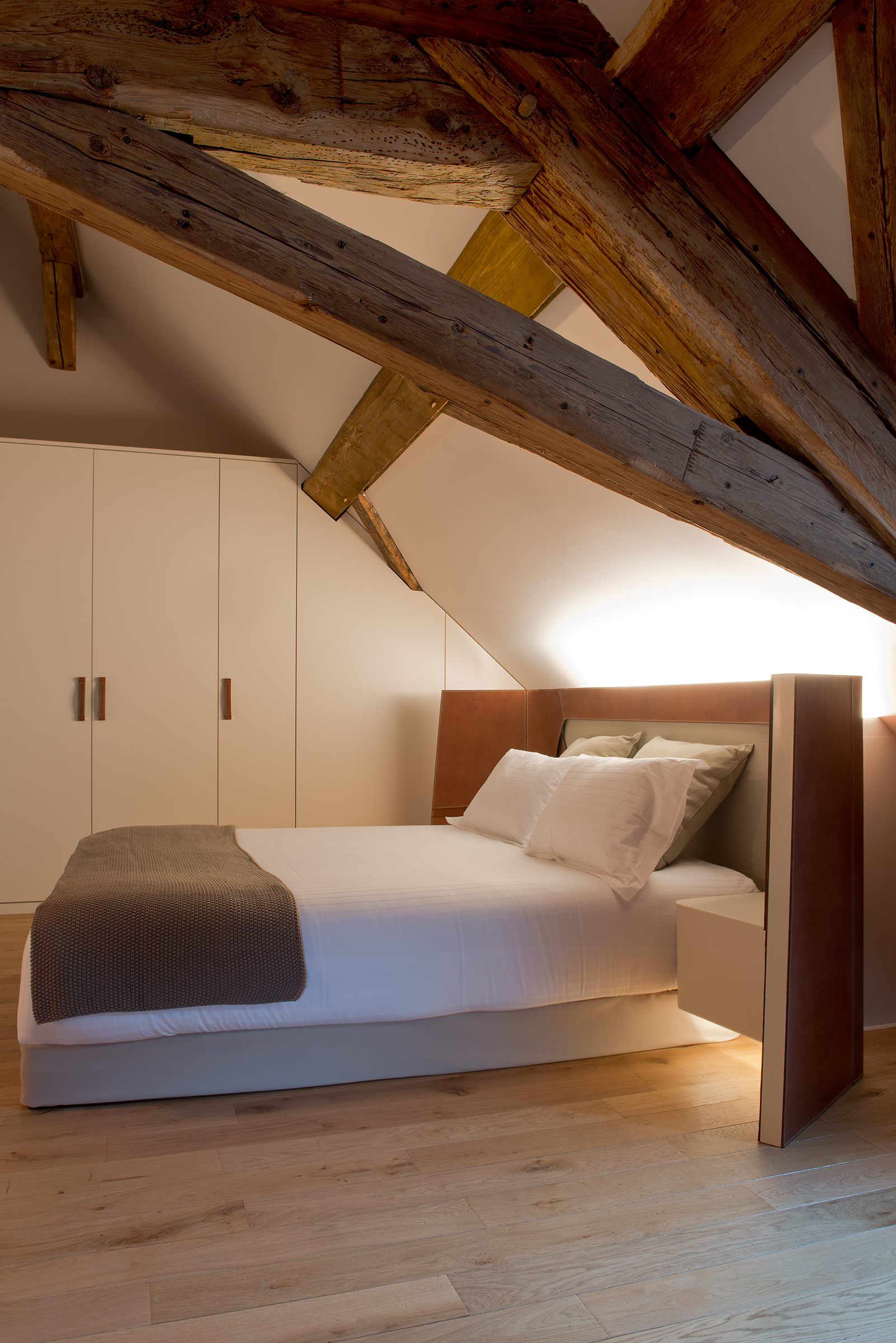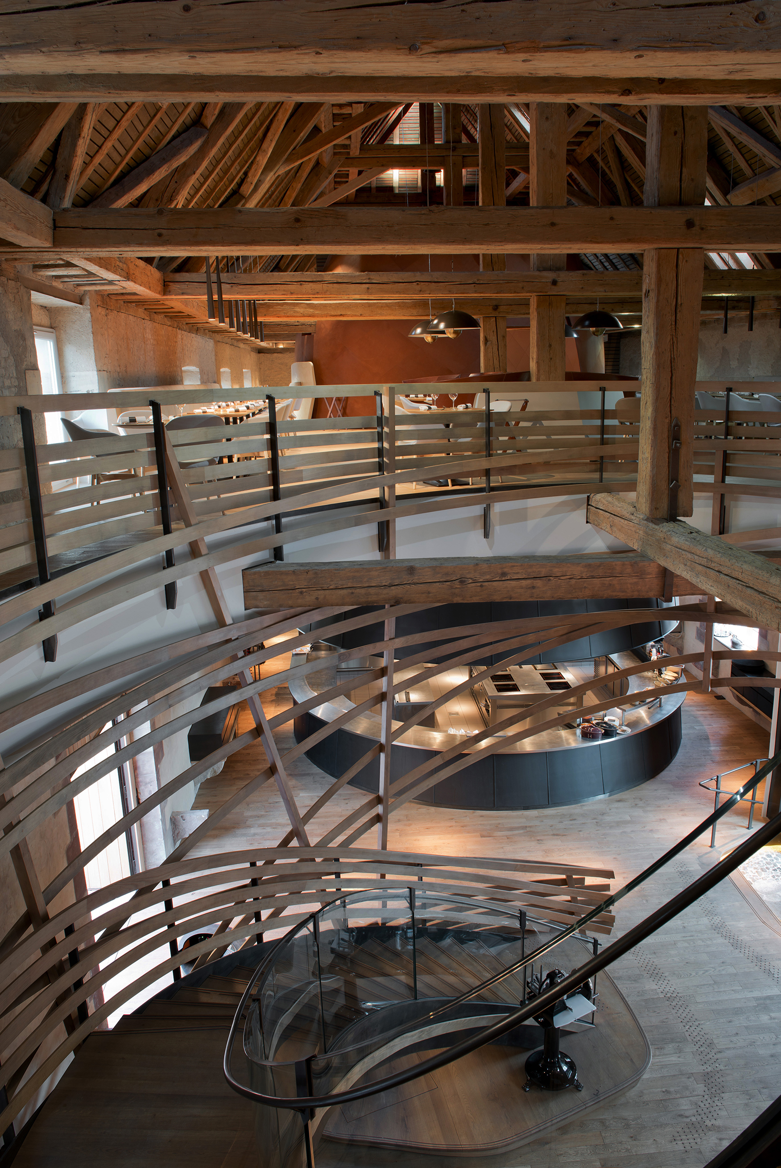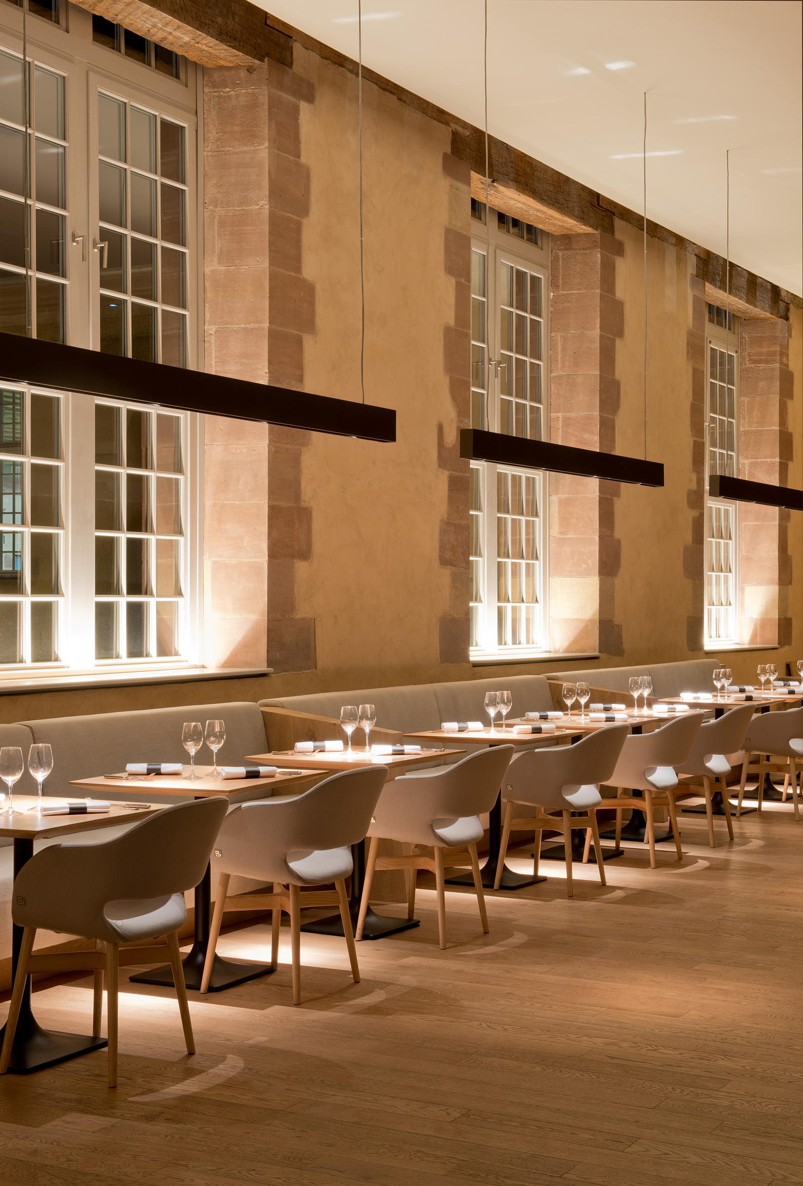 Having spent its first 150 years as the historic National Stud Farm of Strasbourg, this beautiful structure has been reborn as the Hôtel Les Haras Strasbourg, a luxury hotel located in the city center. Inside, the bronze tones of custom-design fixtures play off of and compliment the exposed-wood, rich brown color palette and earthy textures of the interior, all of which harken back to its previous life as a stable. In the hotel’s Brasserie restaurant, integrated linear LEDs and custom designed hanging cylindrical fixtures provide an intimate ambiance that perfectly tempers the vast, airiness of the space. Exuding warmth and sensuality, the light design melds old and new in this arresting space.