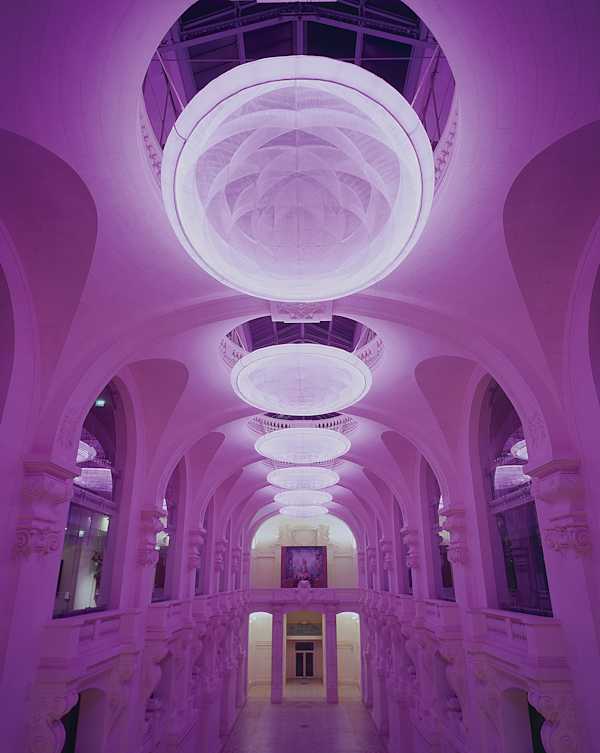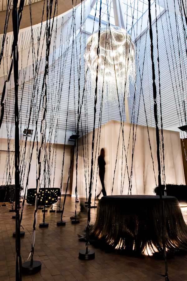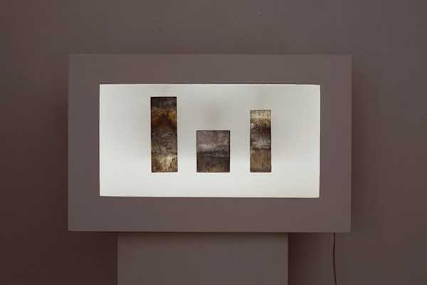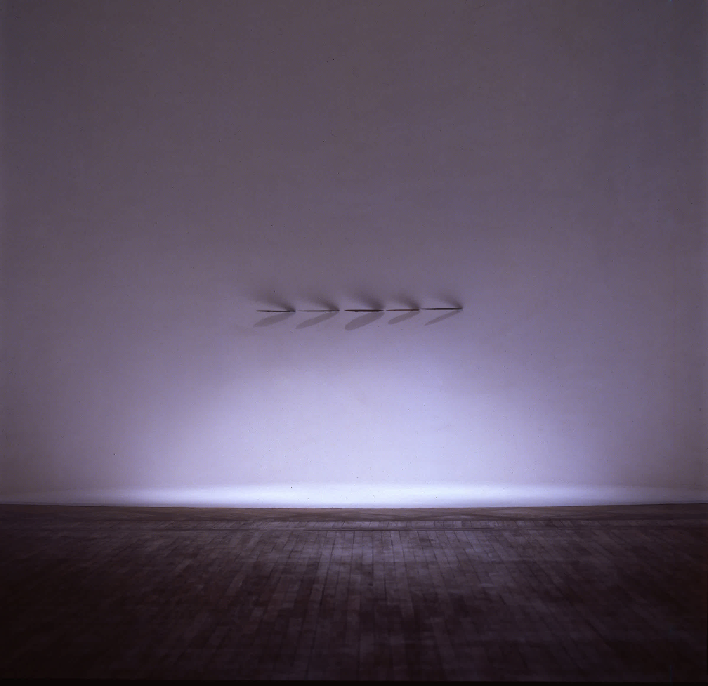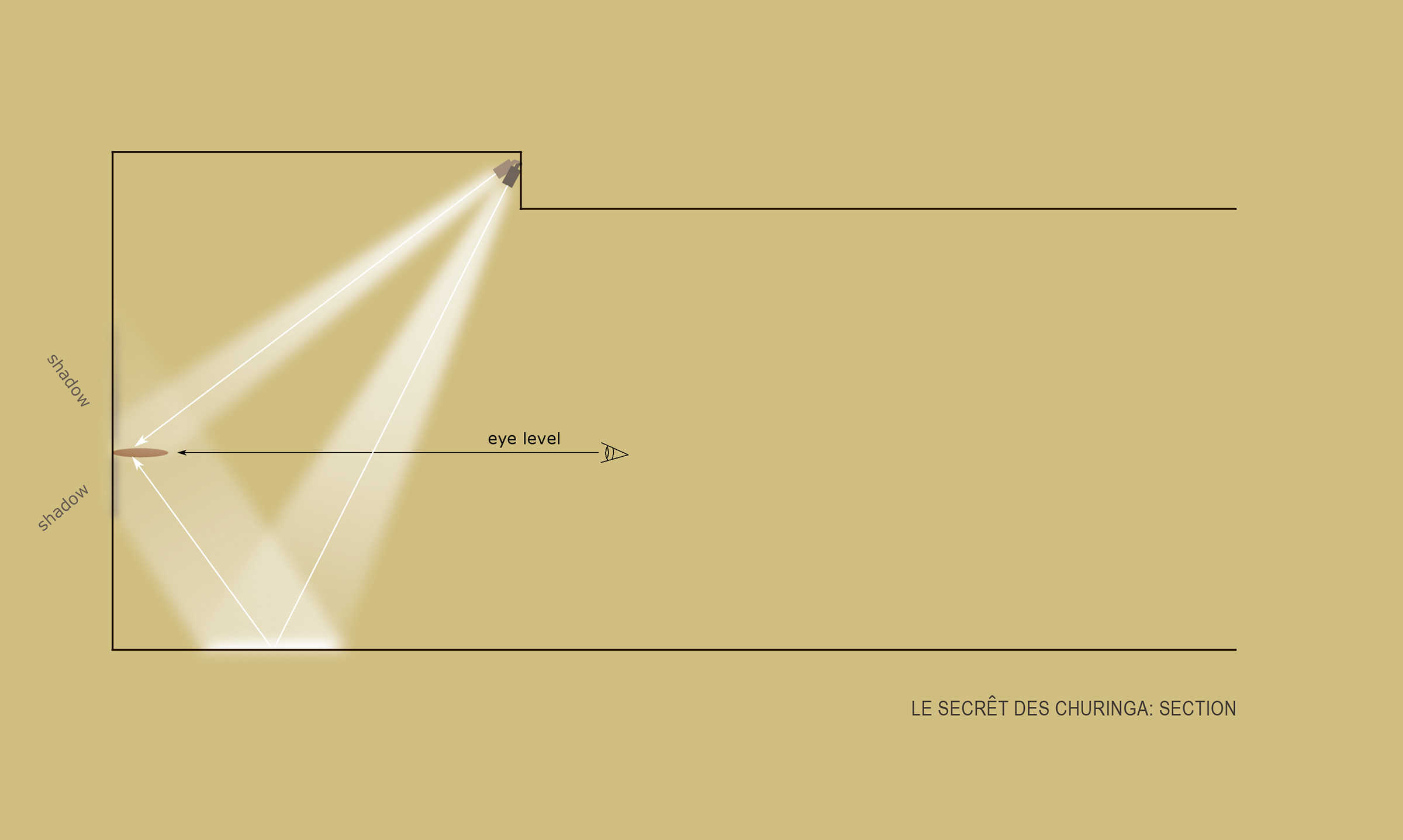 The churinga is a sacred ceremonial object used by Aboriginal men in secret rites. It is attached to a string and spun overhead, which causes it to emit a low-pitched sound believed to be the voice of the gods. For this exhibition, artist Marc Couturier installed the objects at eye level and attached them to the wall at their sides. The lighting was carefully aimed to create wing-like shadows, making the churinga appear to be in flight, thereby revealing a part of the ritual for which they are created.