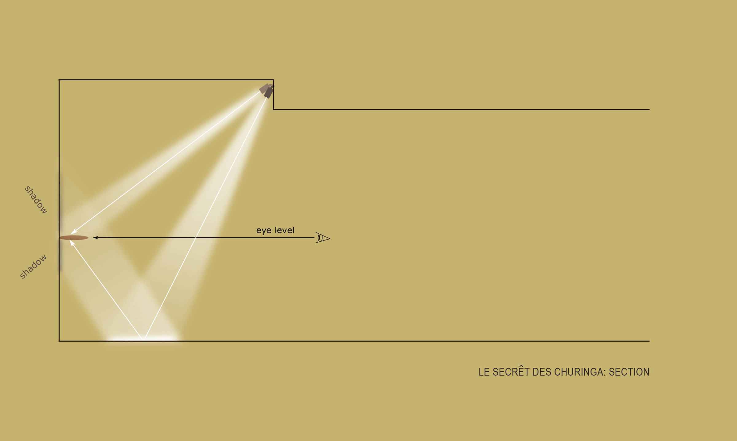 The churinga is a sacred ceremonial object used by Aboriginal men in secret rites. It is attached to a string and spun overhead, which causes it to emit a low-pitched sound believed to be the voice of the gods. For this exhibition, artist Marc Couturier installed the objects at eye level and attached them to the wall at their sides. The lighting was carefully aimed to create wing-like shadows, making the churinga appear to be in flight, thereby revealing a part of the ritual for which they are created.