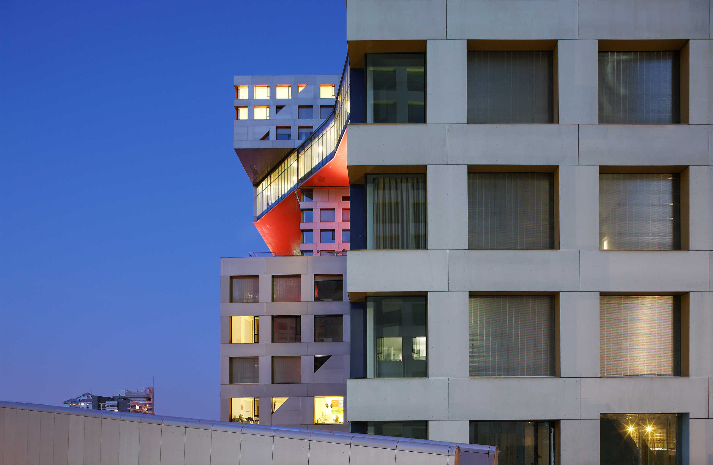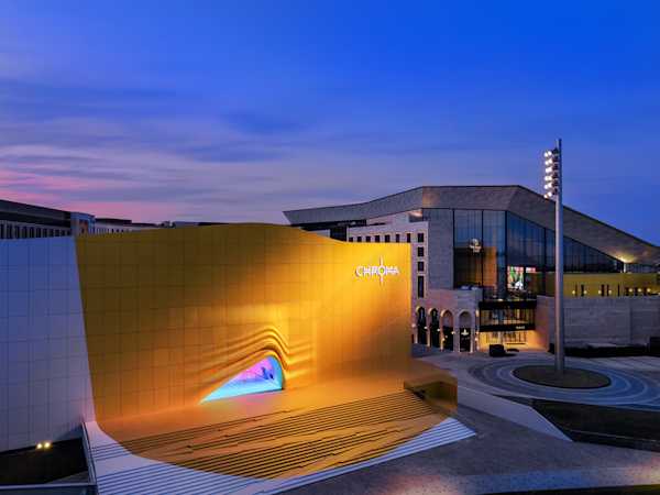 Lighting unifies a number of buildings as well as public spaces by using two rings of light: one located at eye level and another situated higher in the air, correlating with the bridges above.