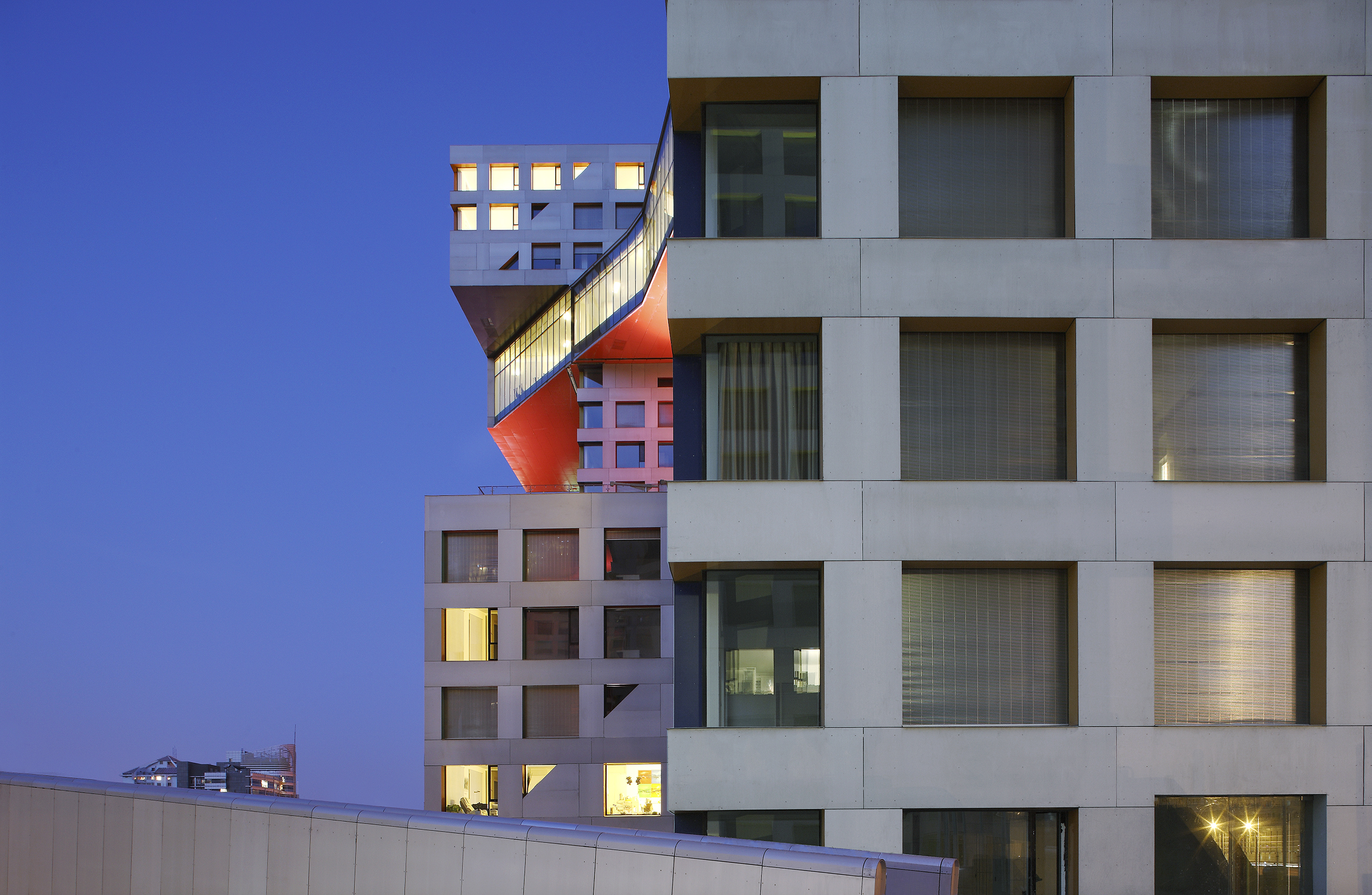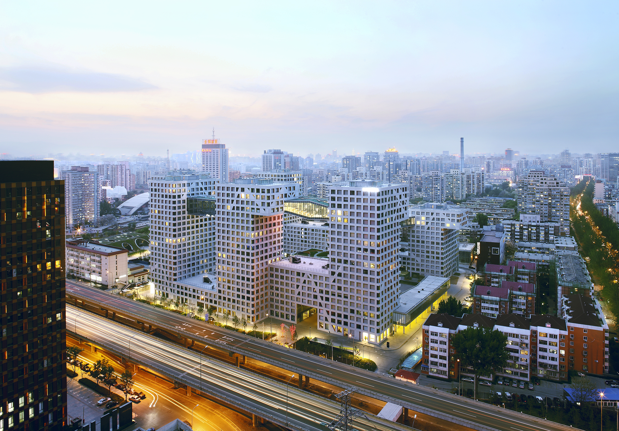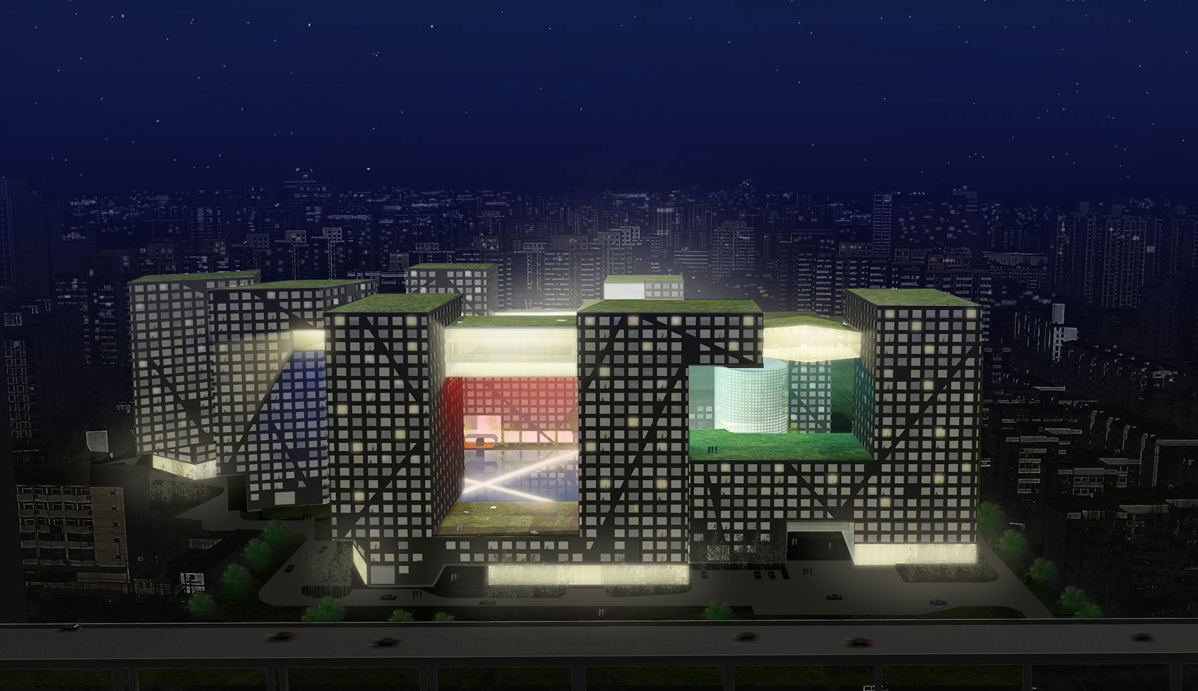 Lighting unifies a number of buildings as well as public spaces by using two rings of light: one located at eye level and another situated higher in the air, correlating with the bridges above.