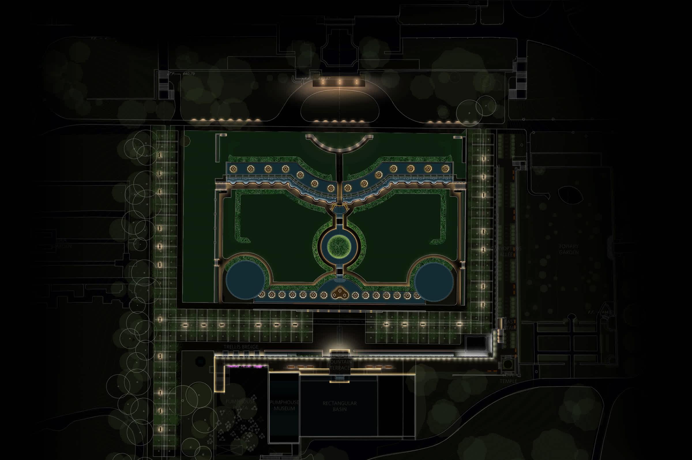 Architects Beyer Blinder Belle commissioned L’Observatoire International to create lighting concepts for the restoration and redesign of the Main Fountain Garden complex including the Upper Garden, Grotto, Grand Stairs, Pumphouse, Caryopteris Allee, and all historic facades.