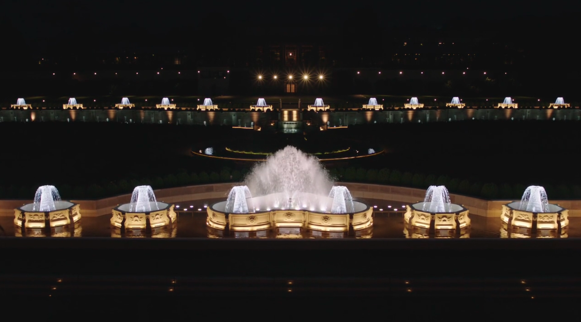 The Main Fountain Garden is experienced from multiple vantage points. L’Observatoire worked to create a varied lighting scheme that gives an overview of the fountain garden as tableau, while simultaneously creating an intimate space within the garden to reveal pathways, lawns and fountain areas up close. The system ties the garden to natural cycles, lunar and seasonal, so that the lighting schemes evolves in parallel with the seasons, offering a rich experience for visitors.