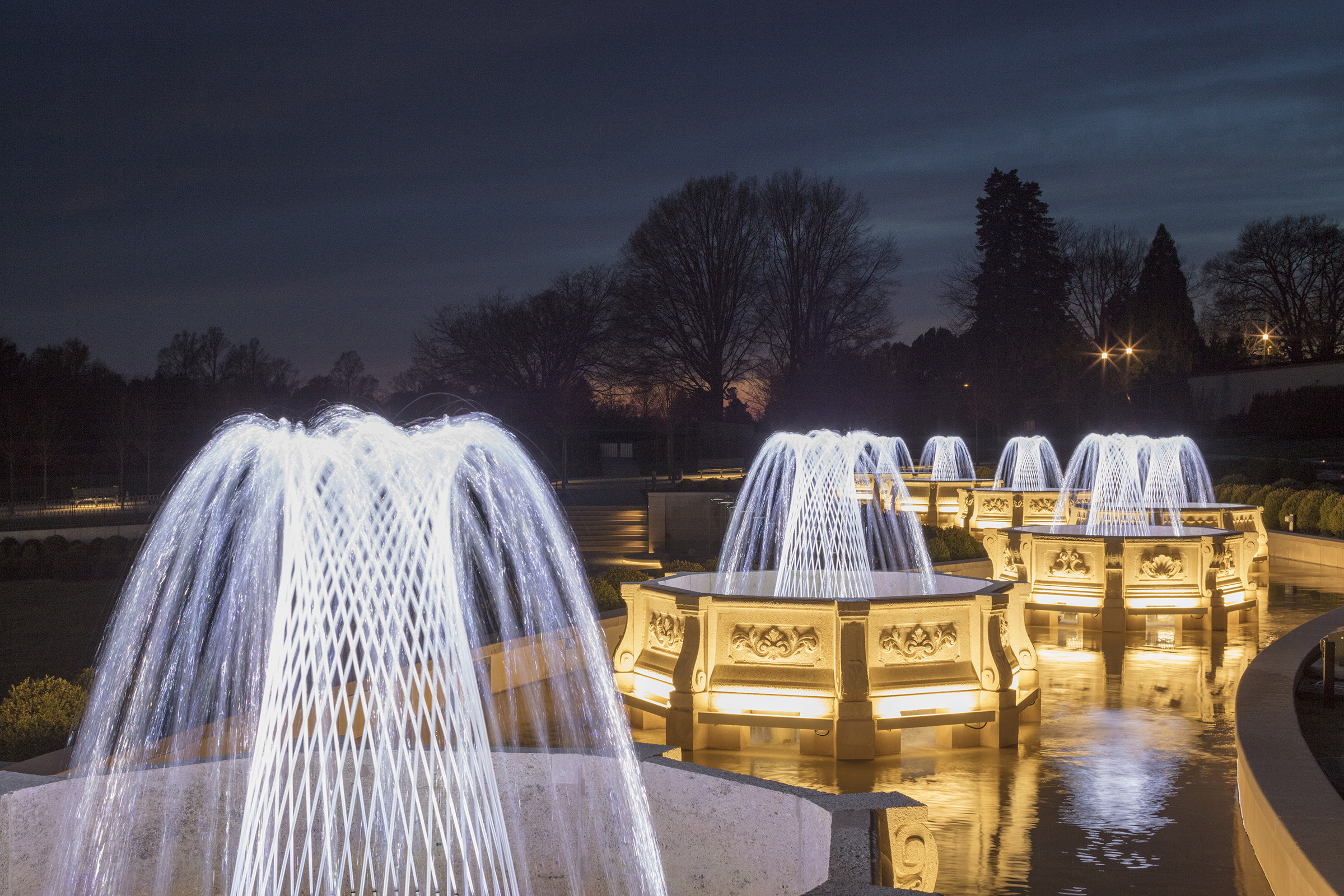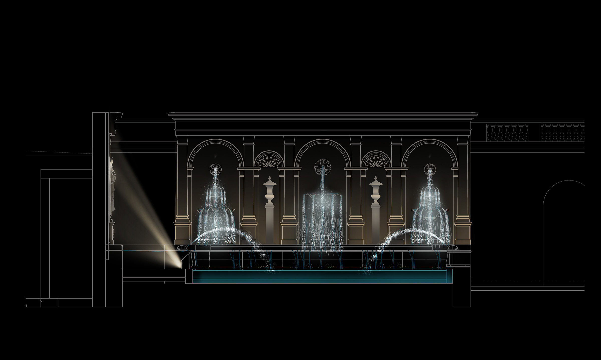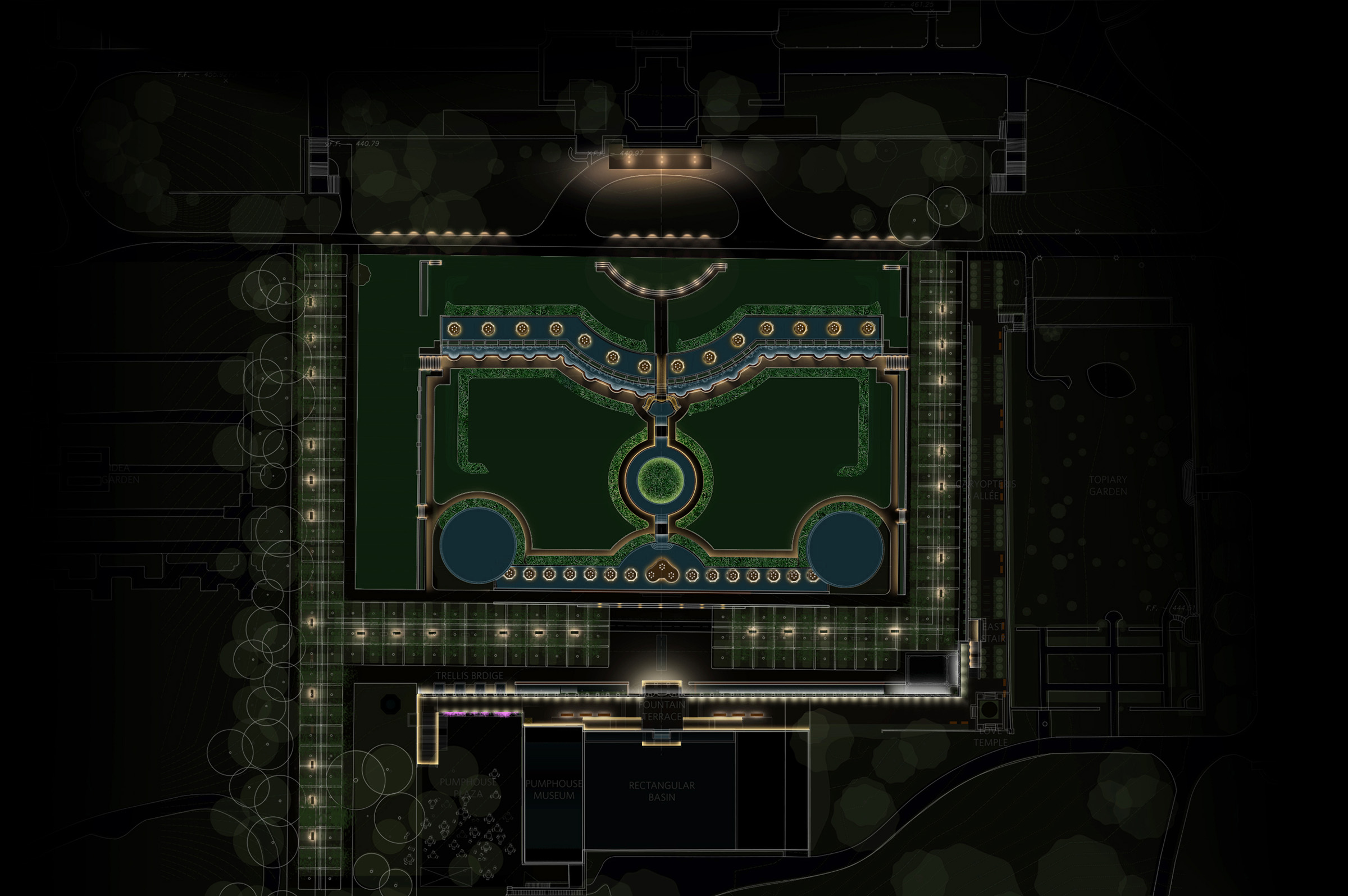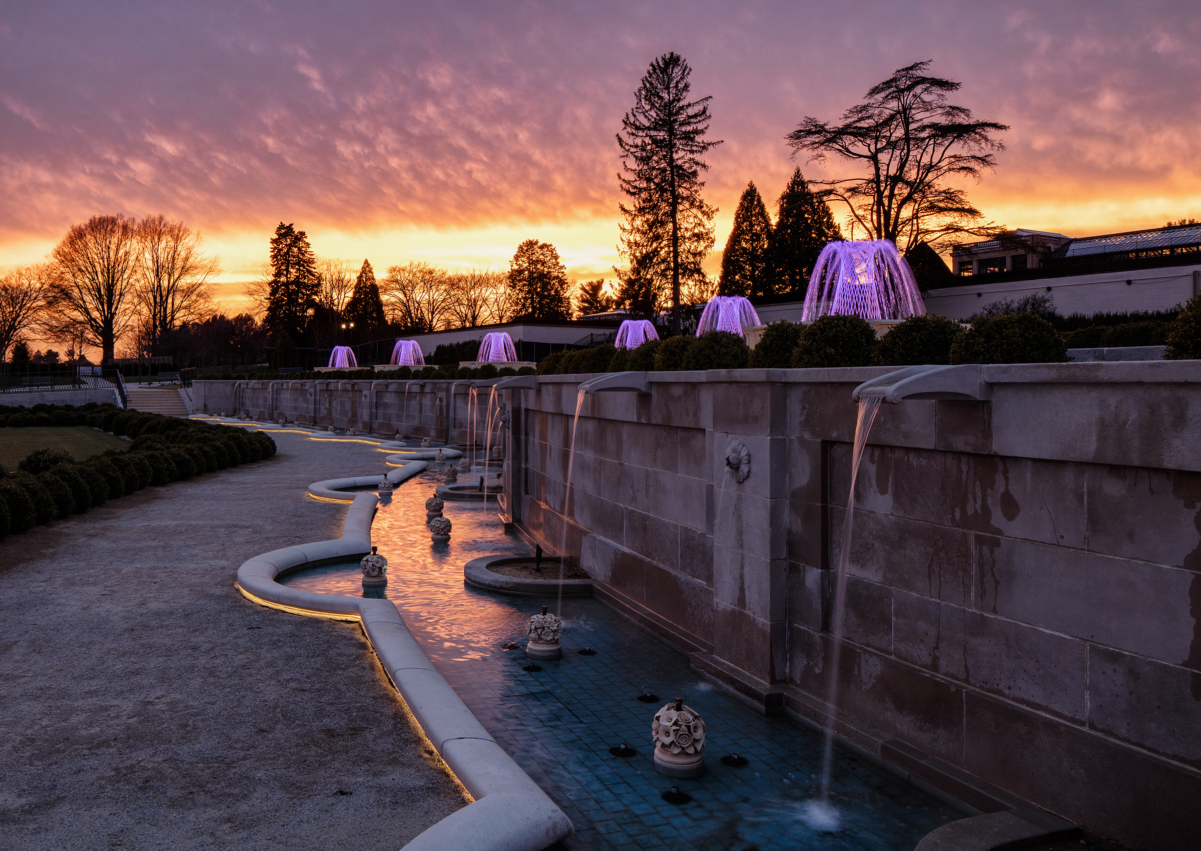 Architects Beyer Blinder Belle commissioned L’Observatoire International to create lighting concepts for the restoration and redesign of the Main Fountain Garden complex including the Upper Garden, Grotto, Grand Stairs, Pumphouse, Caryopteris Allee, and all historic facades.