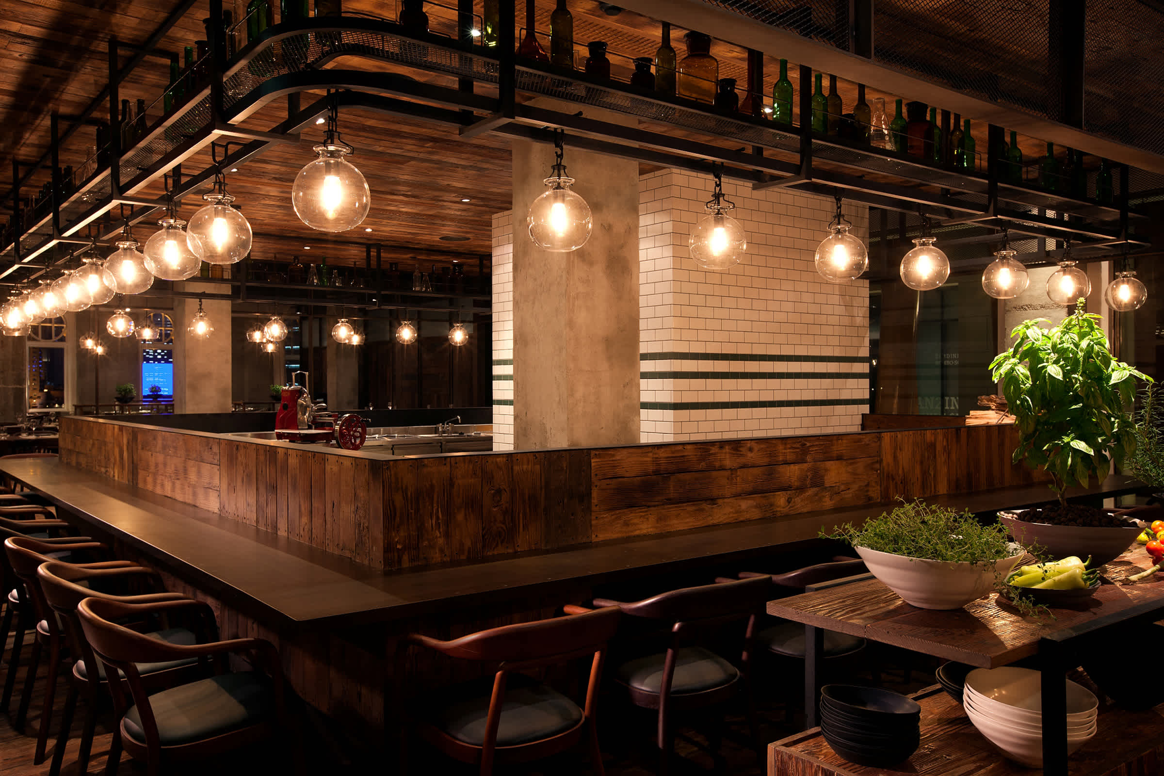 The gorgeous space created by Neri&Hu, bridges the organic and natural with elegance and emotive modernity. The experience begins from the moment guests enter Mercato’s stylishly rustic surroundings. Reclaimed wood and warm leather tones serve as a gentle complement to the exposed steel, iron and glass to create an atmosphere that is polished yet warm and inviting. The design imparts a sensual feeling of comfort and lightness that redefines the idea of “farm chic”.