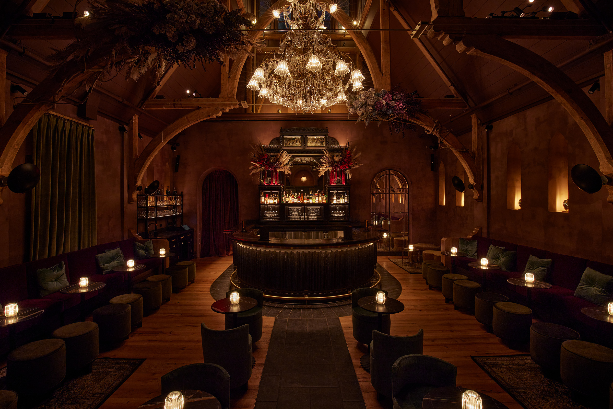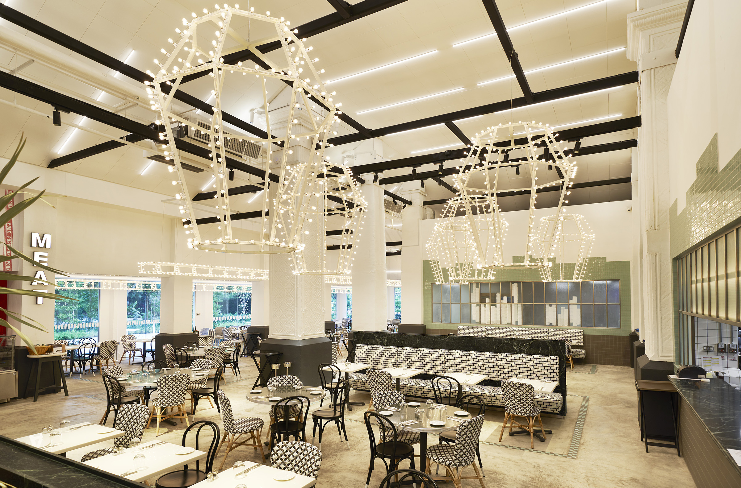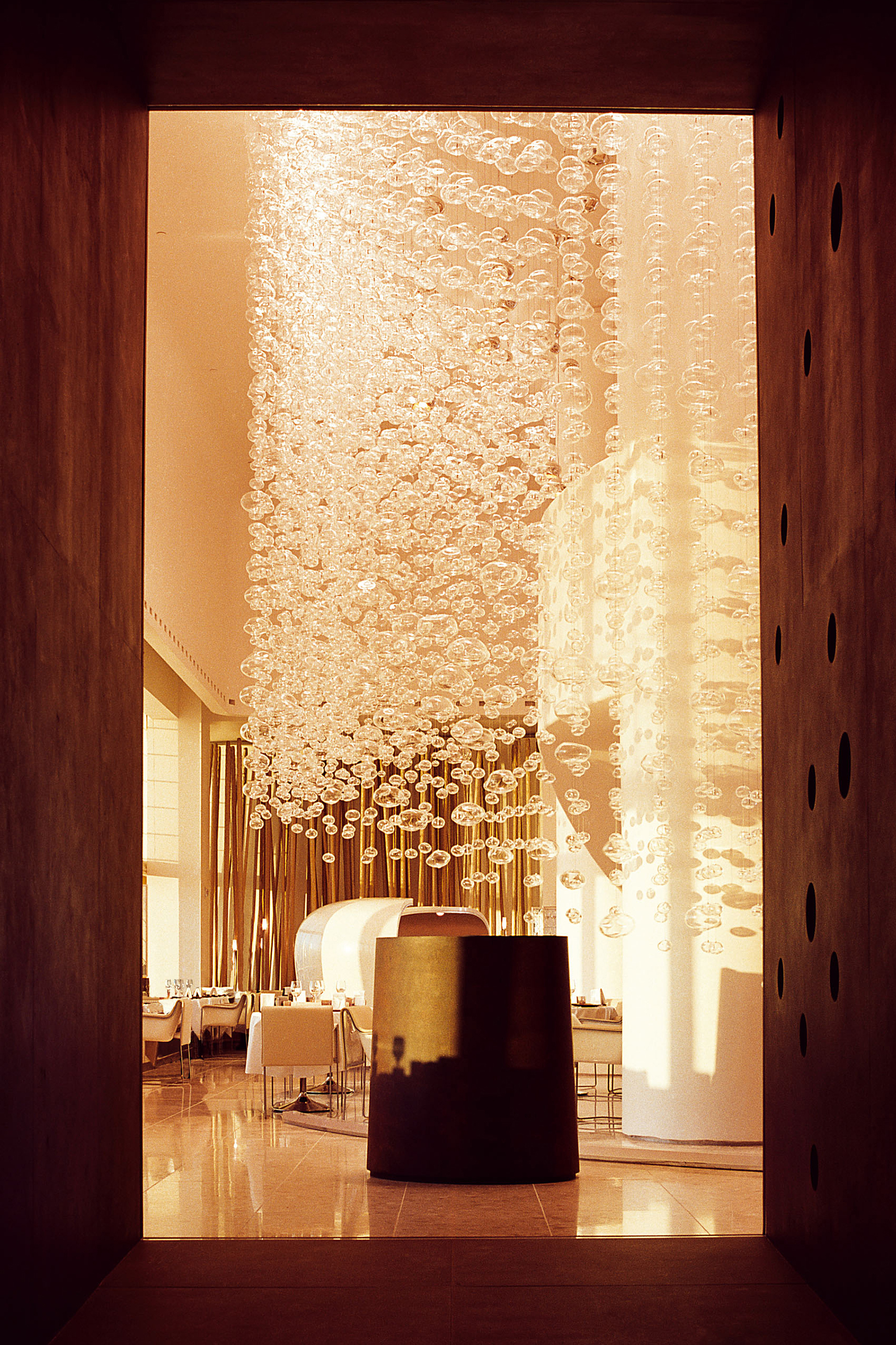 Patrick Jouin designed a dining space evoking the inside of a chandelier, dripping with crystal bubbles. In keeping with the metaphor of a restaurant in the sky, the bubbles refract light like water droplets in a cloud.