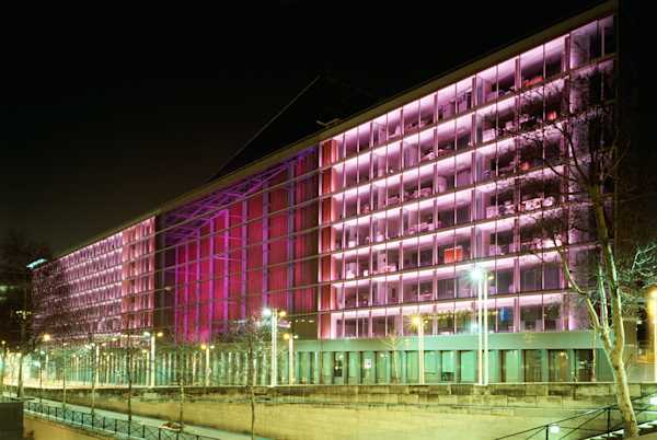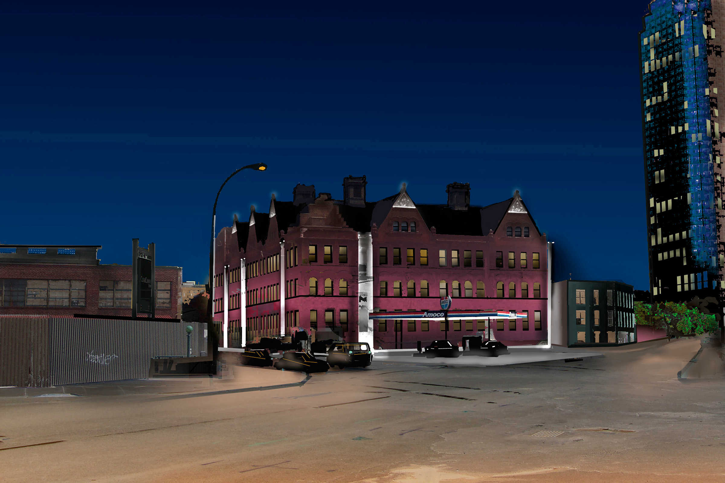 With the restoration of PS1’s historic brick façade, lighting unifies the historic nature of the building with the imaginative edge of PS1. A continuous, brushed, stainless steel valance, cantilevered off of the façade, mirrors the building’s decorative terracotta cornice and reflects the sky. At night, the valance washes colored light over the brick. The color of the light complements the natural color of the brick, but is also oversaturated to add a layer of singular poetry identifying the building. High-powered spotlights on the façade seemingly stretch the building vertically, and remaining terracotta ornaments along the roofline are highlighted with linear uplights and spotlights.