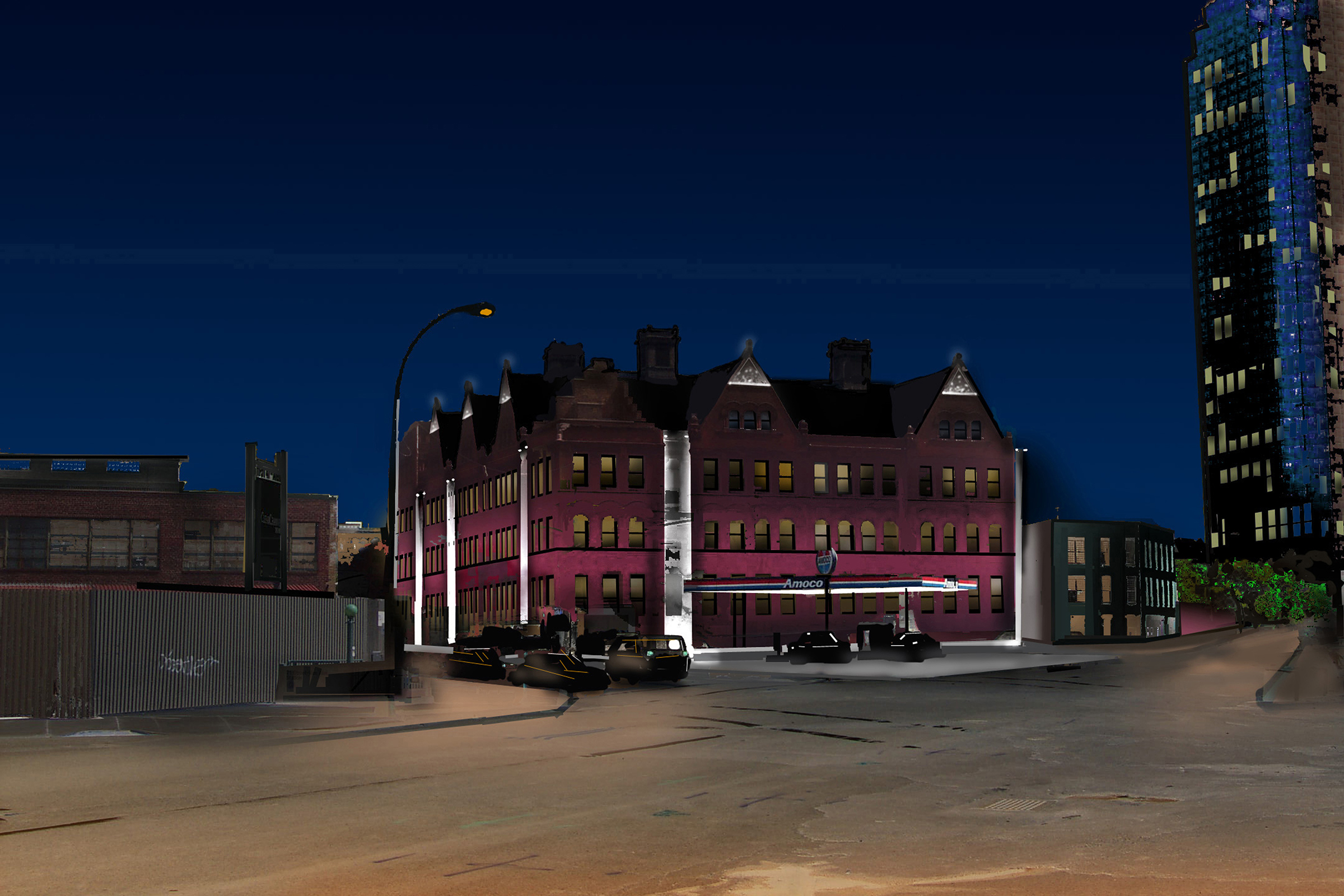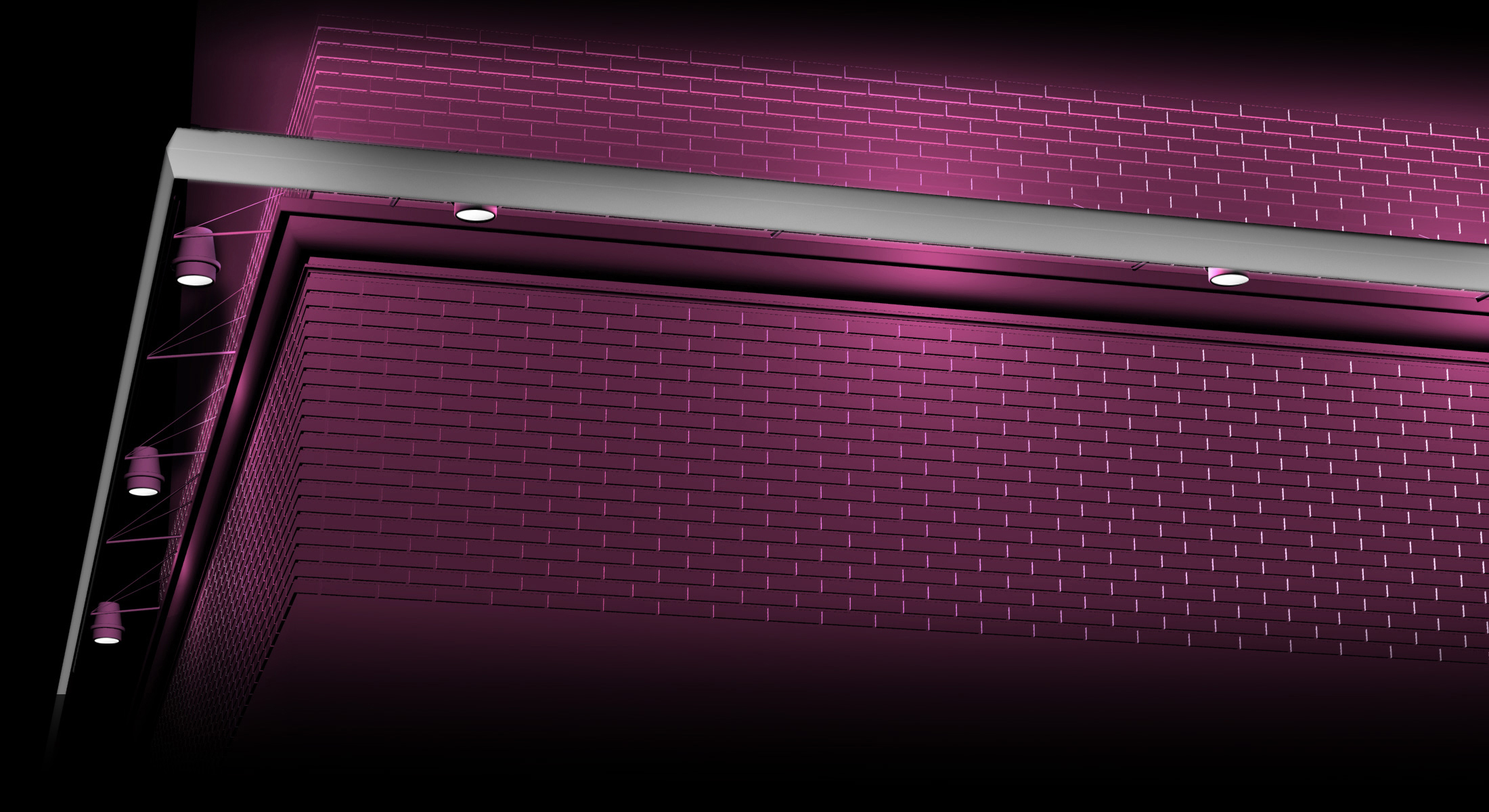 With the restoration of PS1’s historic brick façade, lighting unifies the historic nature of the building with the imaginative edge of PS1. A continuous, brushed, stainless steel valance, cantilevered off of the façade, mirrors the building’s decorative terracotta cornice and reflects the sky. At night, the valance washes colored light over the brick. The color of the light complements the natural color of the brick, but is also oversaturated to add a layer of singular poetry identifying the building. High-powered spotlights on the façade seemingly stretch the building vertically, and remaining terracotta ornaments along the roofline are highlighted with linear uplights and spotlights.