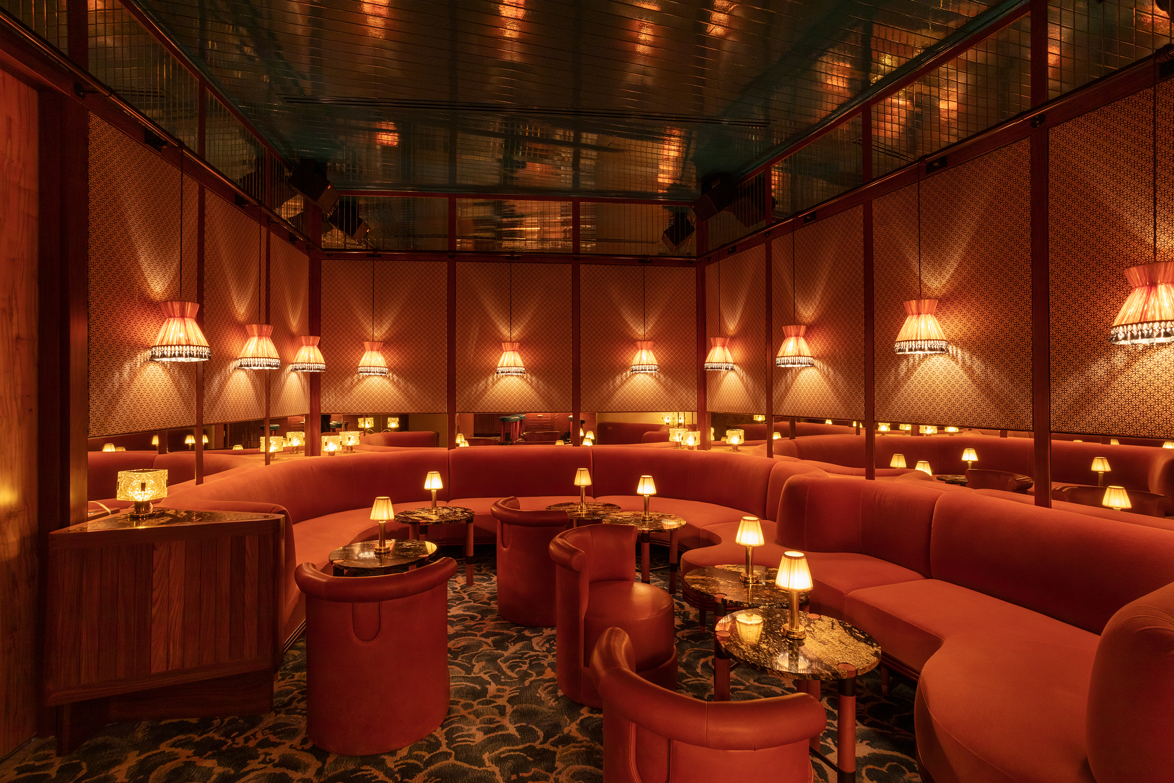 The T-shaped bar with Amazonite stone is a dramatic focal point and provides an intimate place to gather. Afrormosia wall paneling and plush carpet emulating the ocean are tied together beneath a Murano glass chandelier. The shelves are playfully lined with a Pop art collection of 1980s Frozen Moments by artist Geoffrey Rose.