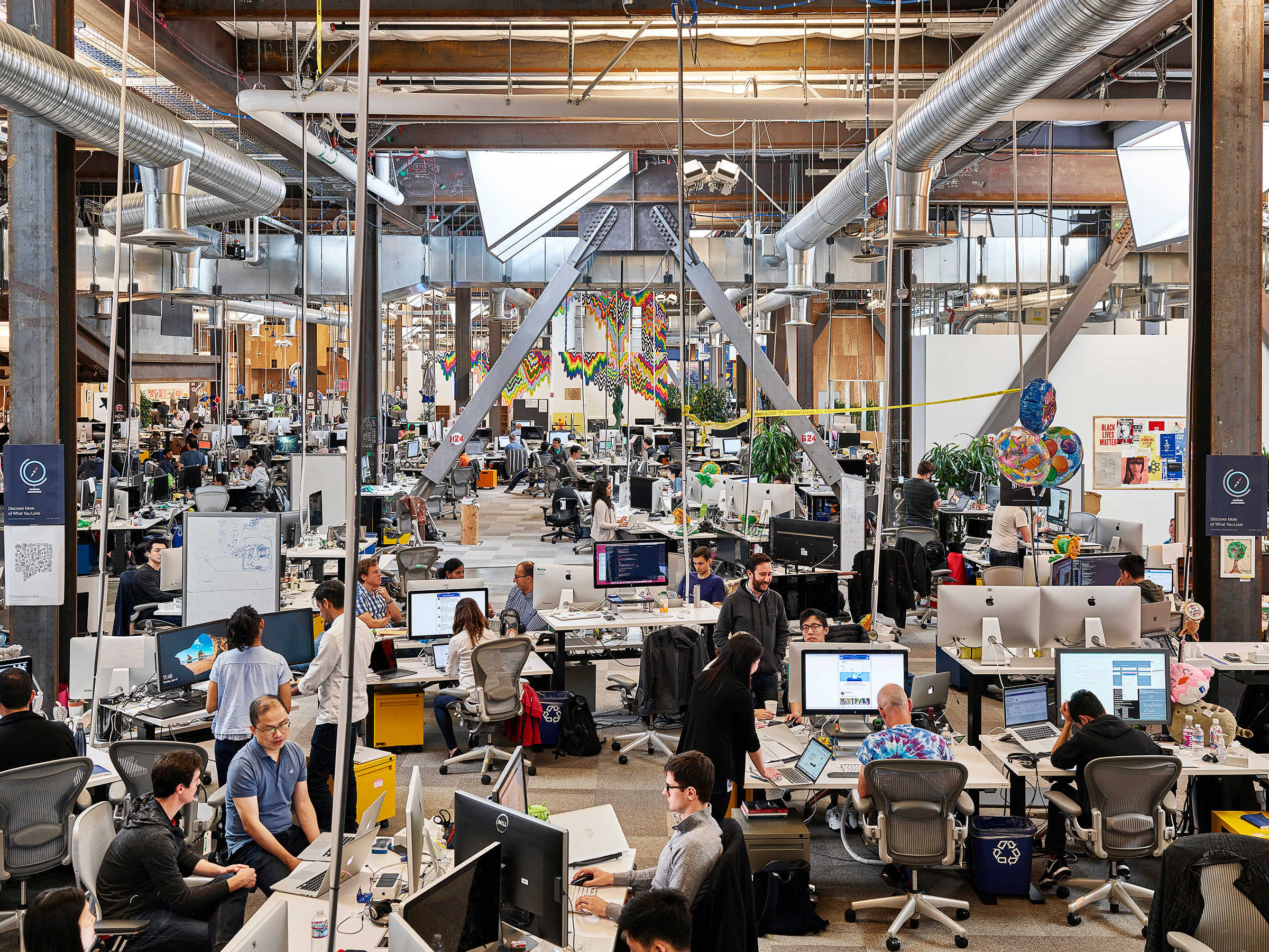 Harkening back to the old school “hacker lab,” Meta new campus presents an expansive open floor plan that thrums with energy, intellect and activity. To light this space, Descottes struck a delicate balance between accentuating the rawness of the programmer’s natural habitat, while drawing the eye to creative elements and natural light to provide a more organic atmosphere.