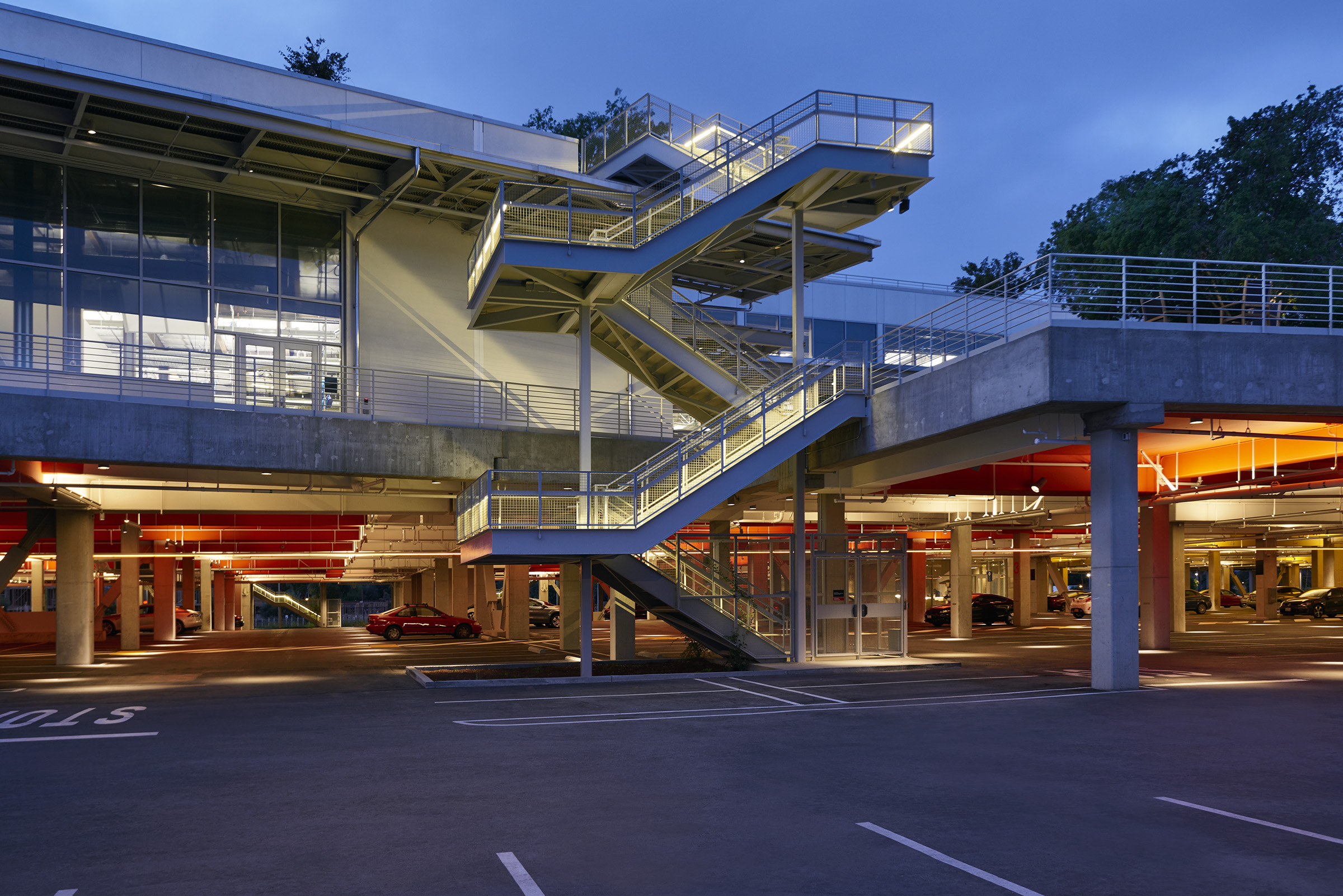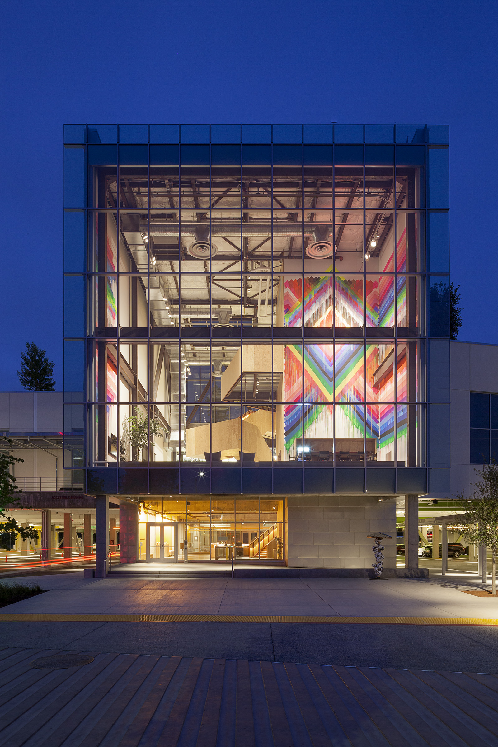 On the office floor, custom fixtures sourced from shipping cranes add an industrial flair, while subtle integrated linear fixtures draw one's eye to the artwork adorning conference room walls. Throughout, the ceiling is bejeweled by skylights outfitted with a translucent shield, which diffuses the direct natural light coming in and disperses it throughout the room for a more natural ambiance.