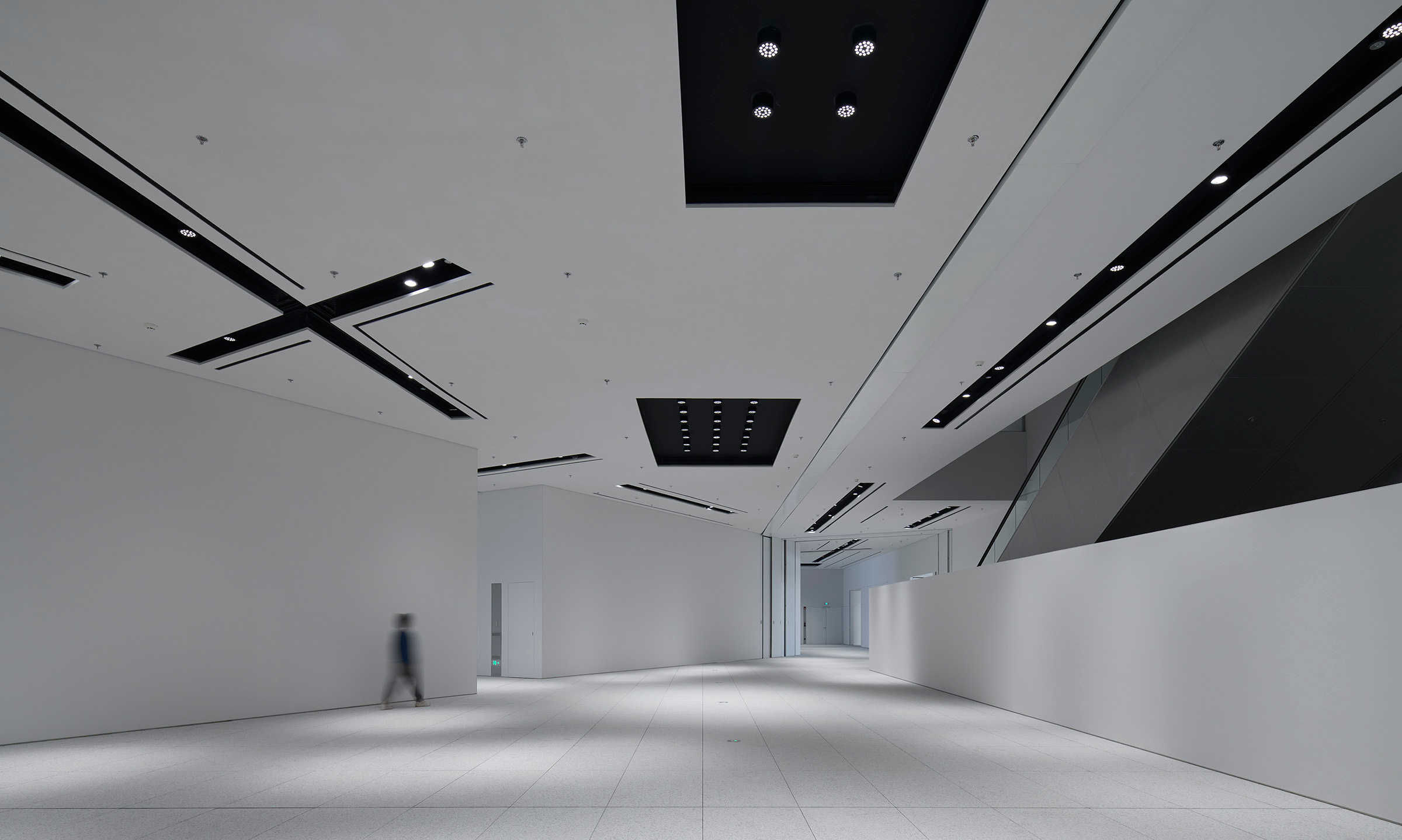 This bold three-dimensional configuration inspired a lighting system that gives a sense of volume and contrast internally. Using a palette of diffuse, indirect and accent lighting, the ceilings of the galleries are a play of composition and form, with varying shapes of diffuse light panels and intersecting slots of adaptable accent and ambient lights.