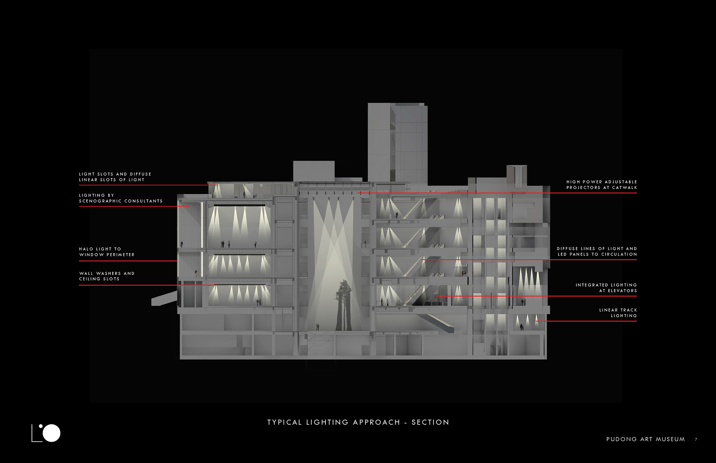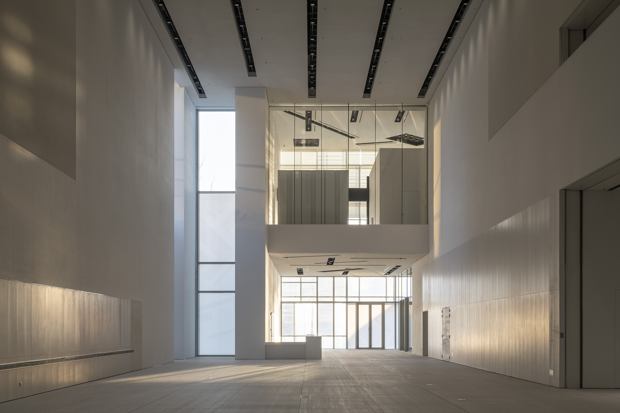 Facing the Bund Museum of Art Pudong (MAP) stands as a monochromatic gesture in the Shanghai skyline. A 7 floor structure, the Museum will become a multi- use complex for the arts, with 54,000 m² of habitable space; including permanent and temporary use galleries of multiple heights, a theatre, roof terrace with sculpture garden and restaurant, various food and beverage offerings, a library and staff offices, and large viewing gallery facing across the Bund.