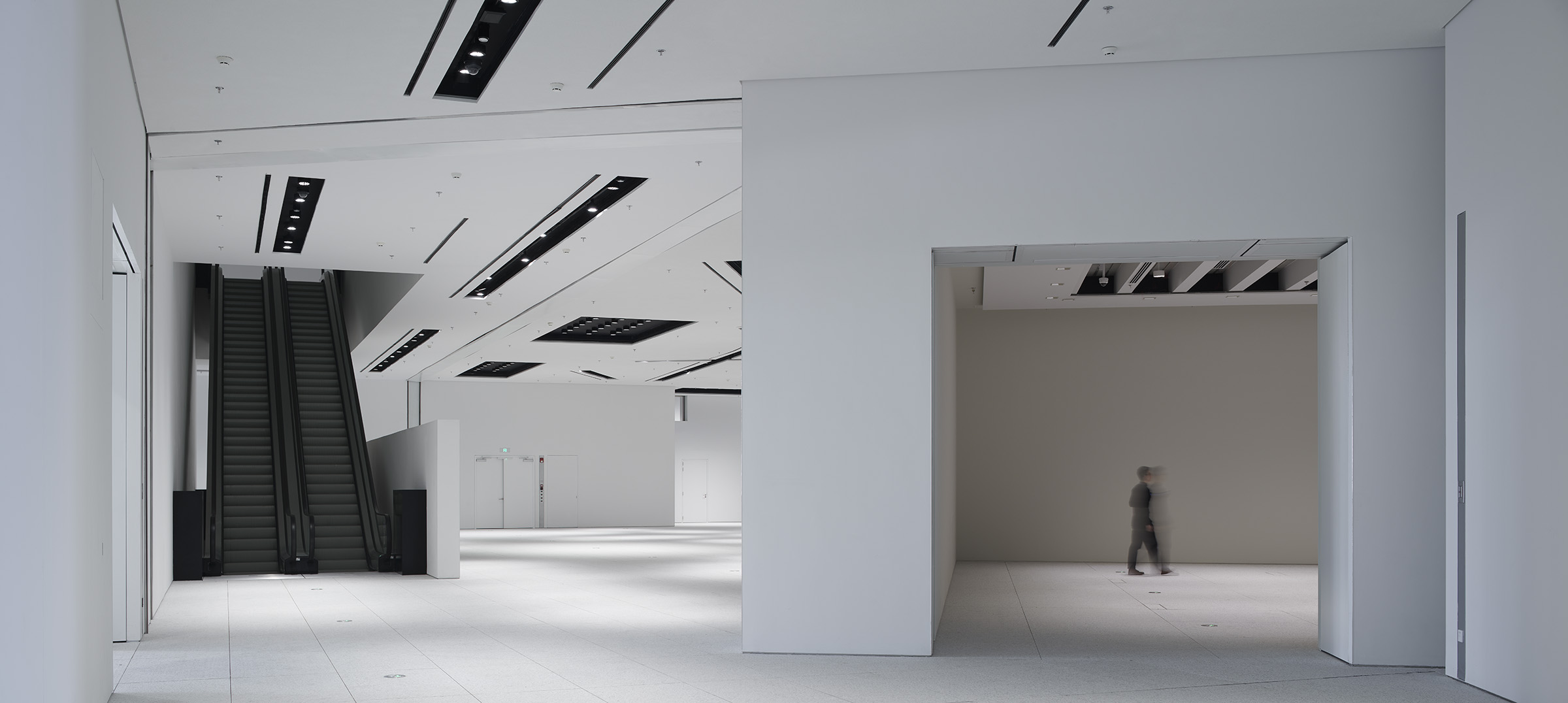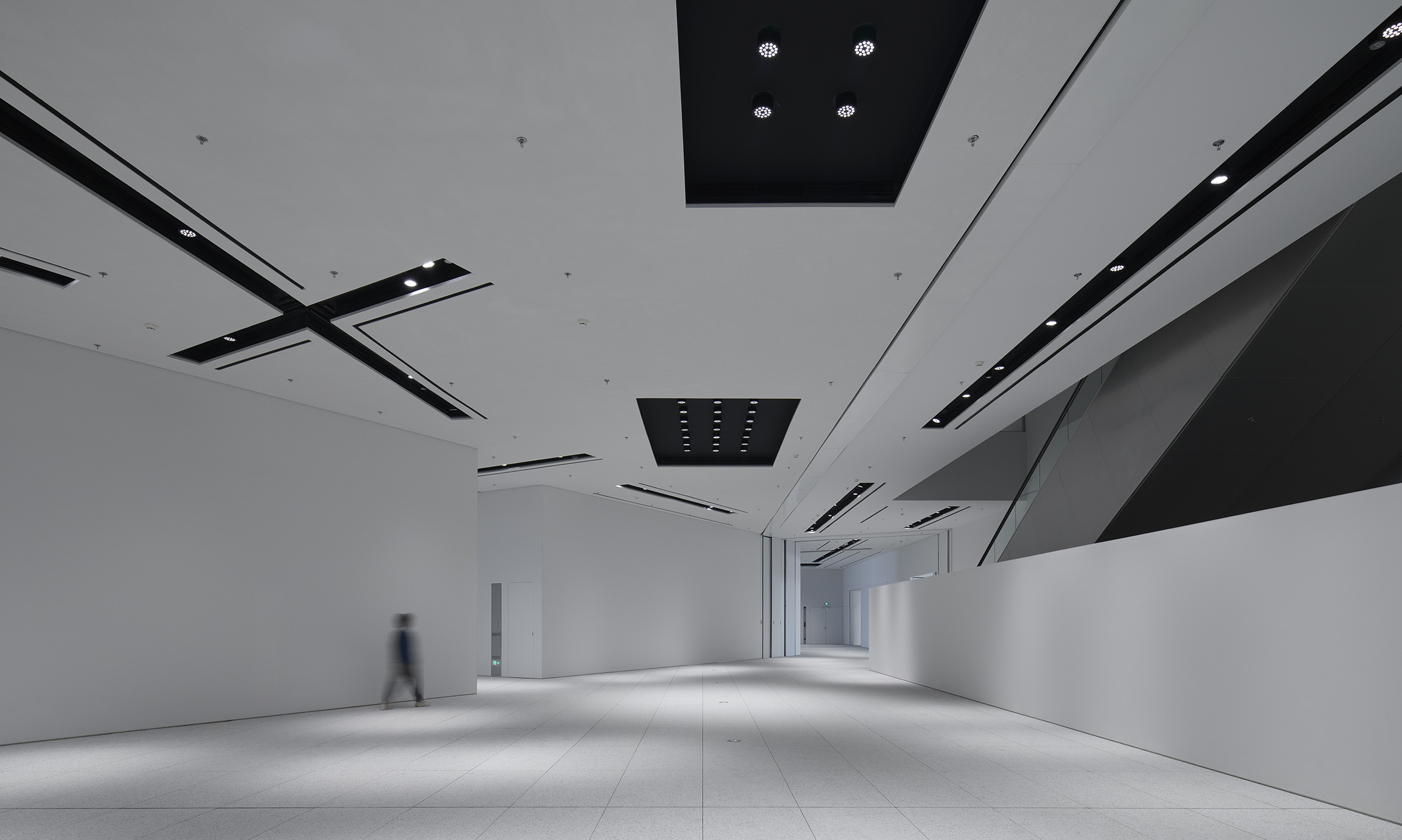 This bold three-dimensional configuration inspired a lighting system that gives a sense of volume and contrast internally. Using a palette of diffuse, indirect and accent lighting, the ceilings of the galleries are a play of composition and form, with varying shapes of diffuse light panels and intersecting slots of adaptable accent and ambient lights.