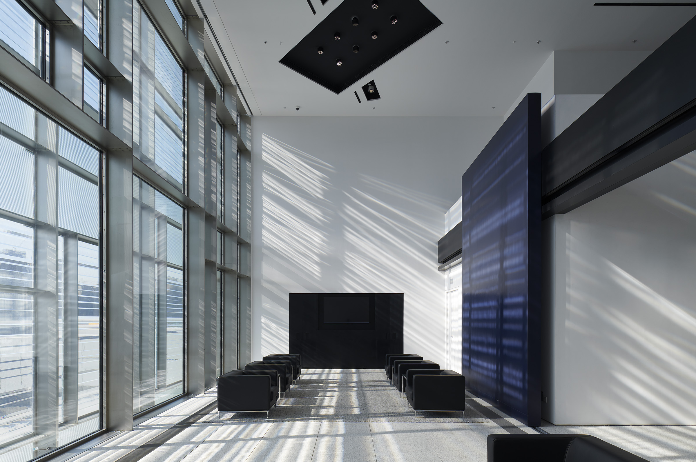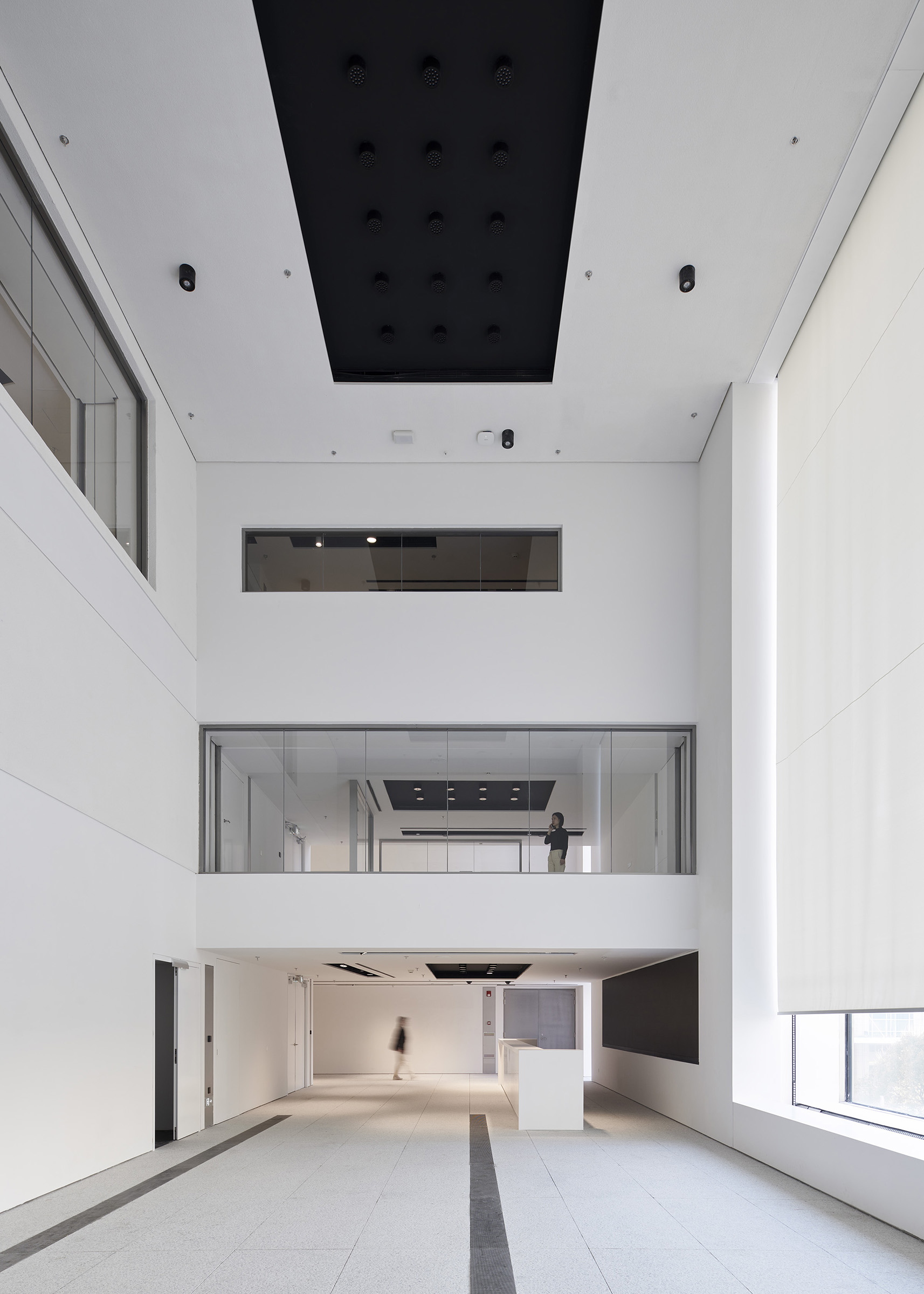 Designed as a composition of geometric volumes inspired by the Suprematist Art Movement, specifically Malevich’s White on White (1918) and clad externally in a white granite, the building is by substance a solid figure amongst the buildings in the Shanghai skyline.