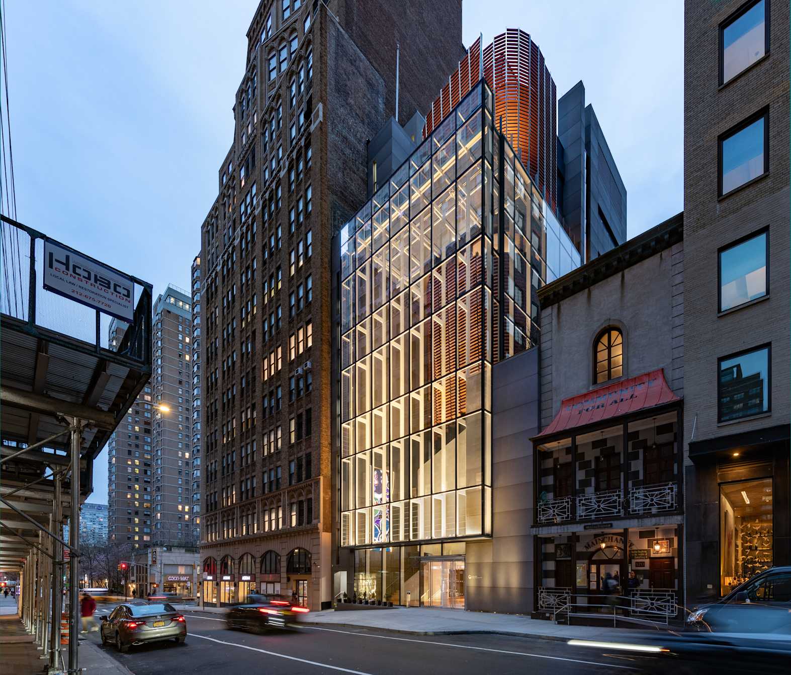 Designed by SAMOO Architects, the 33,000-sq-ft building provides a striking new stage for KCCNY’s diverse cultural and artistic offerings, including gallery exhibitions, performing arts concerts, film festivals and educational programs. A multi-layered glass façade encases three sculptural volumes within the seven-story building, with illumination by L’Observatoire International ensuring the culturally-significant figures remain the project’s focal point. Since the three volumes are composed of different materials—polished ceramic represents Heaven, rough terracotta represents Earth, and milled wood represents Humanity—the design team created a lighting plan that highlights the unique characteristics of each one.