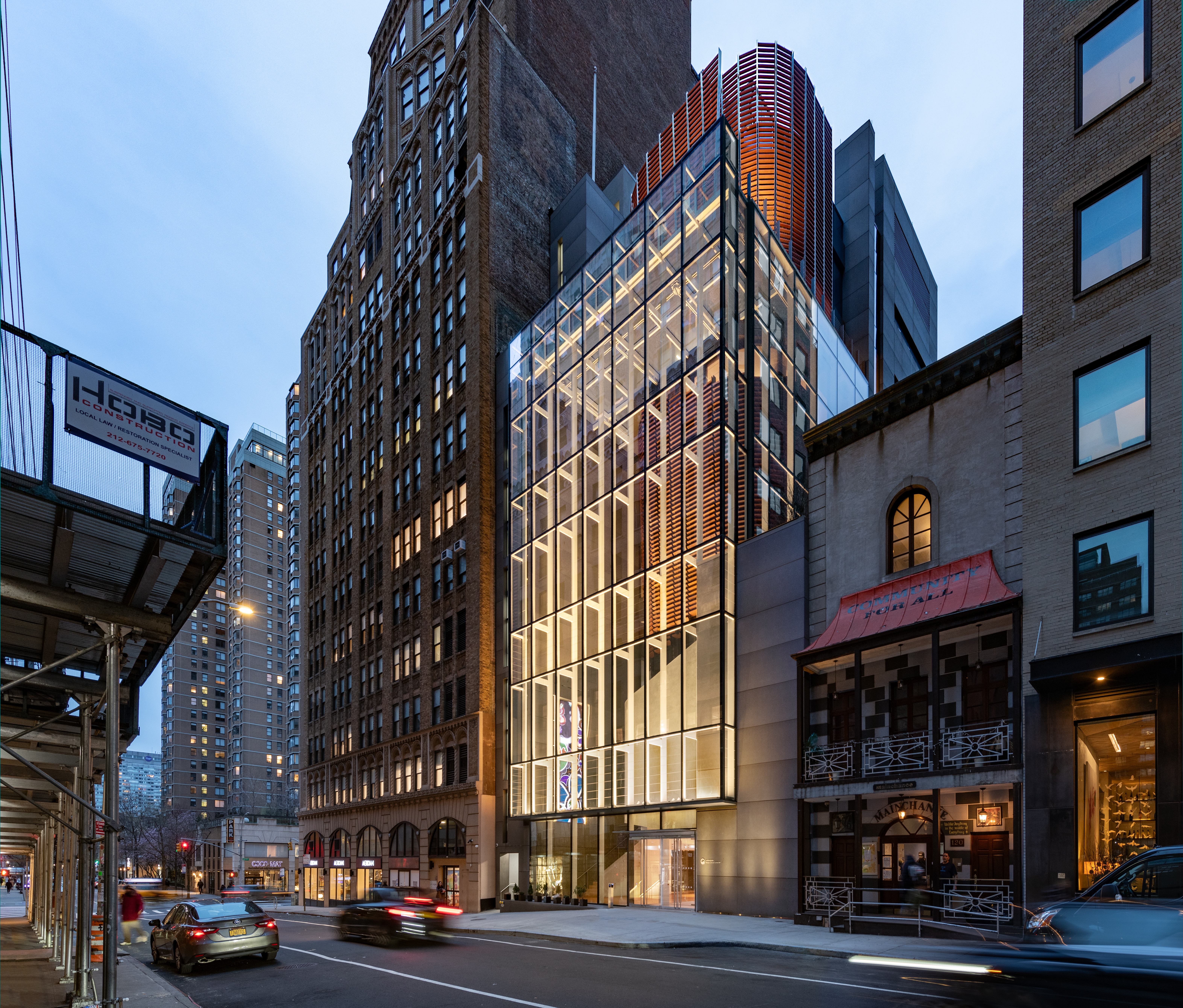 Designed by SAMOO Architects, the 33,000-sq-ft building provides a striking new stage for KCCNY’s diverse cultural and artistic offerings, including gallery exhibitions, performing arts concerts, film festivals and educational programs. A multi-layered glass façade encases three sculptural volumes within the seven-story building, with illumination by L’Observatoire International ensuring the culturally-significant figures remain the project’s focal point. Since the three volumes are composed of different materials—polished ceramic represents Heaven, rough terracotta represents Earth, and milled wood represents Humanity—the design team created a lighting plan that highlights the unique characteristics of each one.