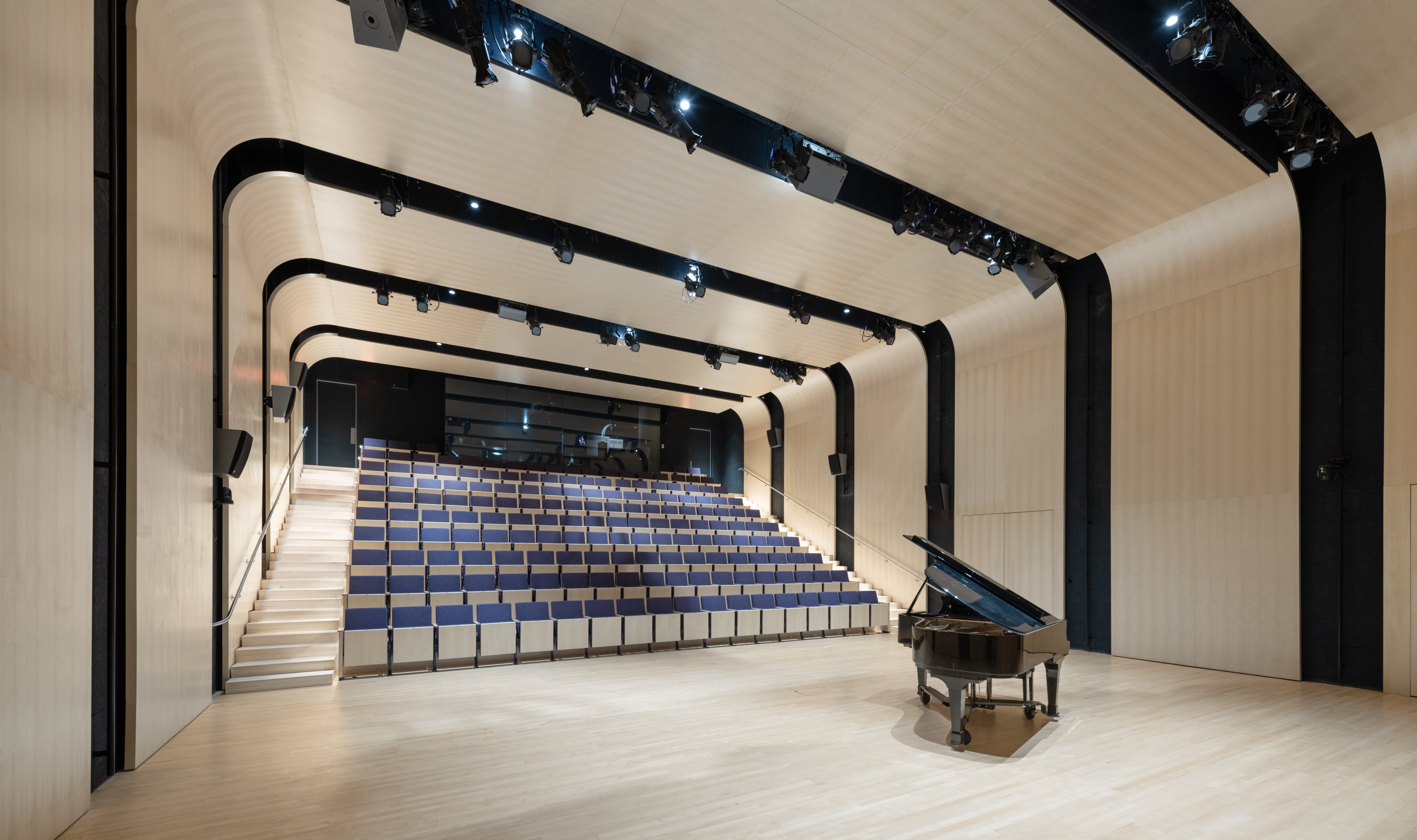 Linear, glowing light carries through to the third zone, which houses private administrative offices and artist studios, supplemented by accent lighting carefully located throughout. The aesthetic even extends below grade to the 200-seat auditorium, where the center will host events, lectures and performances, with recessed slots in the ceiling running in bands across the theater and low-level step lights lining the stair corridors.