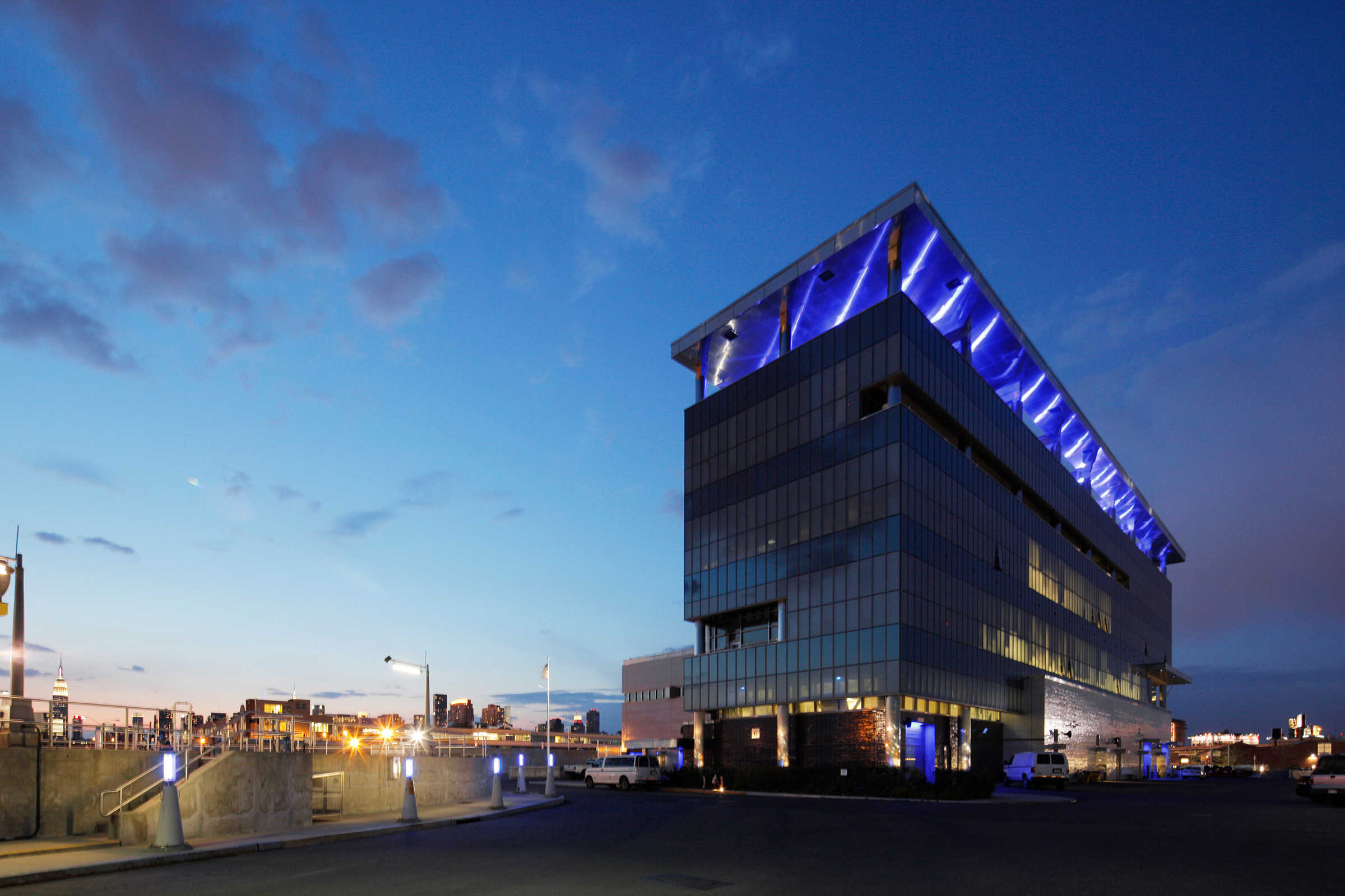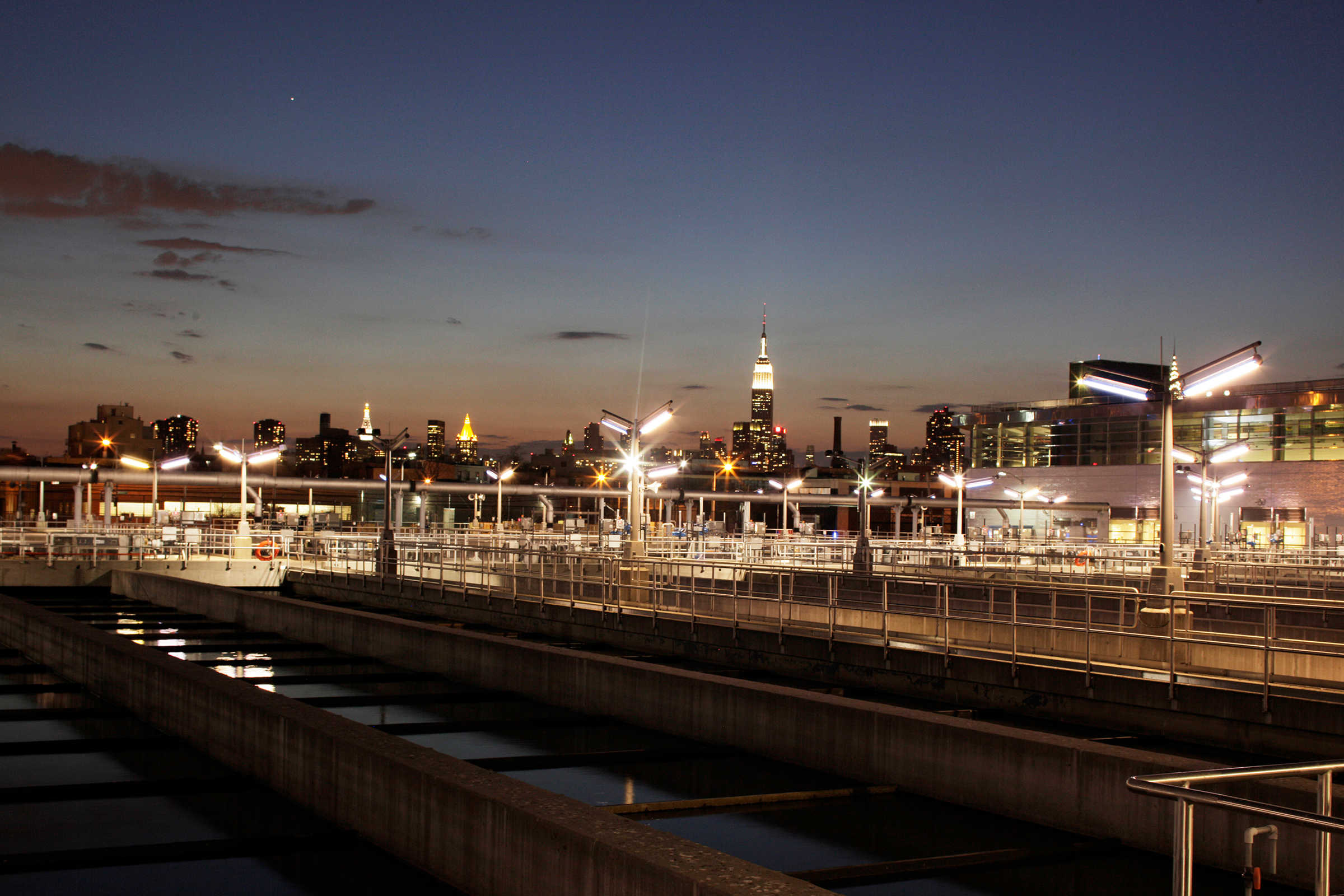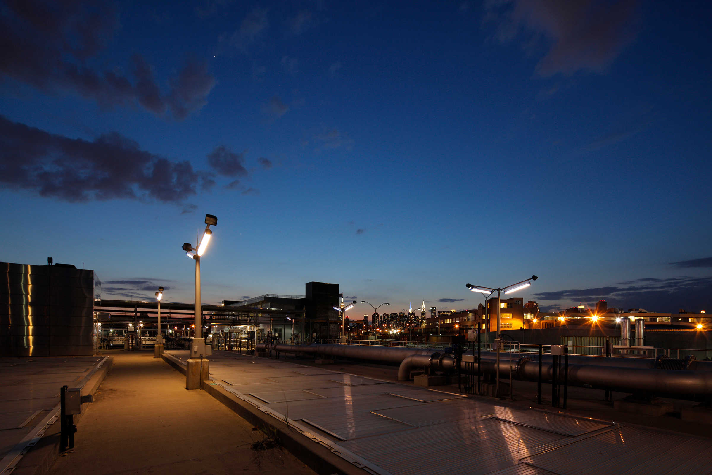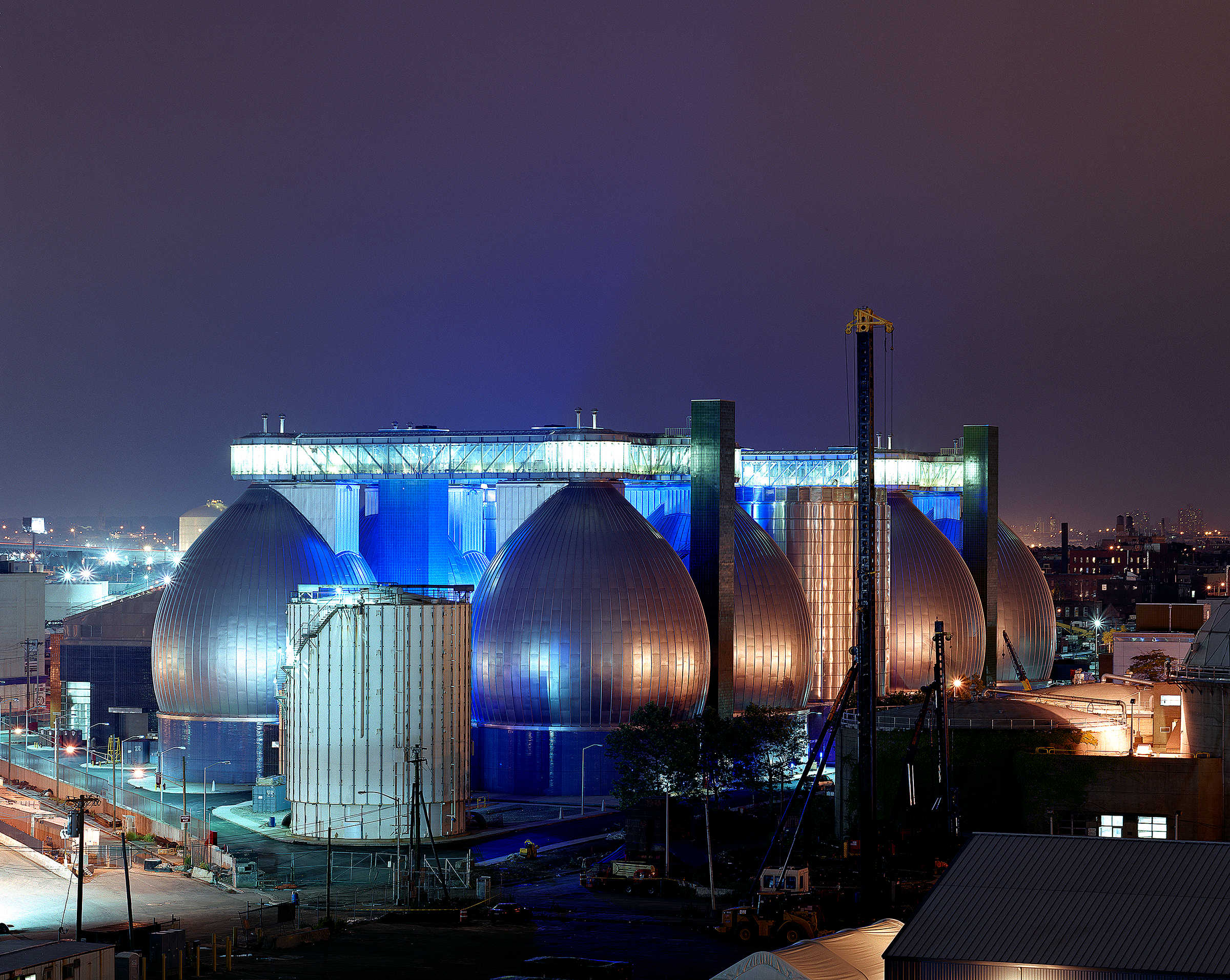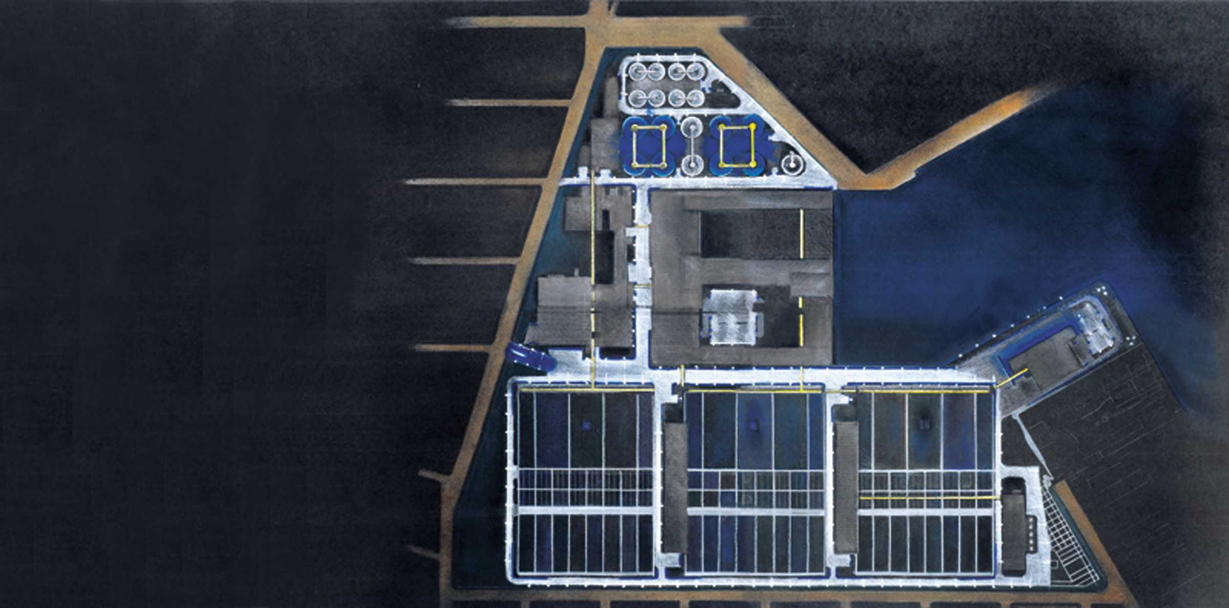 The master plan for this wastewater treatment plant outlined $4.5 billion in new construction over twenty-five years, replacing an outmoded, environmentally unsound facility. Constructed in phases, the plant remains fully operational throughout the process. The design employs building forms, materials, and color, as well as perimeter fencing, aerial walkways and bridges as ordering devices to link the structures into a comprehensible, striking visual composition. Expanses of glass display and demystify the wastewater treatment process and provide natural light in machinery rooms. The need to balance the requirements of a large-scale water pollution control plant with the concerns of the surrounding community was critical. The master plan embraced the community’s desire for waterfront access: a waterfront park at the site was designed in collaboration with the artist and sculptor George Trakas, with provisions for extending the concept all along Newtown Creek as the area develops away from strictly industrial use.