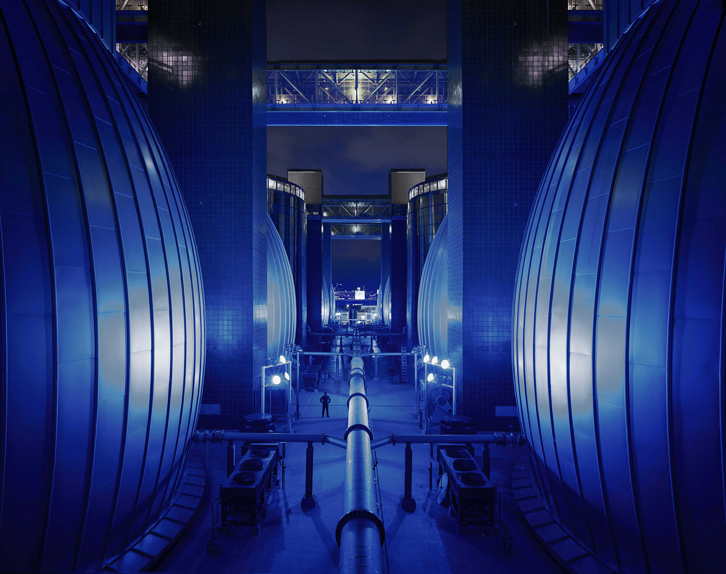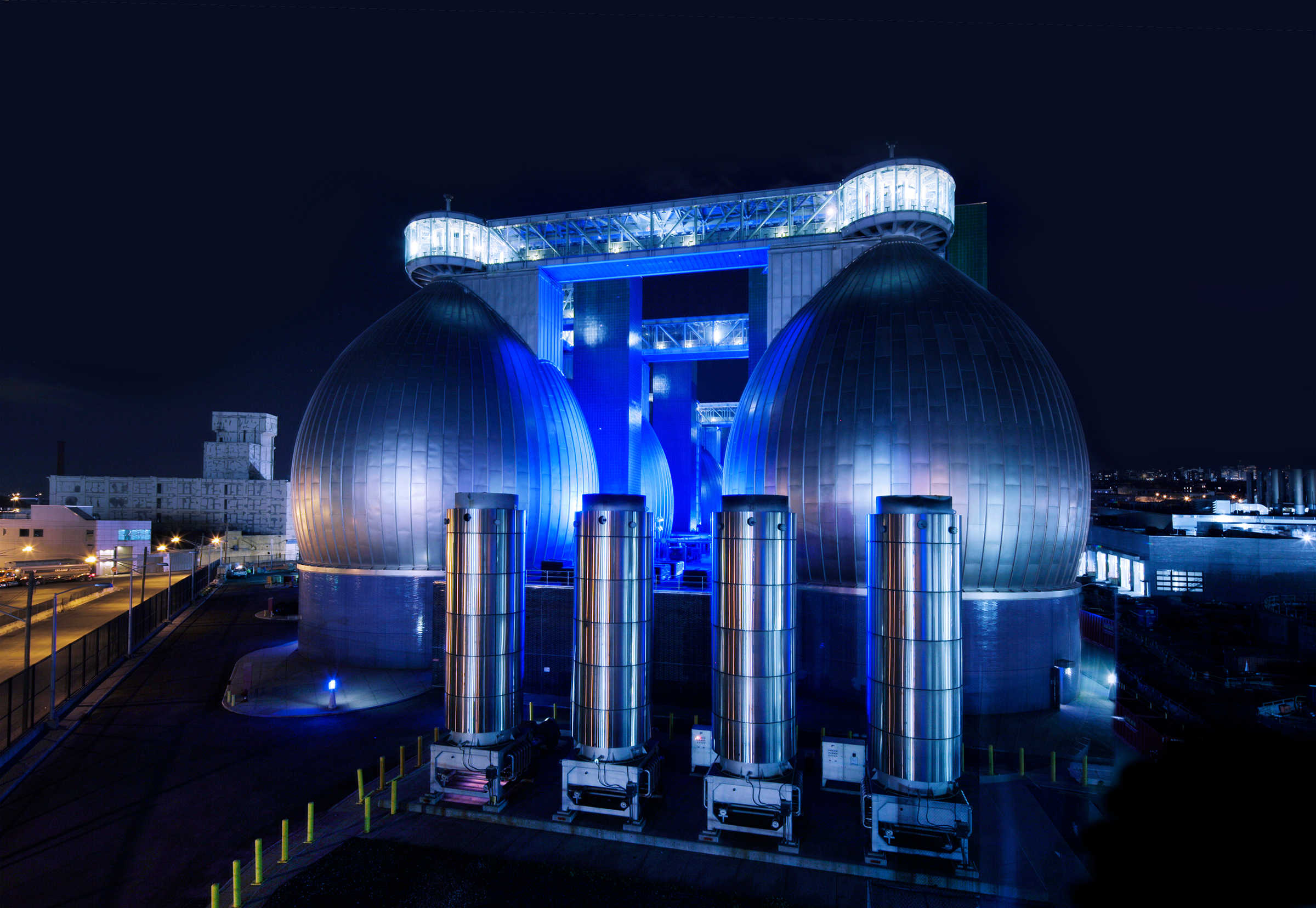 L'Observatoire International developed the lighting masterplan for the fifty-two acre site. A diaphanous layer of blue light visually unifies the water treatment plant, contrasting it with the bright orange lights of the surrounding city. The light forms a blue veil covering all of the varied structures that comprise the plant. This luminous membrane serves as a protective layer, defining the extent of the site, while also serving as a canvas for the bright white lights that define the plant’s various functions. The lighting design takes into consideration all of the technical requirements for nightshift work while being careful to avoid light pollution from both an ecological and a neighborly standpoint.