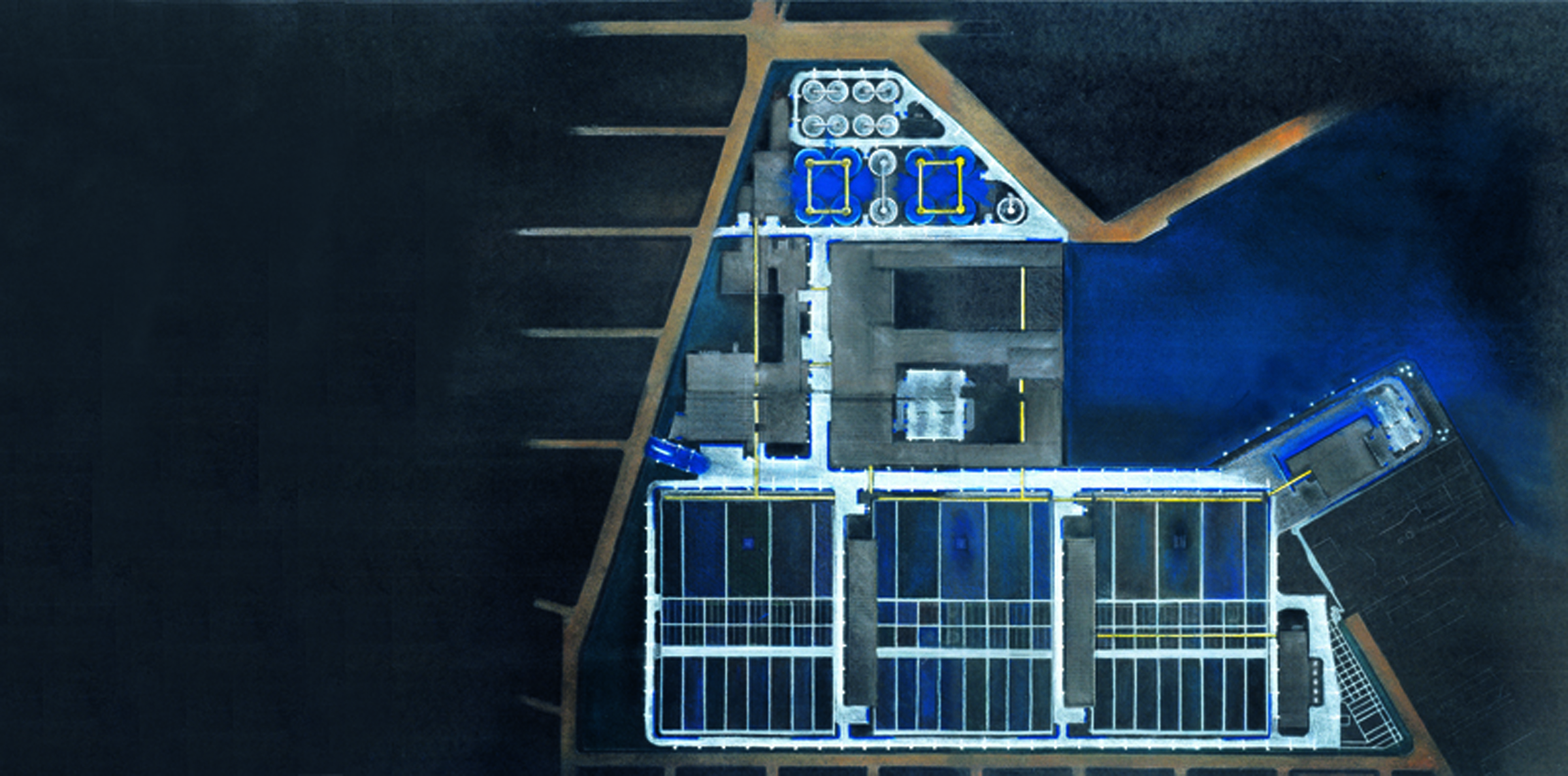 L'Observatoire International developed the lighting masterplan for the fifty-two acre site. A diaphanous layer of blue light visually unifies the water treatment plant, contrasting it with the bright orange lights of the surrounding city. The light forms a blue veil covering all of the varied structures that comprise the plant. This luminous membrane serves as a protective layer, defining the extent of the site, while also serving as a canvas for the bright white lights that define the plant’s various functions. The lighting design takes into consideration all of the technical requirements for nightshift work while being careful to avoid light pollution from both an ecological and a neighborly standpoint.
