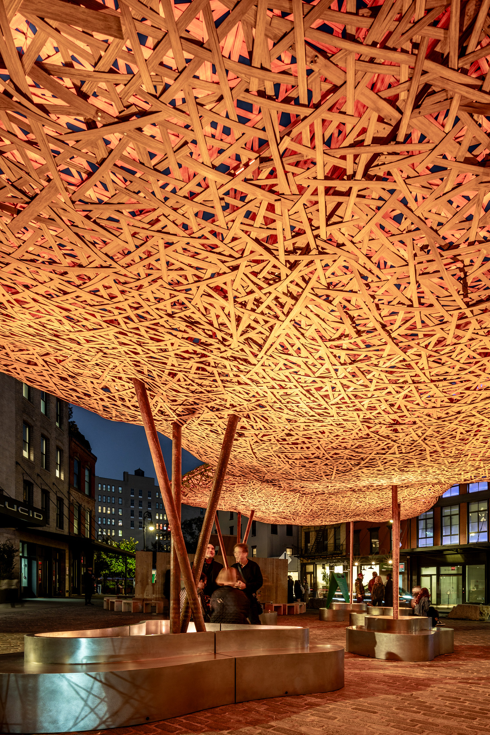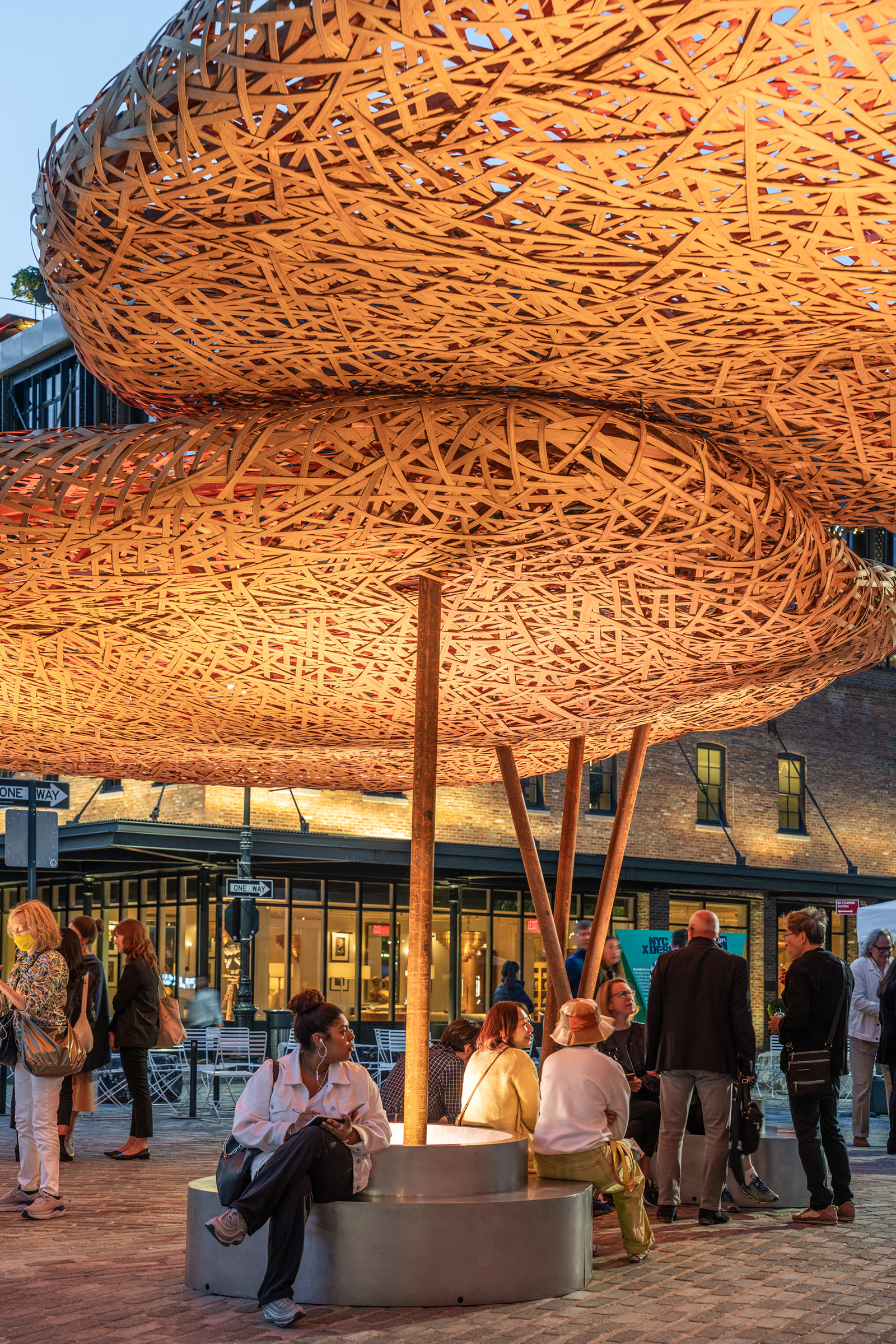 Woven through methods similar to basket weaving, Bamboo Cloud’s overall construction and creativity breaks with convention. Bamboo Cloud, will hover over the Pier’s promenade, a porous volume made of woven bamboo strips, naturally finding its form through resiliency of the material.