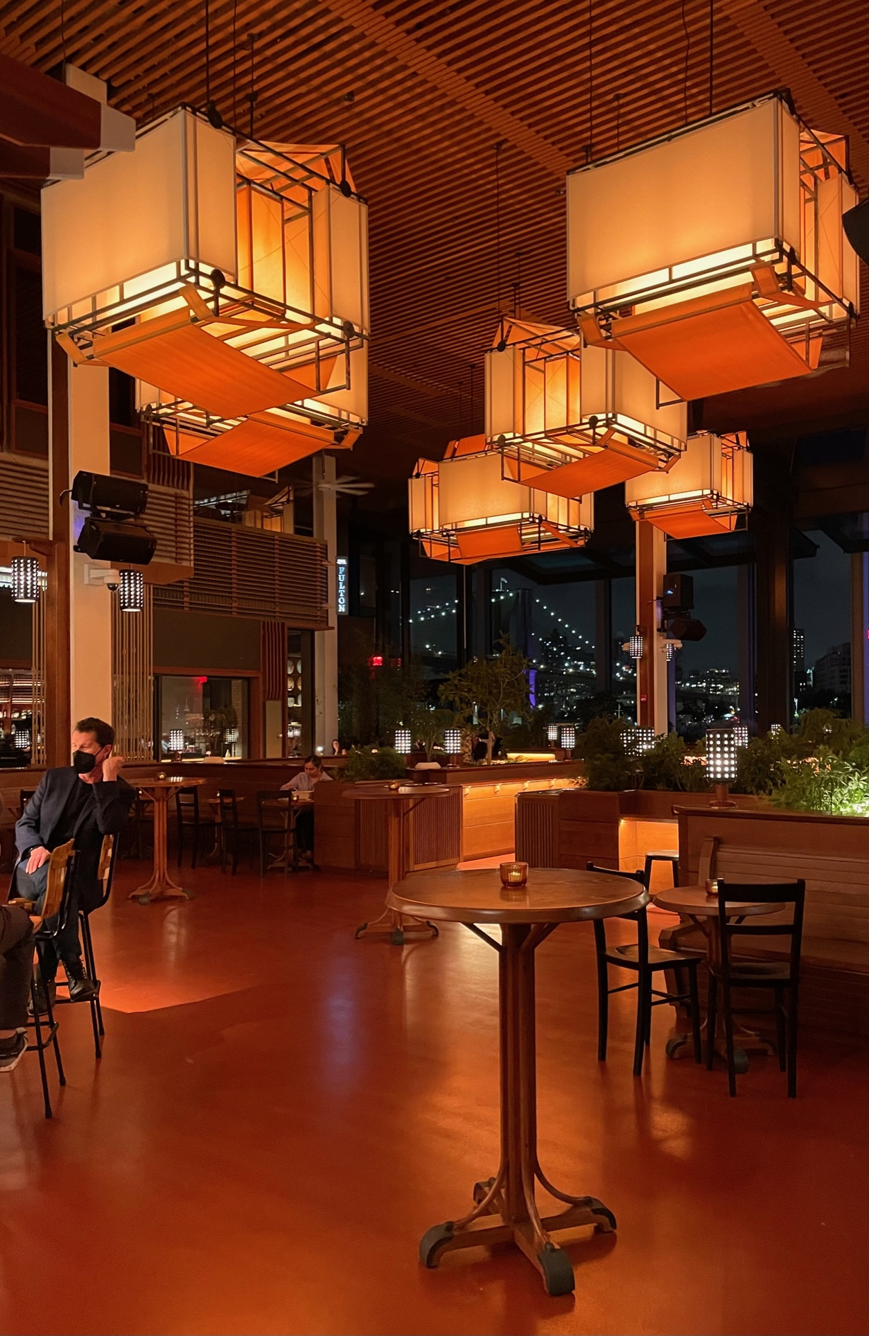 L'Observatoire International collaborated with architecture firm Roman and Williams to design a space that is welcoming and convivial while also complementary to the scale of the pier and the grandiosity of the view.