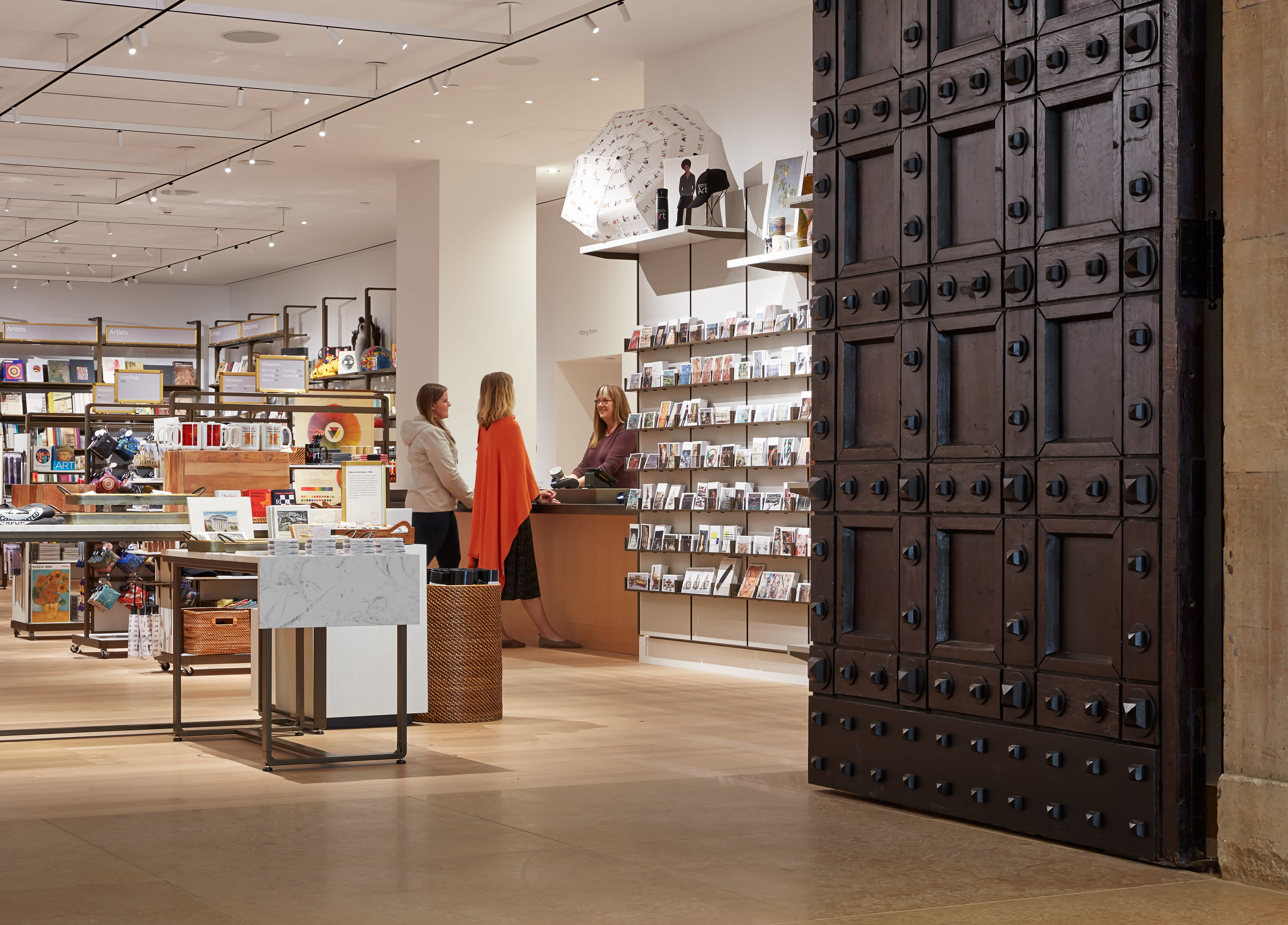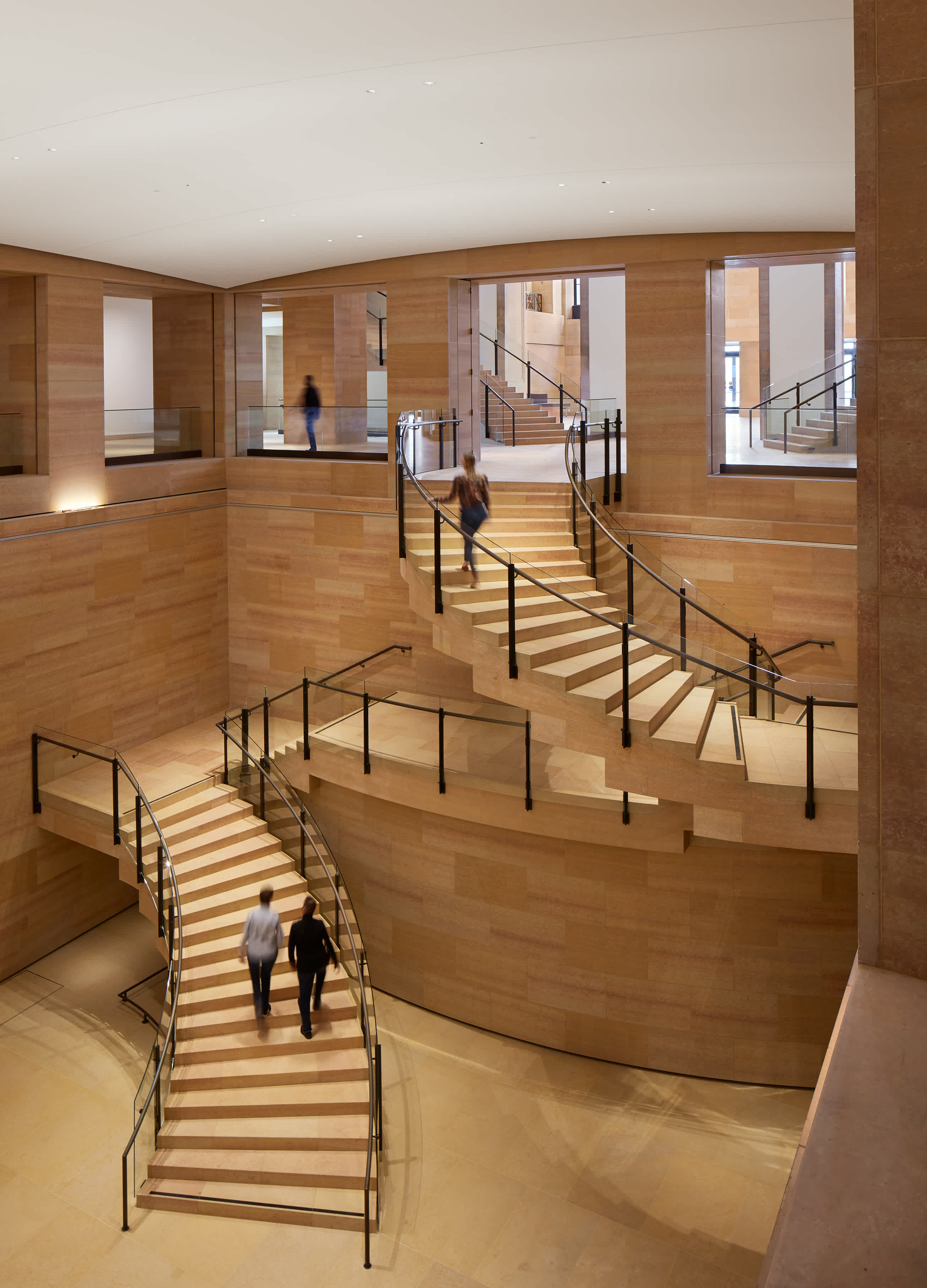 The Vaulted Walkway connects to the new Williams Forum, a grand triple height space that can be used for large scale works. Embedded into the double-sided curved ceiling are pinhole downlights and power points allowing for attachment of temporary art accent lighting to provide lighting flexibility for a range of possible installation types, while maintaining a clean ceiling surface. The curved ceiling itself is uplit by lighting fixtures carefully integrated at the Forum Gallery columns below. With the asymmetrical beam, the ceiling is lifted with an even glow. In the adjacent Forum Gallery, the downlight grid aligns with the original columns of the space, maintaining its classical symmetry. The Forum is anchored by a sculptural staircase, the expressive curving lines of which are highlighted through carefully aimed downlighting. The stairs lead to the ground level of the museum, where areas once used for the museum’s offices, retail and restaurant have been transformed into two wings of galleries.
