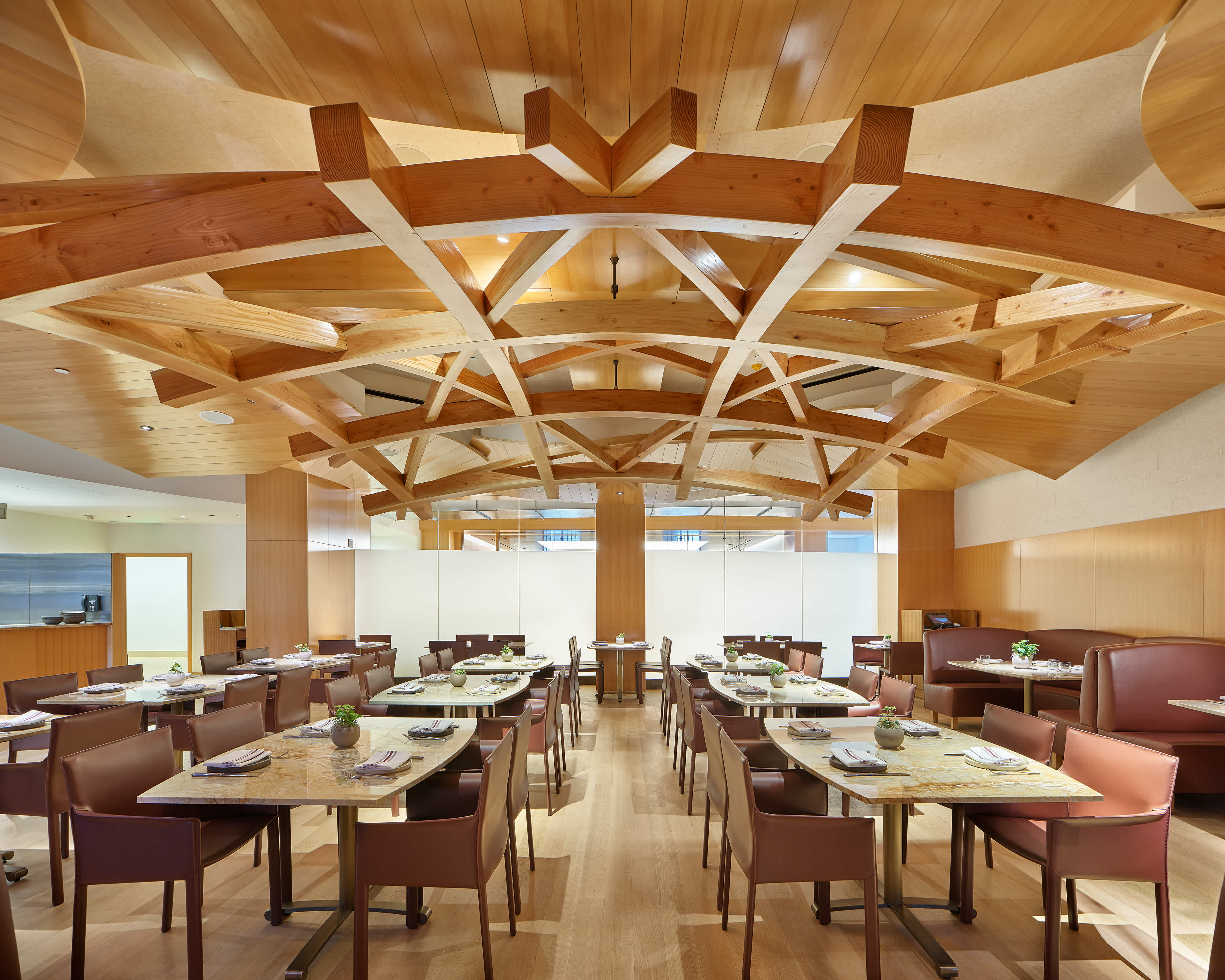 The renovation also includes a redesigned Lenfest Hall, previously the principal entrance to the building. The previously dark space is now filled with daylight, and further illuminated by a modern coffered ceiling. A combination of both warm and cool lighting is integrated into the three-tiered coves—cool lighting enhances natural light levels during the day, while the warm color temperature matches the limestone walls and washes the space in soft light in the evening.