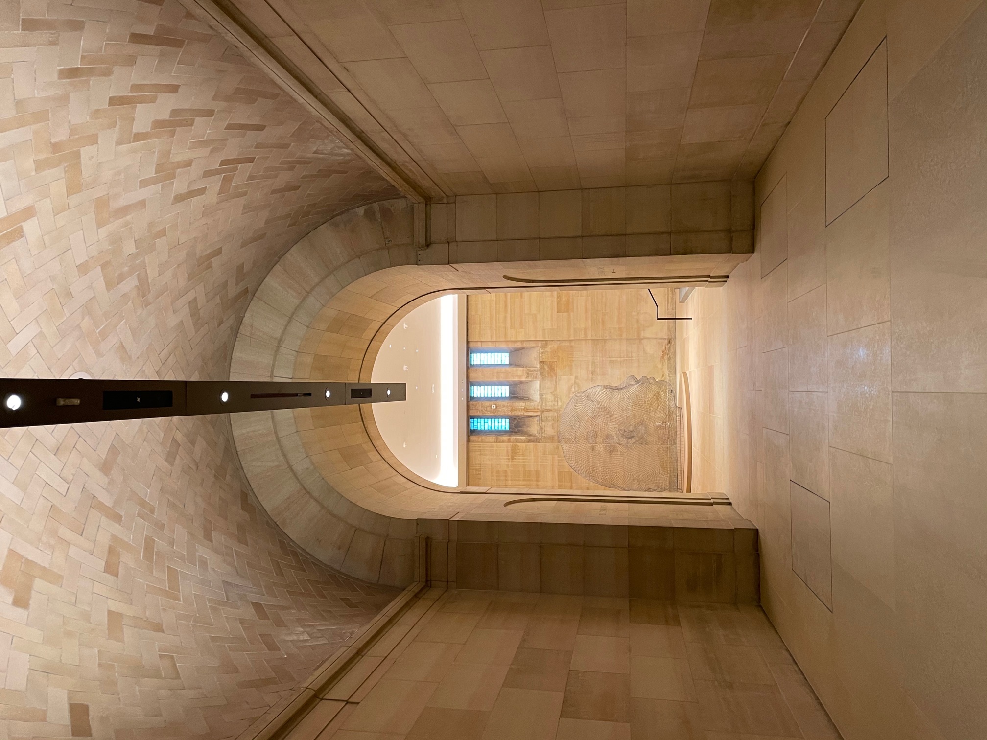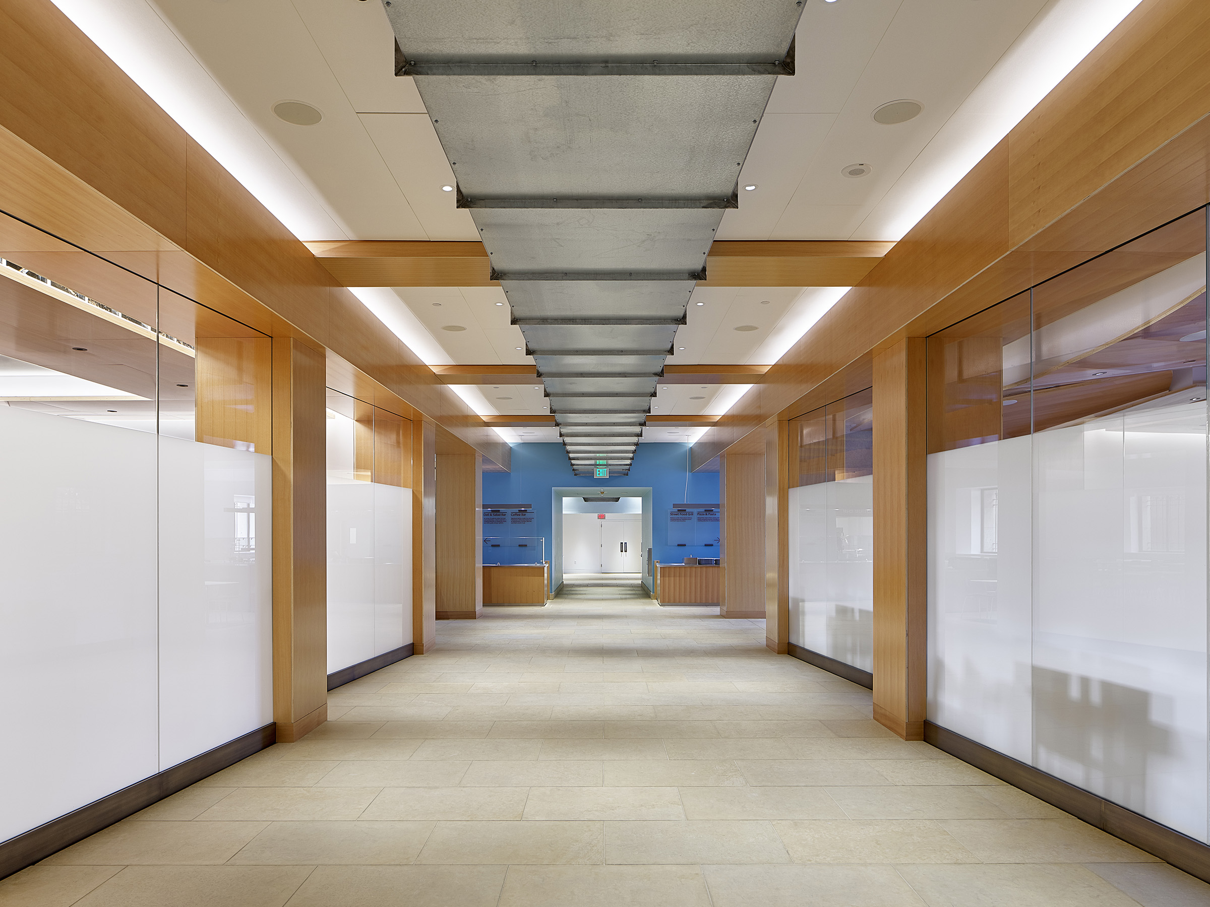 From the museum’s new North and South entrances, the Vaulted Walkway guides visitors toward the center of the building. Suspended from the arched ceilings of the space is a custom-designed Light Bar, a linear element which is strikingly minimal, yet integrates all lighting for the space, as well as all the state-of-the-art technological equipment such as speakers and fire detectors, for the hall to offer maximum flexibility of use. Uplights accentuate the remarkable herringbone pattern of the tiled vaults, while downlights guide visitors through the 640-foot-long corridor. Between the downlights, track lights can be inserted for highlighting of art.