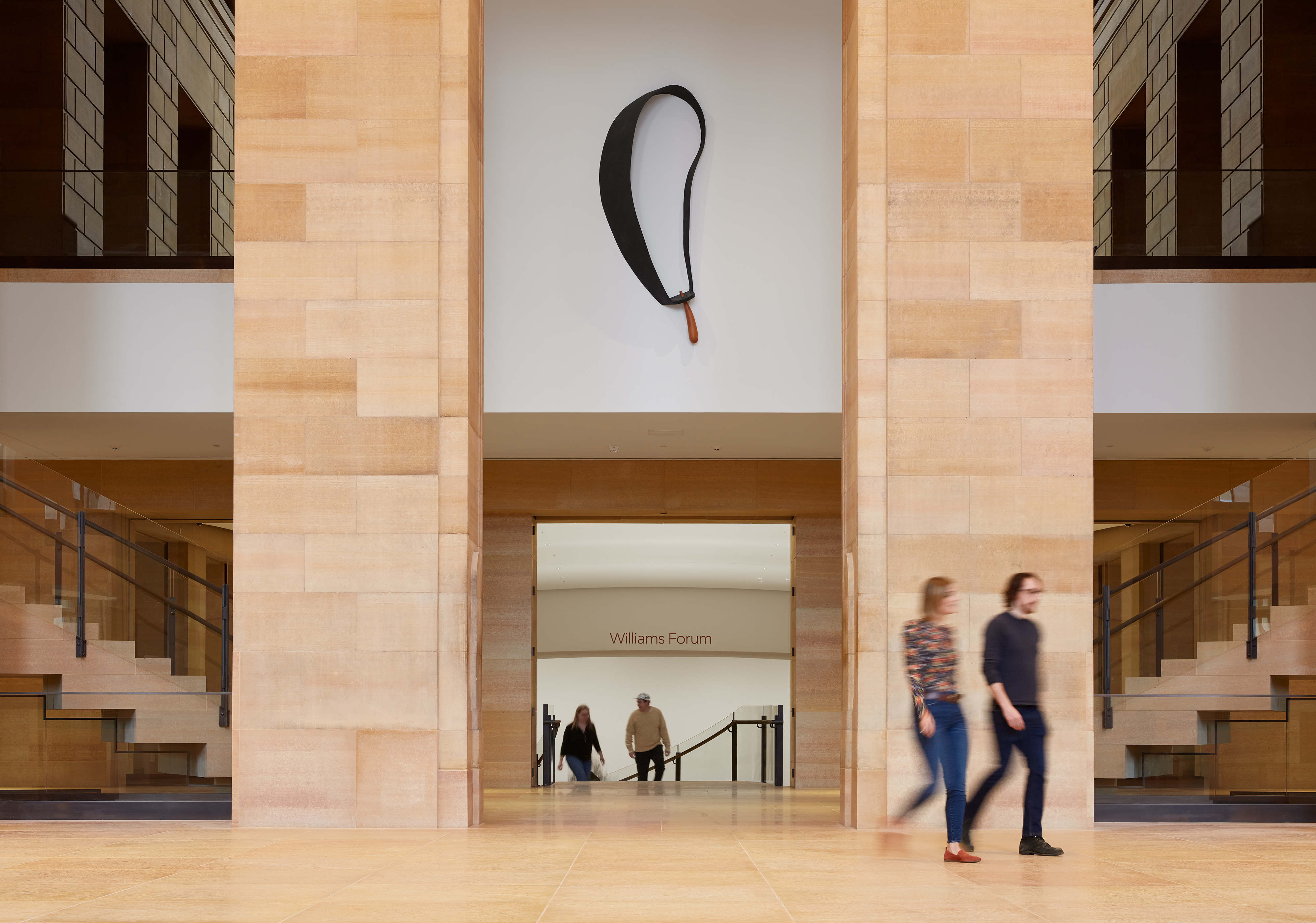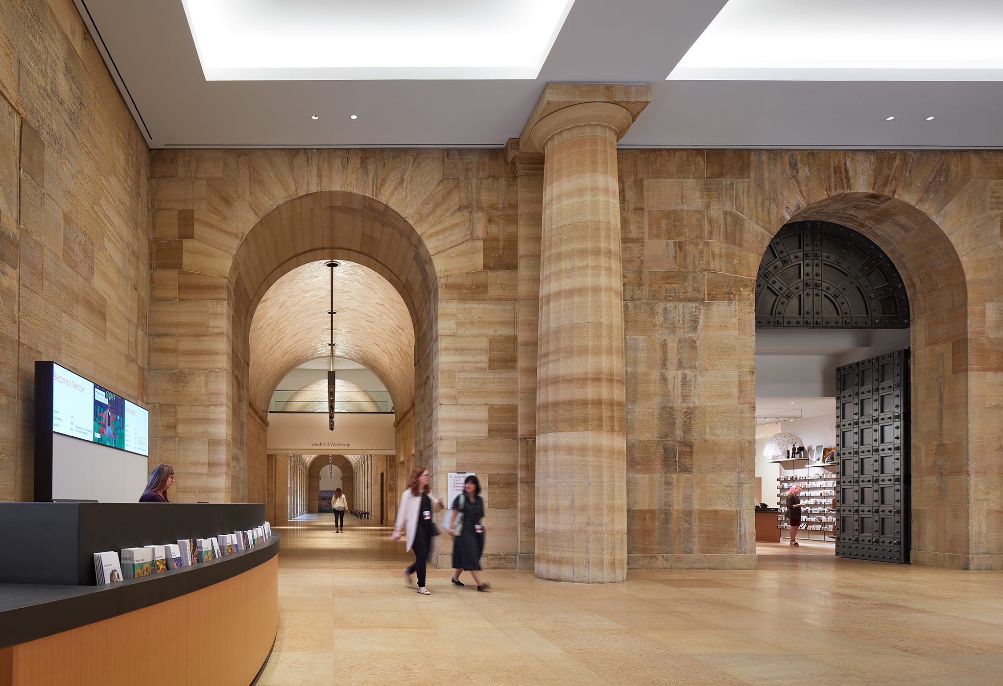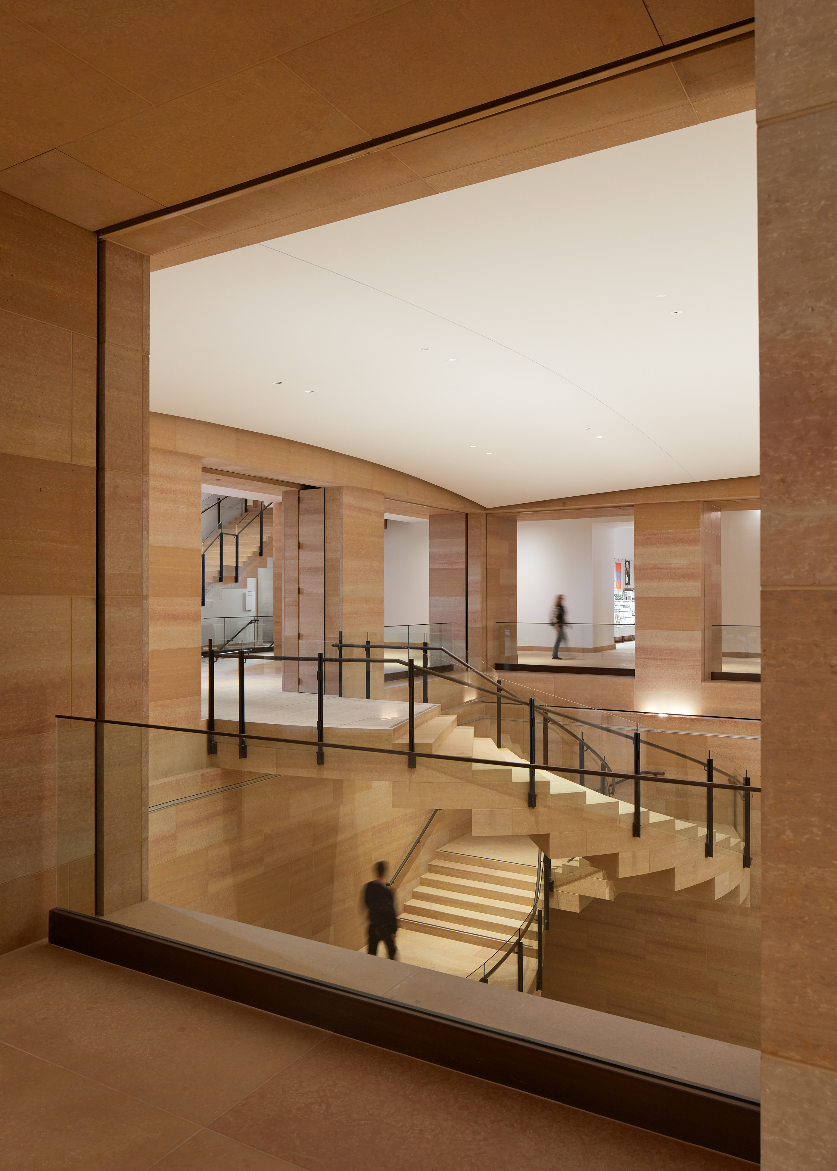 The Vaulted Walkway connects to the new Williams Forum, a grand triple height space that can be used for large scale works. Embedded into the double-sided curved ceiling are pinhole downlights and power points allowing for attachment of temporary art accent lighting to provide lighting flexibility for a range of possible installation types, while maintaining a clean ceiling surface. The curved ceiling itself is uplit by lighting fixtures carefully integrated at the Forum Gallery columns below. With the asymmetrical beam, the ceiling is lifted with an even glow. In the adjacent Forum Gallery, the downlight grid aligns with the original columns of the space, maintaining its classical symmetry. The Forum is anchored by a sculptural staircase, the expressive curving lines of which are highlighted through carefully aimed downlighting. The stairs lead to the ground level of the museum, where areas once used for the museum’s offices, retail and restaurant have been transformed into two wings of galleries.
