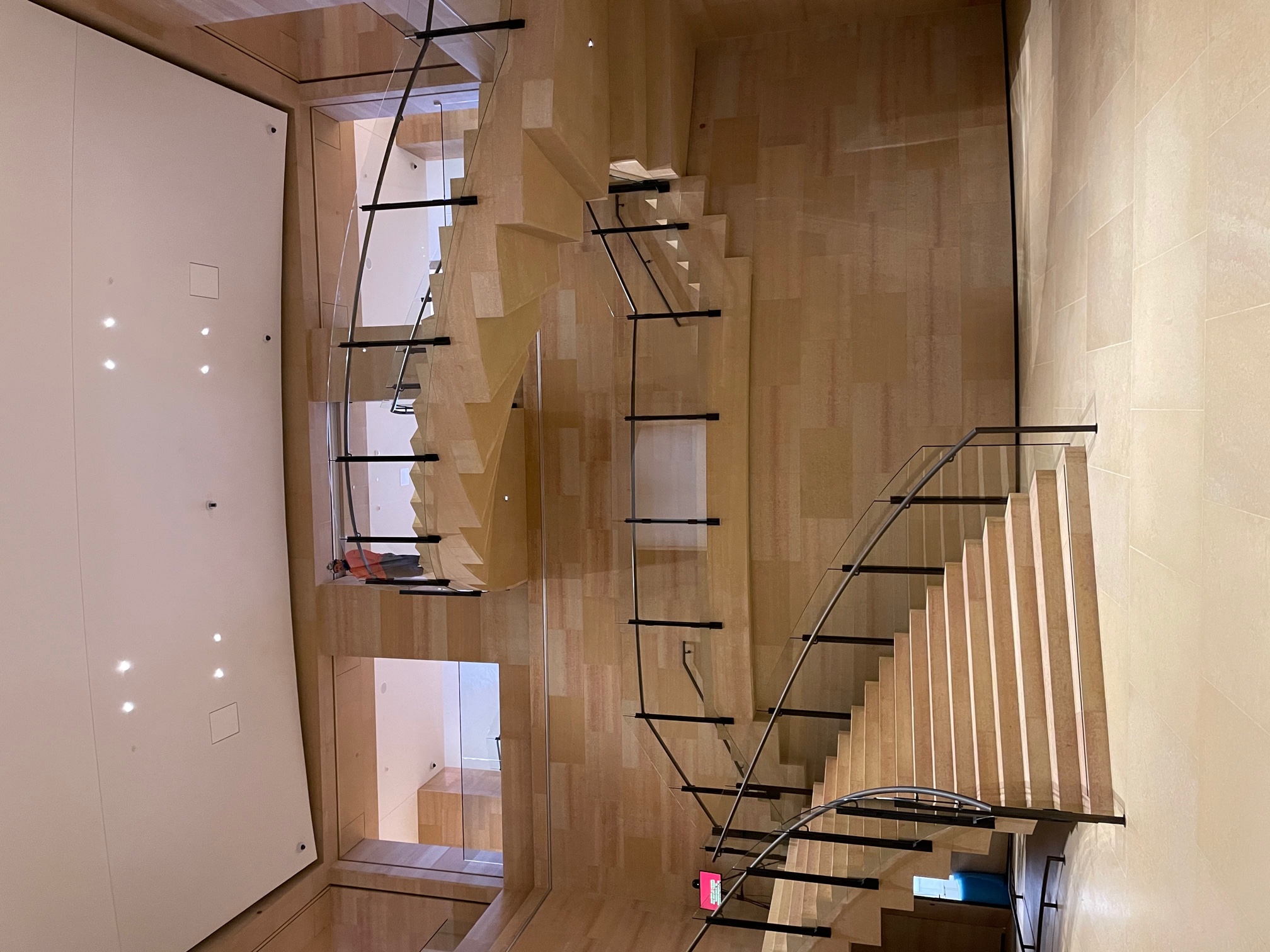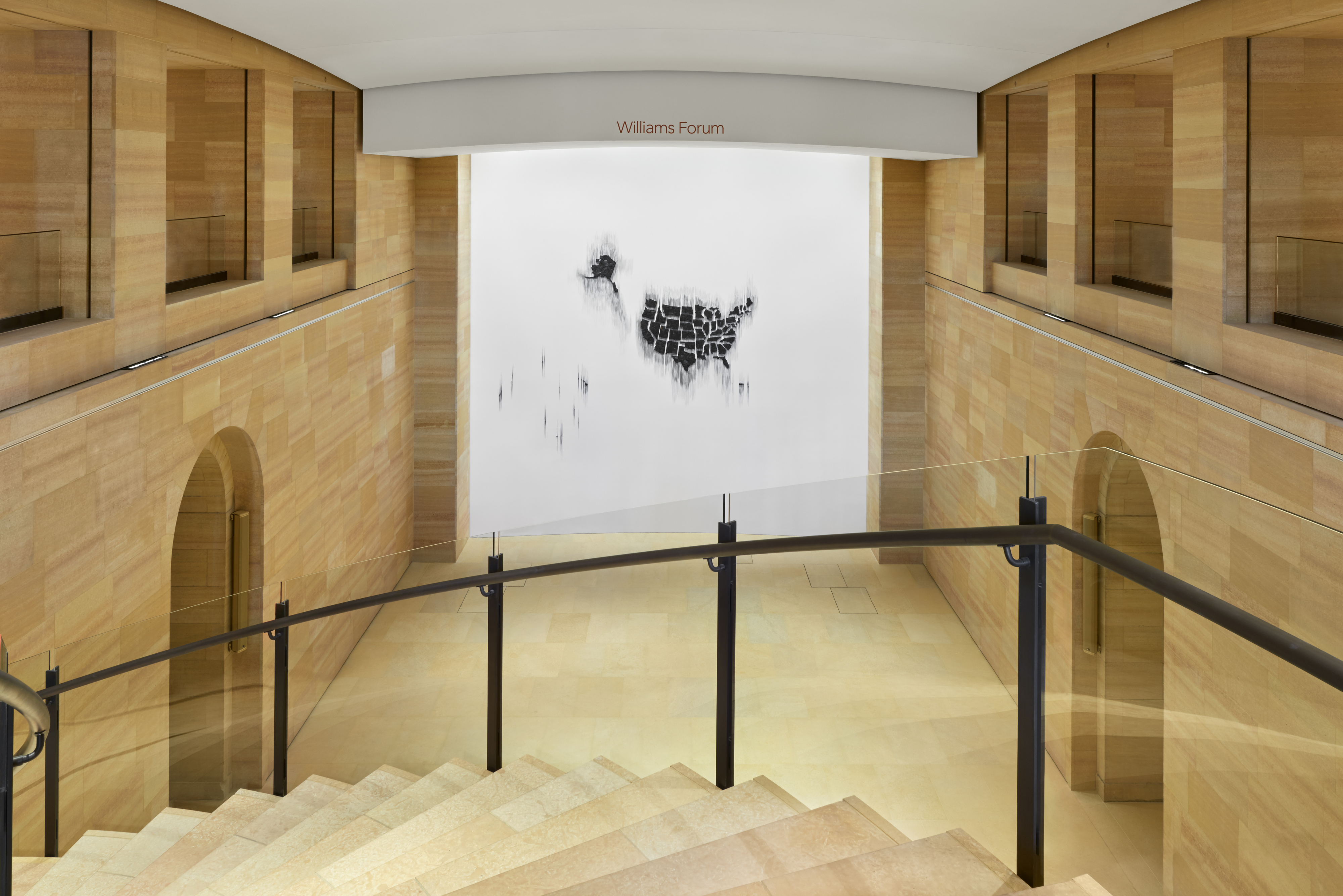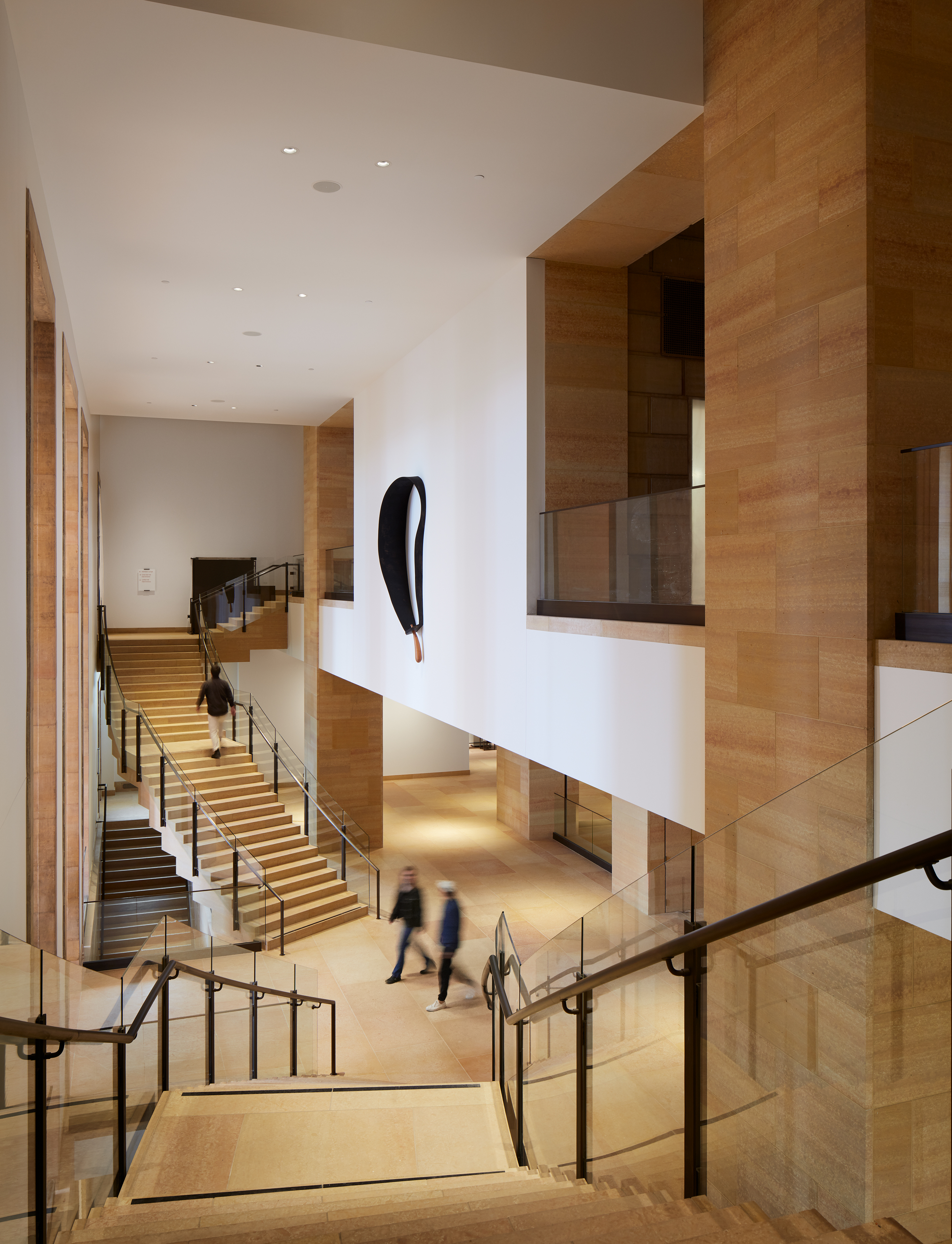 The Vaulted Walkway connects to the new Williams Forum, a grand triple height space that can be used for large scale works. Embedded into the double-sided curved ceiling are pinhole downlights and power points allowing for attachment of temporary art accent lighting to provide lighting flexibility for a range of possible installation types, while maintaining a clean ceiling surface. The curved ceiling itself is uplit by lighting fixtures carefully integrated at the Forum Gallery columns below. With the asymmetrical beam, the ceiling is lifted with an even glow. In the adjacent Forum Gallery, the downlight grid aligns with the original columns of the space, maintaining its classical symmetry. The Forum is anchored by a sculptural staircase, the expressive curving lines of which are highlighted through carefully aimed downlighting. The stairs lead to the ground level of the museum, where areas once used for the museum’s offices, retail and restaurant have been transformed into two wings of galleries.