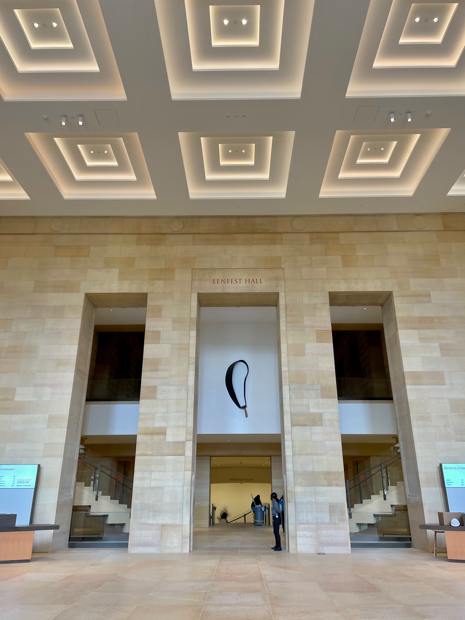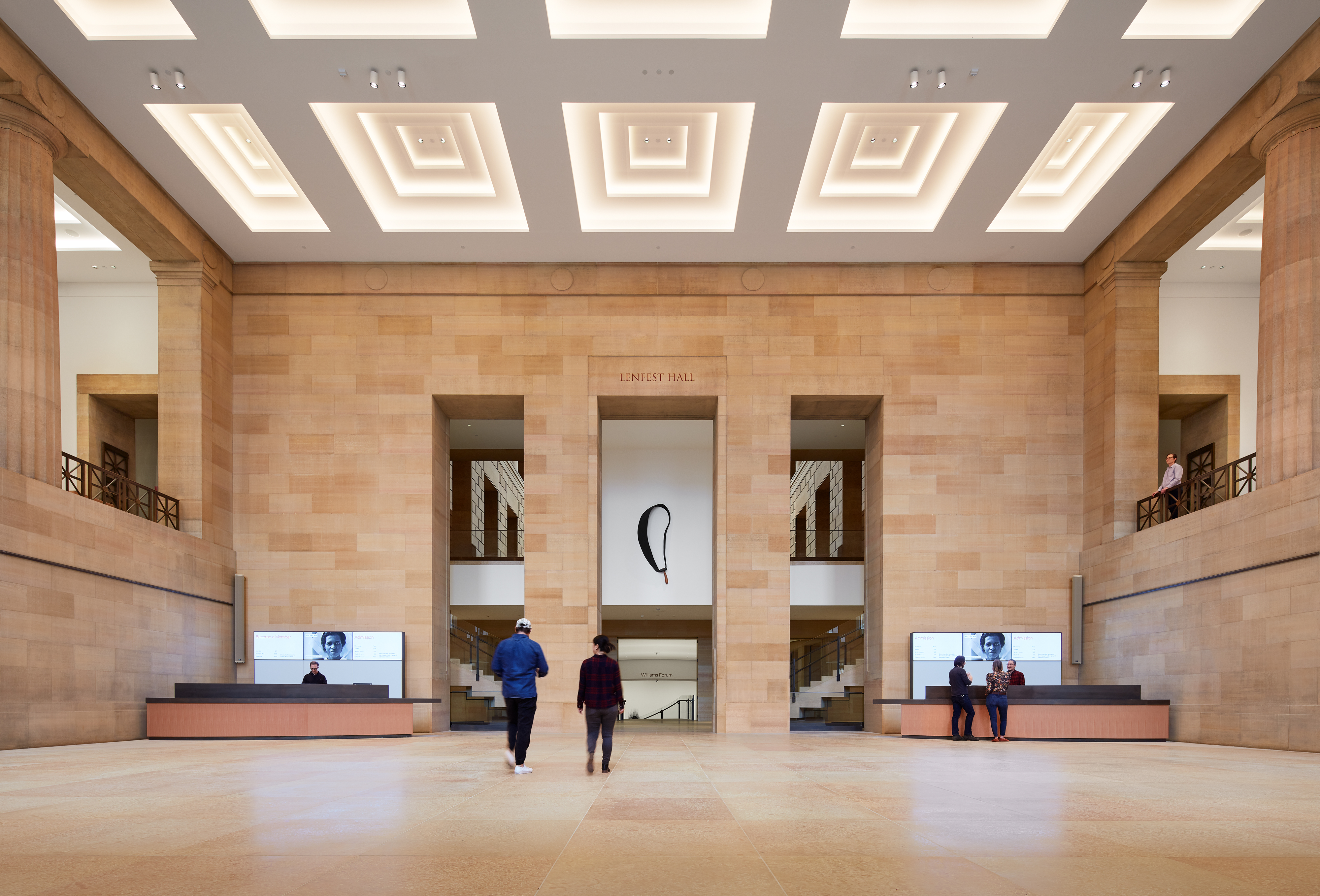 The renovation also includes a redesigned Lenfest Hall, previously the principal entrance to the building. The previously dark space is now filled with daylight, and further illuminated by a modern coffered ceiling. A combination of both warm and cool lighting is integrated into the three-tiered coves—cool lighting enhances natural light levels during the day, while the warm color temperature matches the limestone walls and washes the space in soft light in the evening.