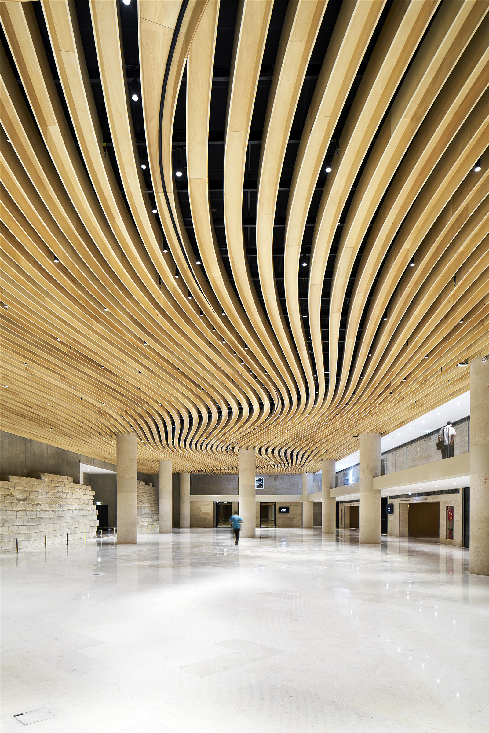 The ambition of manager Viparis was to create a new space and to revalorize an extraordinary volume, until now cut by a large mezzanine and a monumental staircase blocking its perspective. The project goes back to sobriety with a new volume of 1,300 m² and 5 meters under ceiling which also reveals the wall built under Charles V in the 14th century. A new sculptural ceiling made up of 1,100 pieces of wood hand-built and assembled comes to dress the space, giving it a new strong identity.