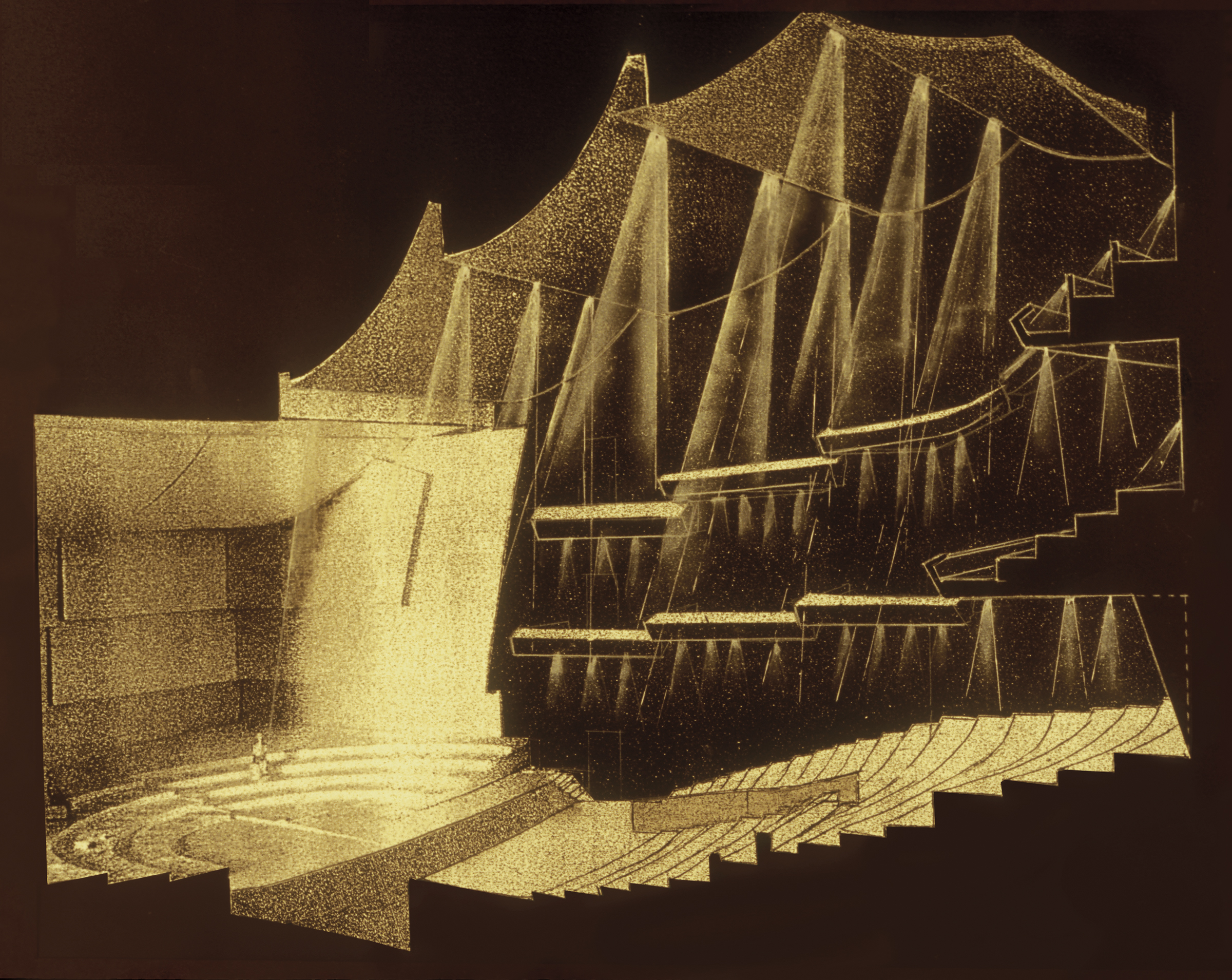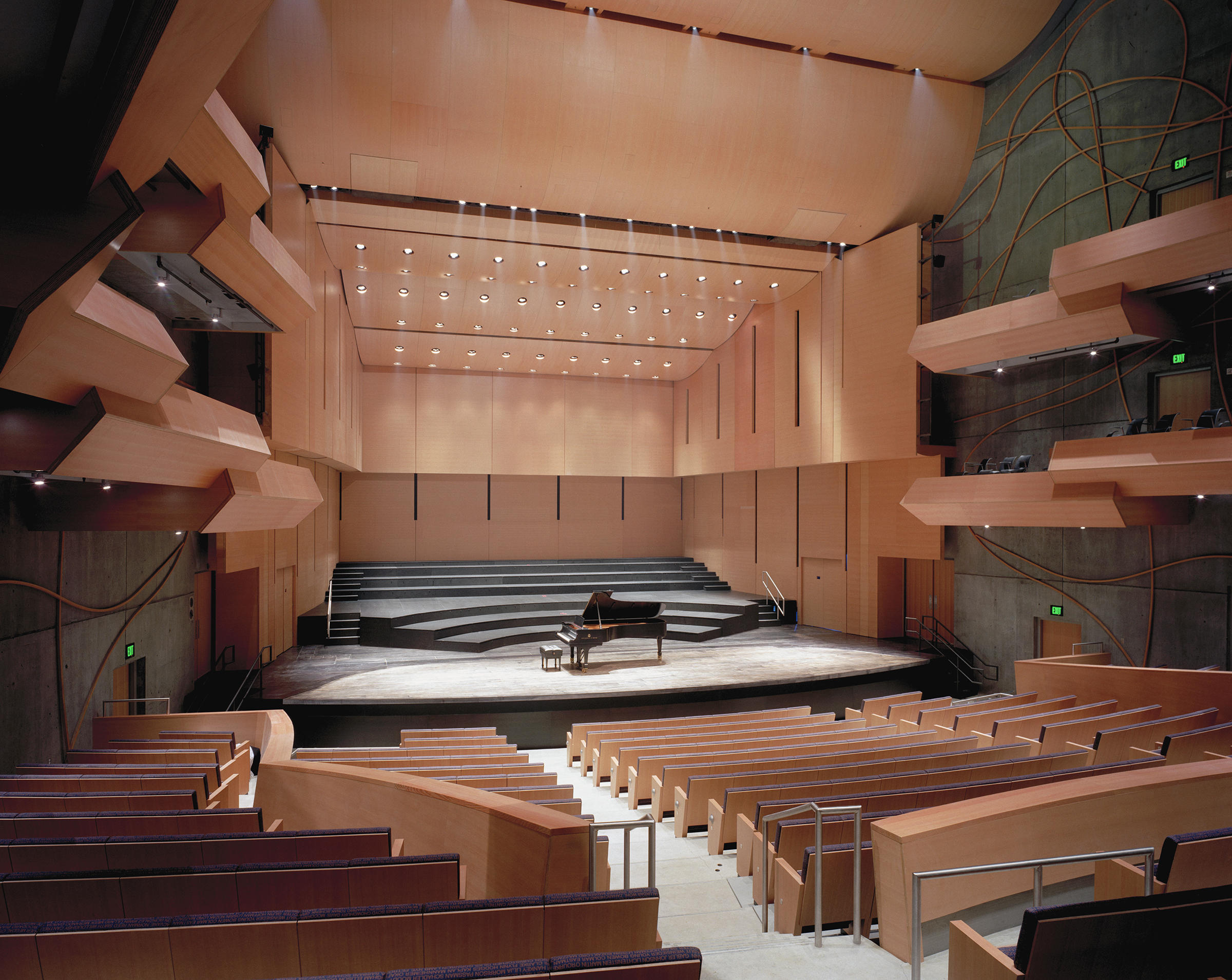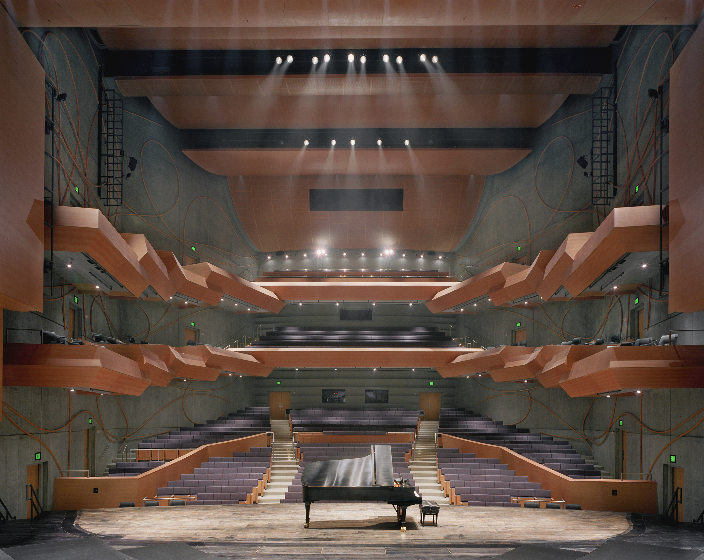 The lighting principles direct a visual progression of experiences with the building, from afar as an object to inside the building, where the complexity of the structural form and its textures are revealed. The lighting treatments respond to the form, direction, and texture of the architectural plane. Sources of illumination are concealed within, behind, and above the architectural framework to express the intrinsic melody of space and reveal its form. The Main Lobby functions as the primary visual reference point of the building and locates it upon the campus geography. The Balcony combines both direct and diffused light. The ceiling is uplit and acts as the primary source of illumination for the space. A series of downlights are placed to communicate a rhythm and contrast the dominant glowing surfaces. The Main Hall presents a more complex system of fragmentation by examining an interplay of vertical and horizontal glowing surfaces presented through a hierarchy of brightness.
