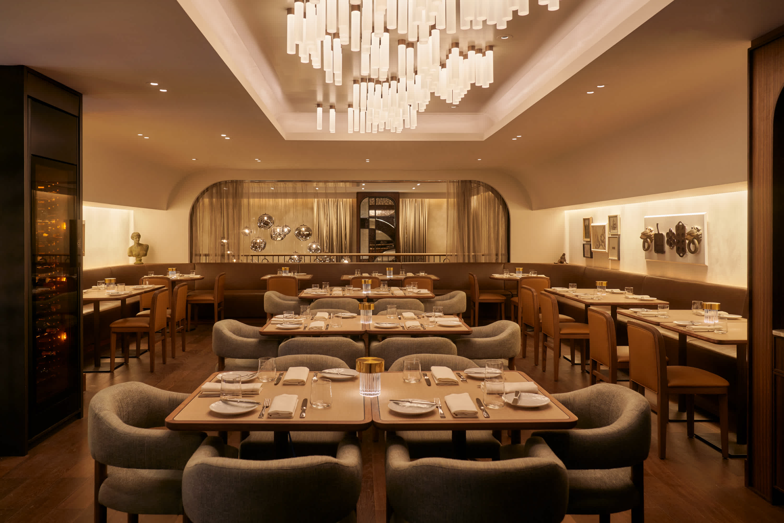 Chef Michael White with BBianco Hospitality and Tishman Speyer opens Santi in Midtown New York. The restaurant unfolds across three interconnected dining areas adorned with unique artwork where every corner tells a story of Italian flavors and contemporary elegance. The contemporary space, designed by Michaelis Boyd in collaboration with L’Observatoire International, opens with a glowing grand horseshoe bar as guests arrive. The bar greets guests at the entrance with a dramatic yellow onyx that glows from within to anchor the tall double height space. The intimate staircase leads guests from the den up to an intimate mezzanine dining room that overlooks the bar and atrium dining room. Sheer curtains drape from the ceiling, gently softening the space, while a custom hand-blown glass light pendant serves as the centerpiece of the space. The private dining room has soft integrated lighting to define the perimeter of the space to accentuate the materiality and warmth of the room.